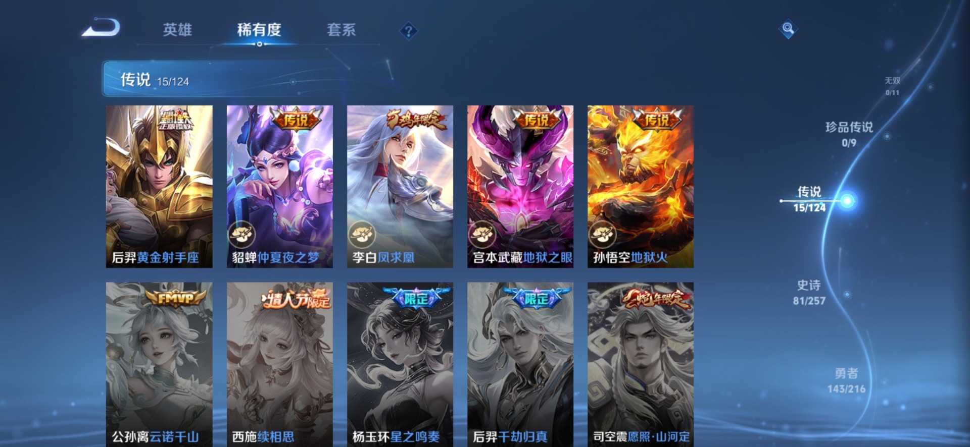 夏侯惇朔风刀,老夫子醍醐杖,沈梦溪大漠名商,盾山御銮,苏烈千军破阵,典韦蓝屏警告,达摩沙漠行僧,牛魔御旌,项羽苍威无极,鲁班七号狮舞东方,吕布猎兽之王,镜青焰无极,元歌云间偶戏,兰陵王金庭之子,裴擒虎擒涛扼浪,鲁班大师探海日志,明世隐疑决卦,蒙犽狂想玩偶喵,鬼谷子原初探秘者,张良古海寻踪,女娲朔望之晖,桑启海盐诗旅,狄仁杰万华元夜,程咬金演武夺筹,李元芳云中旅人,弈星混沌棋,米莱狄御霄,钟馗神迹守卫,钟馗驱傩正仪