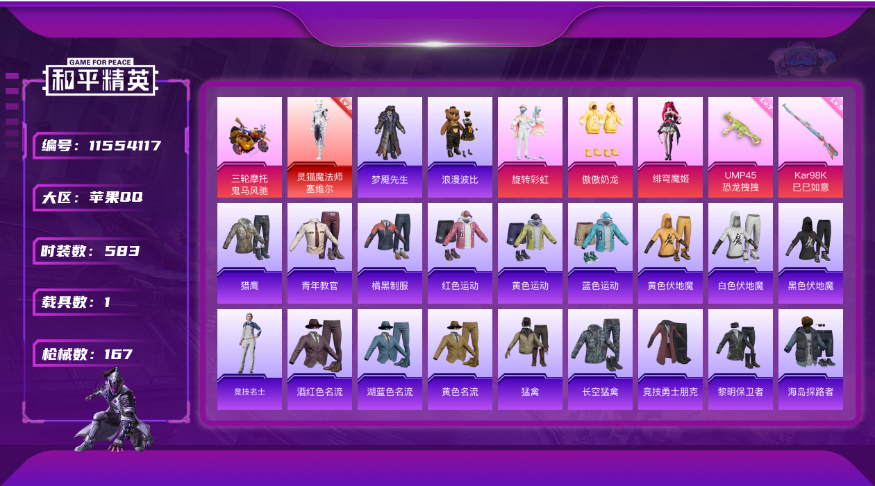 [11554117]1红装 3粉装 2特效枪 1载具 2印记 可二次 可修改实名 二级神装:二级灵猫魔法师-塞维尔 热门装扮:绯穹魔姬,旋转彩虹,傲傲奶龙,梦魇先生,浪漫波比 载具:鬼马风驰 稀有枪皮:Kar98K-巳巳如意,UMP45恐龙拽拽 神级装扮:灵猫魔法师-塞维尔 七级特效枪:七级UMP45-恐龙拽拽 五级特效枪:五级Kar98K-巳巳如意 紫色装扮:田园牧歌,轻风白浪,SS22特训,萌趣咩咩,SS20特训,SS21特训,娇憨猪猪,人气偶像,SS23特训,霓虹热舞,SS31特训套装,云朵鹅,彩虹兔,雪绒豹,SS33特训套装,青涩时光,旭日情侣,顶瓜瓜,星梦畅游,星河入梦,潮流游乐家,SS15特训,赛罗奥特曼,银白舞王,SS14特训,诡谋托雷基亚,治愈之星,科技之星,飞驰魅影,SS18特训,音速流光,SS19特训,冰川特警,异彩先驱,遗落祭司,明日香款战斗服,瑞龙福将,团圆交子,SS17特训,蓝色运动,虎虎生威吉莉,街头潮人,蓝彩潮人,酒红色名流,酷潮明星,荷畔雨呱,空投萌叽,竞技勇士朋克,竞技达人朋克,糯粉咩咩,红色运动,绮丽涂鸦,缤纷假日,缤纷果语,长空猛禽,雪山精英,霓虹极客,霓虹街区,青年教官,龙的传人,魅力单车,麻辣教官,黄色伏地魔,黄色名流,黄色运动,黎明保卫者,黑色伏地魔,福星高照,神秘领域,战地督导,战地菁英,极地朋克,柠萌假日,格斗先锋,橘黑制服,沙漠毒蛇,冷焰舞者,北国孤狼,坚韧舞者,夏日音浪,完美偶像,帅气教官,幻世战舞者,幻影武者,特殊使命,特训学院,猎鹰,猛禽,王牌教练,白色伏地魔,破晓战魂,破蛋小黄鸡,海岛探路者,深蓝色名流,清新柠檬,湖蓝色名流,滨海假日,滨海厨神,牛气满满,灼焰舞者,炫蓝之夏,热血骑手,牛气冲天,燕燕于飞,俏兔智灵,异域银装,鱼渊荷华,玉兔迎春,巳巳如意,竞技名士,SS25特训,Alan Walker,超人强,逆风勇士,炽焰拳师,格斗专家,SS6特训,闪耀星光,黑色刀锋,精神漫游,核芯基因,SS7特训,人鱼之吻,SS11特训,耀粉歌者,粉甜马卡龙,大橘大利,原初圣火,深蓝冒险家,迷域探索者,SS8特训,SS32特训服(SS32特训套装),糯粉咪咪(套装-糯粉咩咩),瑰梦爱神,智谋强哥,白糯汤圆,萌黄之夏,丛林猎人,传奇侦探,青羽突袭者,SS12特训 优质战备:华贵君王降落伞,绯穹魔姬降落伞,灵猫魔法师降落伞,冷漠罗丽降落伞,时光之