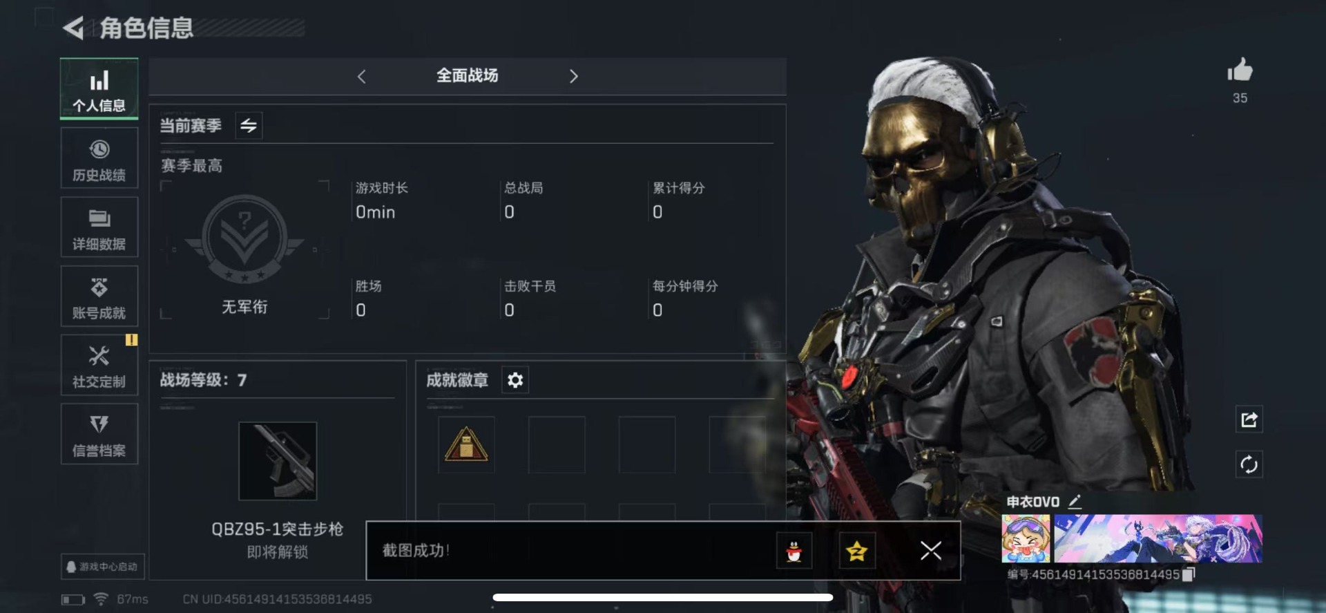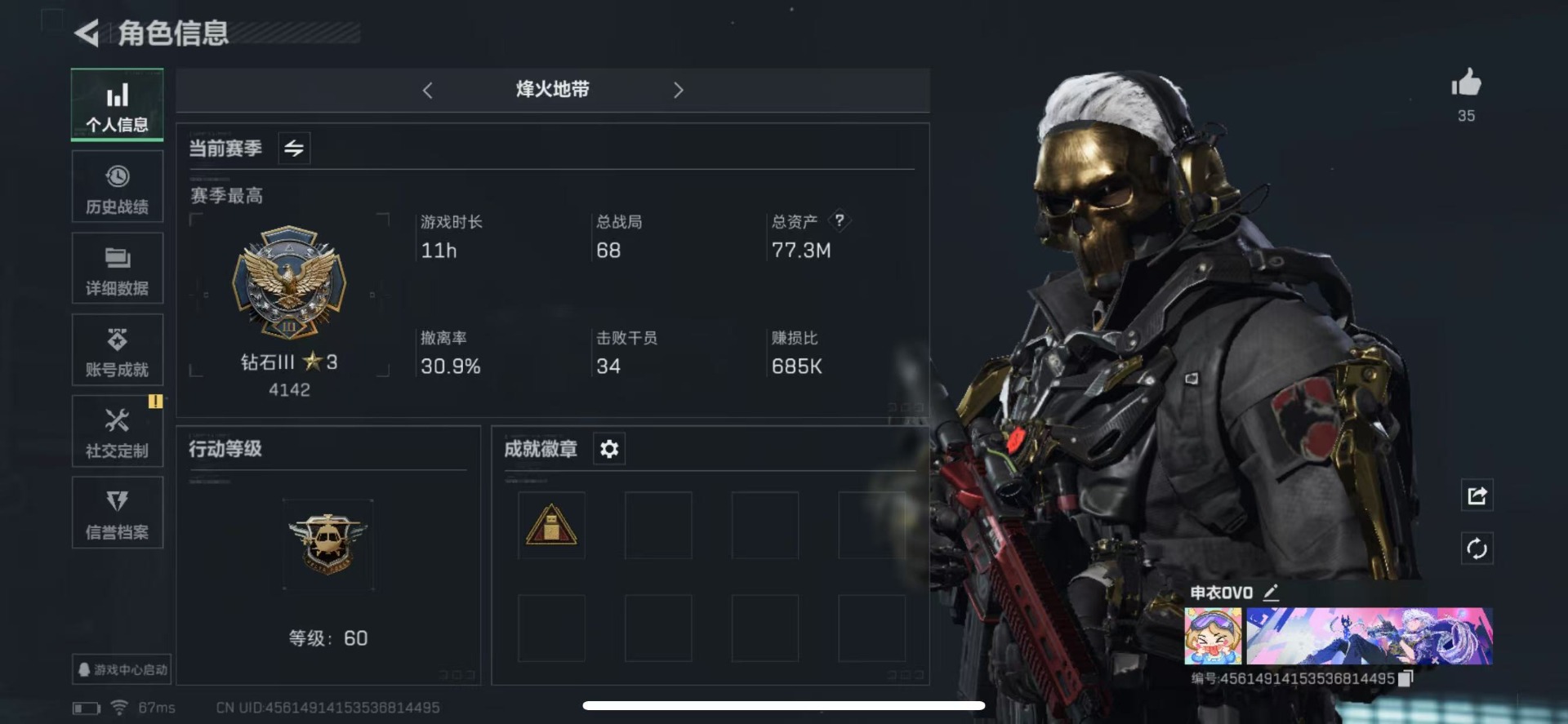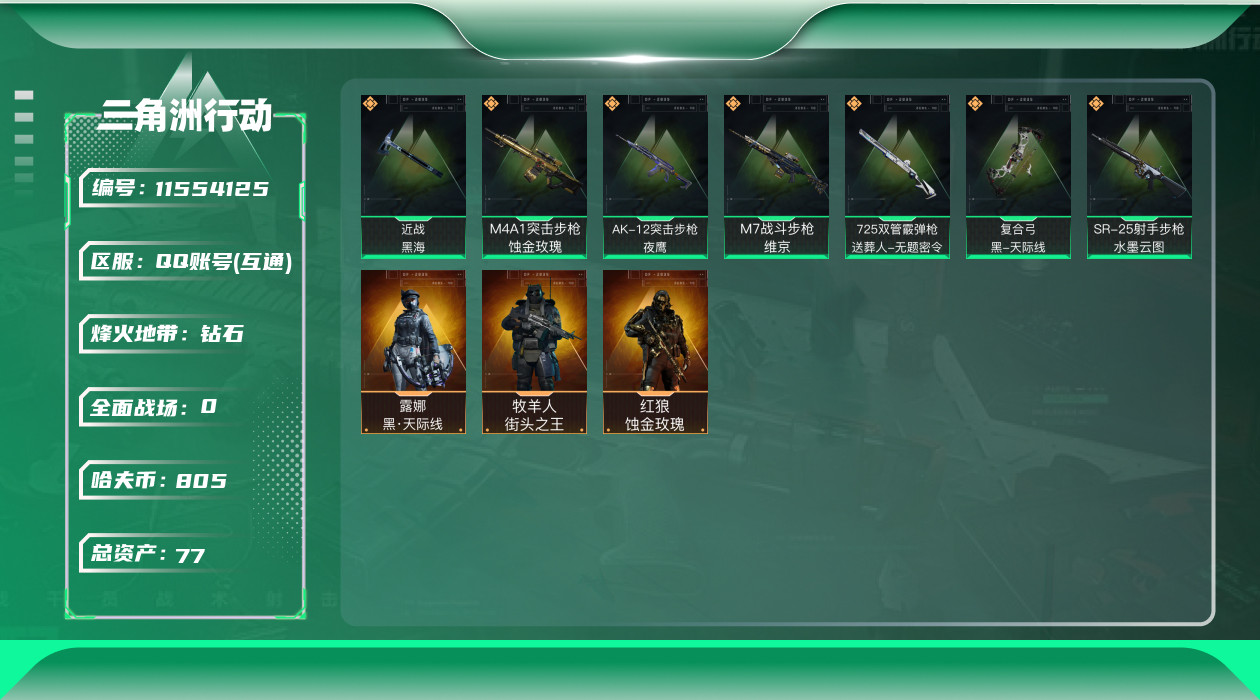 [11554125]可二次 可修改实名 实名:可修改 高级安全箱(9.17到期) 烽火地带段位:钻石 全面战场段位:无段位 总资产:77.3 哈夫币:805.272 传说武器皮肤:近战-黑海,SR-25射手步枪-水墨云图,AK-12突击步枪-夜鹰,复合弓-黑-天际线,725双管霰弹枪-送葬人-无题密令,M7战斗步枪-维京,M4A1突击步枪-蚀金玫瑰 干员外观:红狼-蚀金玫瑰,牧羊人-街头之王,露娜-黑·天际线