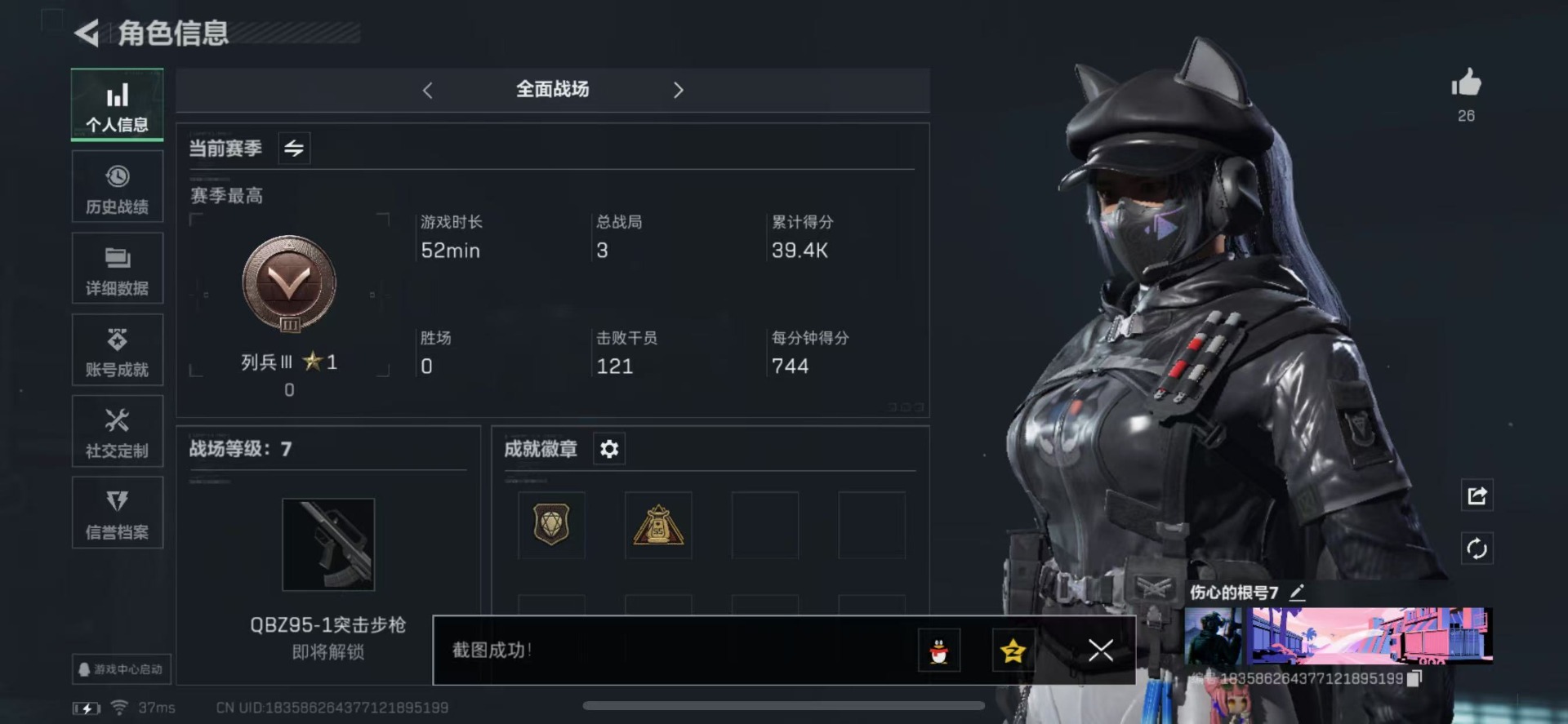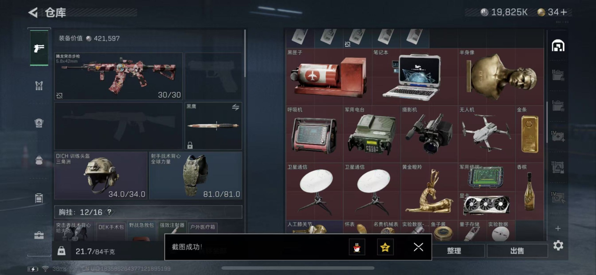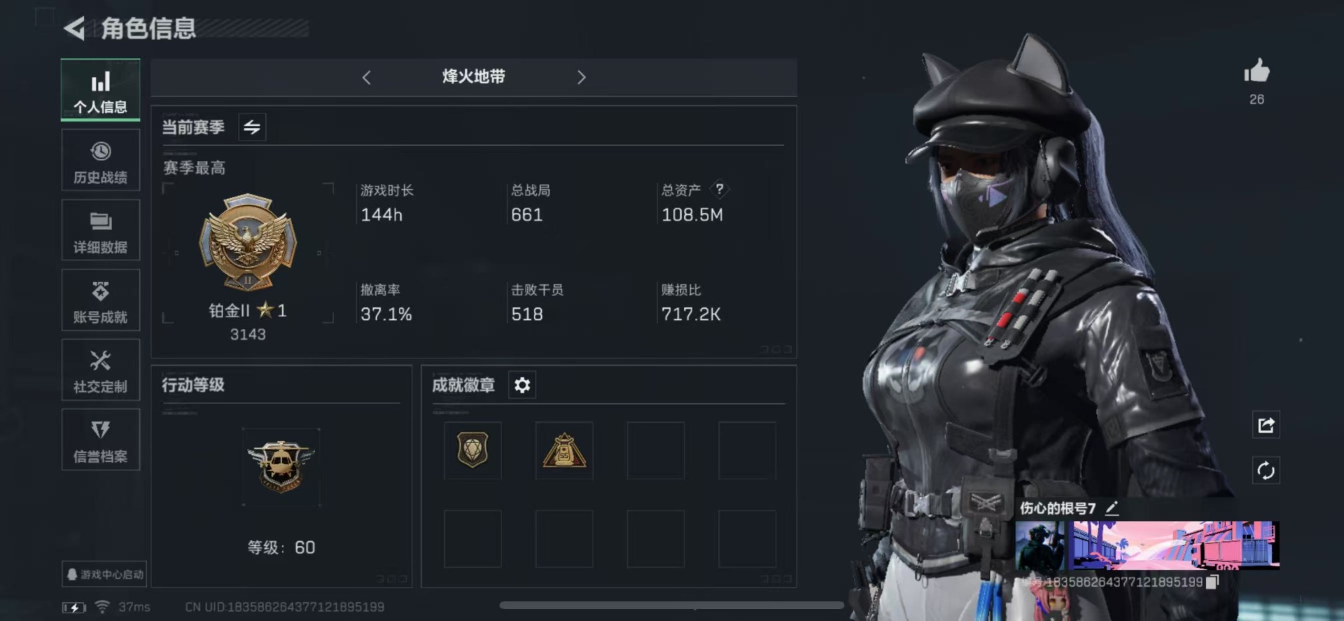 [11554147]总资产:108.5 1干员外观 2传说枪械 顶级安全箱(3×3)9.15号到期 可二次 可修改实名 烽火地带段位:铂金 全面战场段位:列兵 哈夫币:19.825 传说武器皮肤:复合弓-黑-天际线,CAR-15突击步枪-阿米娅 干员外观:露娜-黑·天际线