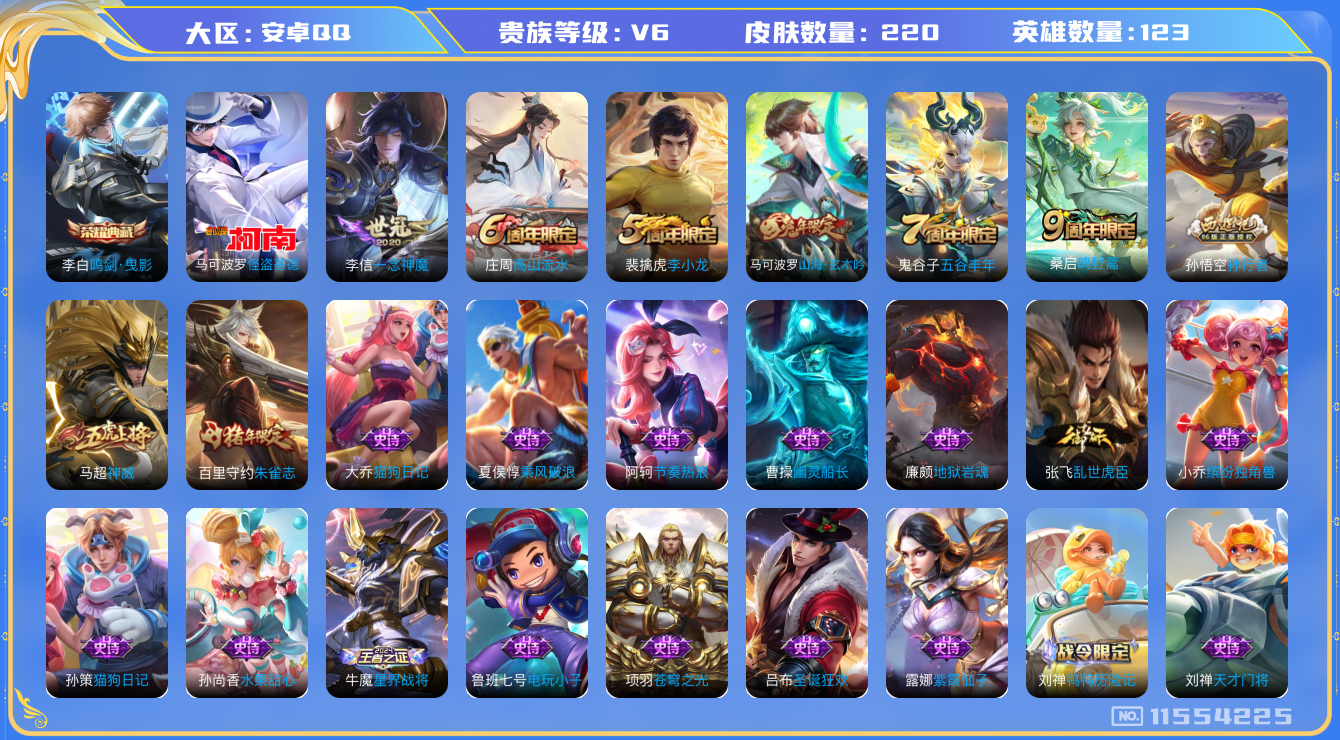 [11554225]V6 1典藏 1珍品传说 2传说 123英雄 220皮肤 可修改实名 荣耀水晶:鸣剑·曳影 珍品传说:怪盗基德 传说皮:一念神魔 珍宝阁皮:胡桃夹子,玩趣恶龙 限定皮:鸣野蒿,神威(电光马子),高山流水,五谷丰年,李小龙,朱雀志(守约年限),孙行者,山海·玄木吟(马可年限) 史诗皮:星界战将,鸭鸭历险记-刘禅,蒙犽顽岩魄,紫霞仙子,苍穹之光,电玩小子(小书包),特工魅影,千年之狐,蒙恬荣光圣徽,偶像歌手,猫狗日记-孙策,猫狗日记-大乔,乱世虎臣,节奏热浪,女仆咖啡,水果甜心,绅士熊喵,天才门将,星夜王子,时之奇旅-安琪拉,功夫厨神,暗隐猎兽者,幽灵船长,鬼剑武藏,心灵战警,天秀·启明,舞动绿茵,地狱岩魂,纤云弄巧,拒霜思,缤纷独角兽,乘风破浪,逐浪之夏,水晶猎龙者,金属风暴,原初追逐者,圣诞狂欢,圣诞恋歌,鹰眼统帅,魅力维加斯,黎明之约,千筹问战,无心,未来纪元-赵云