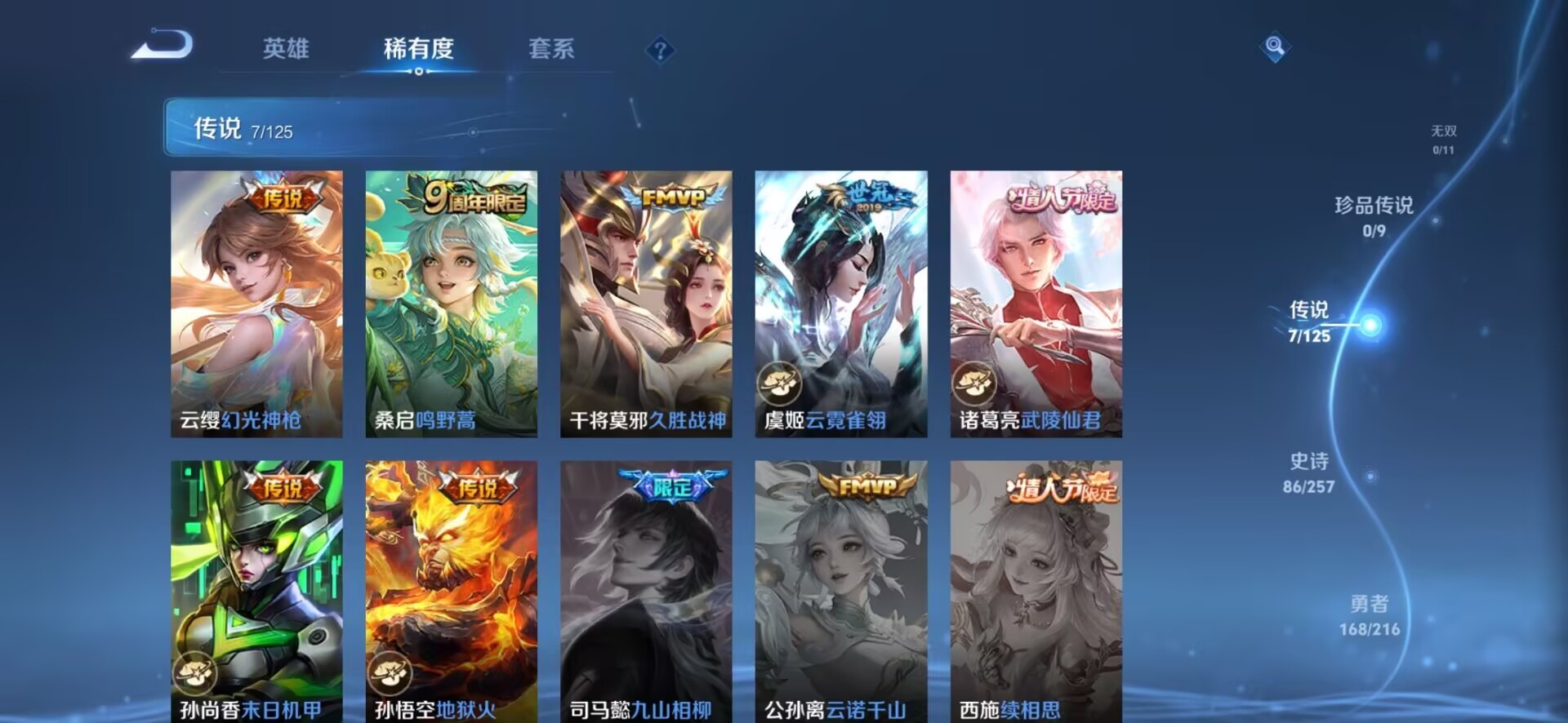 - PX_2007229-【215皮5传说 时雨天司 愿照九州拓】:安卓Q-V6-最强王者段位-123英雄-215皮肤-0典藏-0无双-0珍品传说-5传说-51史诗 【内测皮肤】:孙尚香蔷薇恋人,艾琳女武神,狂铁特工战影 【传说皮肤】:狄仁杰超时空战士,孙悟空零号赤焰,诸葛亮时雨天司,桑启鸣野蒿,澜愿照九州拓 【限定皮肤】:姜子牙天穹之誓,狄仁杰阴阳师,赵云皇家上将,墨子神迹守卫,孙尚香蔷薇恋人,元歌
