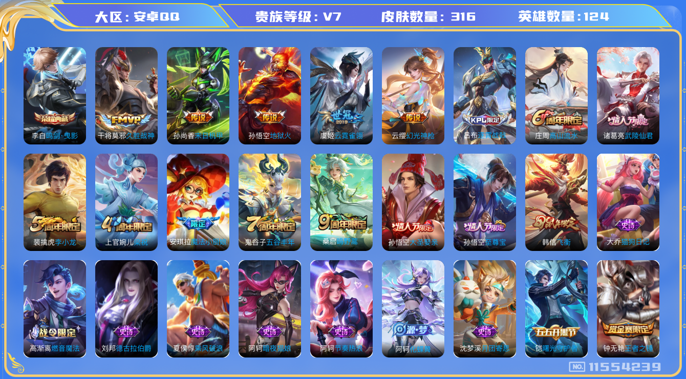 [11554239]V7 1典藏 7传说 124英雄 316皮肤 可修改实名 荣耀水晶:鸣剑·曳影 传说皮:幻光神枪,地狱火,末日机甲-孙尚香(绿蚂蚱),云霓雀翎,久胜战神 珍宝阁皮:妄想食味,优雅恋人,玩趣恶龙 限定皮:逐霄战戟,鸣野蒿,至尊宝,武陵仙君(小桃花),魔法小厨娘,飞衡(韩信年限),高山流水,五谷丰年,梁祝,李小龙,大圣娶亲 史诗皮:星界战将,灵蛊蚀心,龙之律动,蔬乡物语(鲁班七号),化蝶舞,紫霞仙子,苍穹之光,电玩小子(小书包),白龙吟,黄金分割率,特工魅影,千年之狐,江河有灵,高渐离燃音魔法,雪夜绮愿(周瑜),百解令(蒙犽),蒙恬荣光圣徽,冰冠公主,偶像歌手,无限星赏官,电玩·爆裂旋风,暗夜猫娘,龙骑士(小龙虾),末日机甲-吕布,猫狗日记-孙策,猫狗日记-大乔,乱世虎臣,节奏热浪,女仆咖啡,摇滚巨星,水果甜心,绅士熊喵,天才门将,星夜王子,心灵骇客,功夫厨神,德古拉伯爵,暗隐猎兽者,幽灵船长,鬼剑武藏,心灵战警,舞动绿茵,地狱岩魂,诗语江南,纤云弄巧,繁星吟游(呼啦呼啦),拒霜思,缤纷独角兽,乘风破浪,逐浪之夏,月团寄思,水晶猎龙者,曙光守护者,箭羽风息,唤灵魅影,金属风暴,原初追逐者,圣诞狂欢,圣诞恋歌,鹰眼统帅,王者之锤,暗夜贵公子,魅力维加斯,黎明之约,无心,未来纪元-赵云