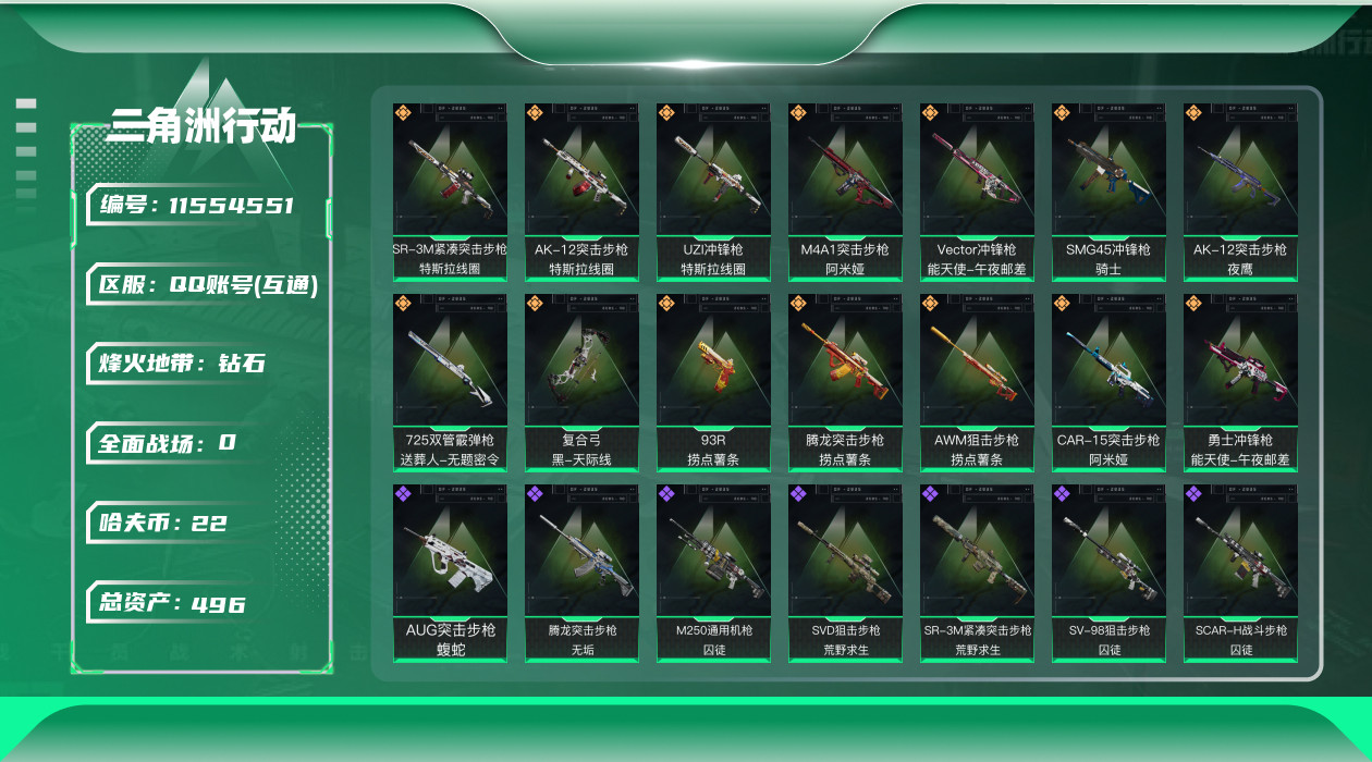 [11554551]总资产:496.1M 14传说枪械 哈夫币:22.028K 可二次 可修改实名 优质装备:顶级安全箱(3x3) 烽火地带段位:钻石 全面战场段位:校官 传说武器皮肤:SMG45冲锋枪-骑士,UZI冲锋枪-特斯拉线圈,AWM狙击步枪-捞点薯条,腾龙突击步枪-捞点薯条,93R-捞点薯条,AK-12突击步枪-特斯拉线圈,SR-3M紧凑突击步枪-特斯拉线圈,勇士冲锋枪-能天使-午夜邮差,Vector冲锋枪-能天使-午夜邮差,复合弓-黑-天际线,725双管霰弹枪-送葬人-无题密令,M4A1突击步枪-阿米娅,CAR-15突击步枪-阿米娅,AK-12突击步枪-夜鹰 史诗武器皮肤:AUG突击步枪-蝮蛇,Ash-12战斗步枪-守夜人,M16A4突击步枪-竞赛选手,PKM通用机枪-守夜人,M700狙击步枪-守夜人,SG552突击步枪-尖端治疗,SR-25射手步枪-尖端治疗,M1014霰弹枪-林中猎手,SG552突击步枪-深海恐惧,AKM突击步枪-林中猎手,SVD狙击步枪-暗夜猎手,SV-98狙击步枪-林中猎手,PTR-32突击步枪-英雄,PKM通用机枪-荒野求生,M250通用机枪-囚徒,SV-98狙击步枪-囚徒,SCAR-H战斗步枪-囚徒,腾龙突击步枪-无垢,PSG-1射手步枪-无垢,SVD狙击步枪-荒野求生,SR-3M紧凑突击步枪-荒野求生,QBZ95-1突击步枪-曙光,S12K霰弹枪-曙光,M700狙击步枪-竞技风