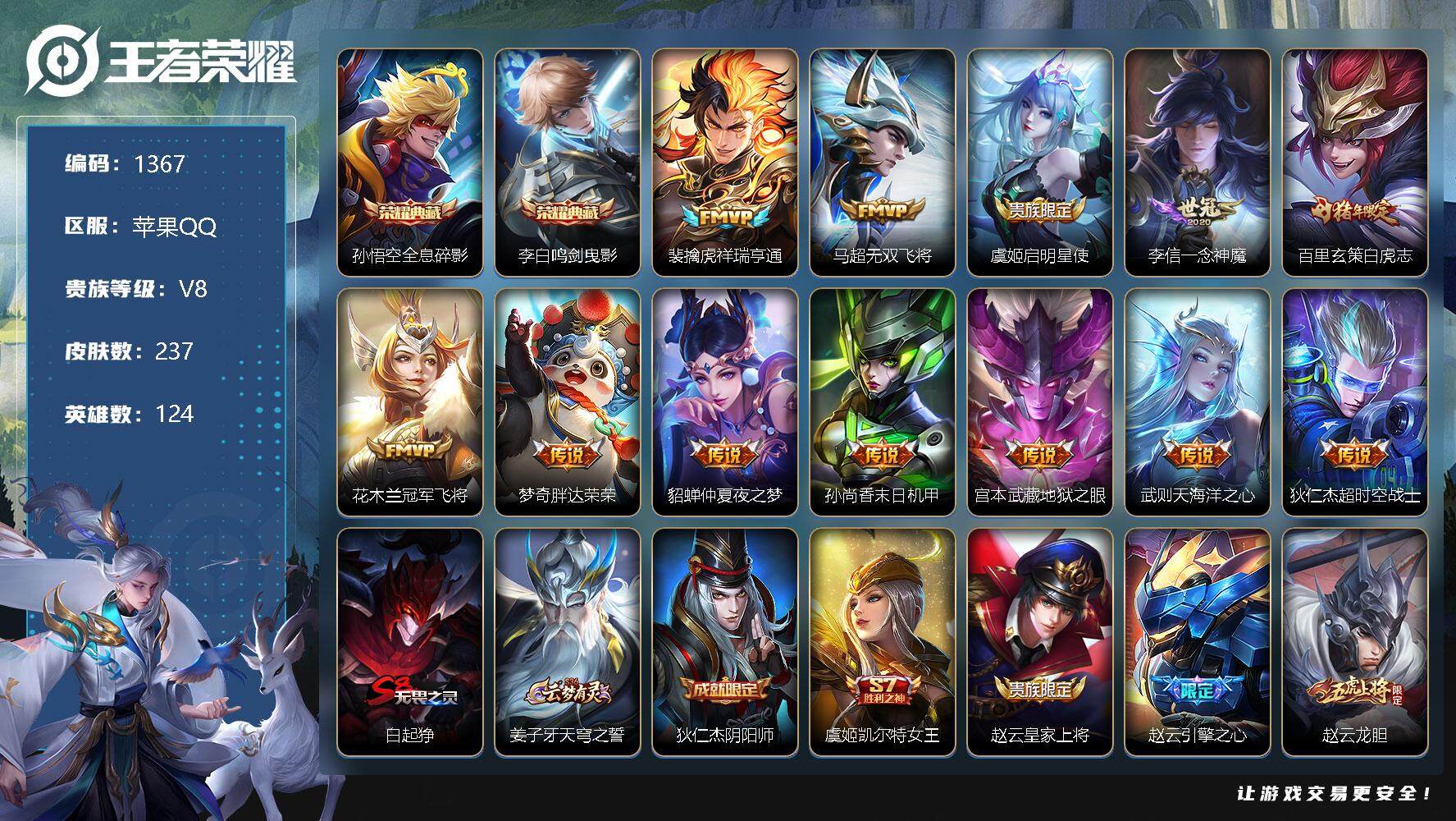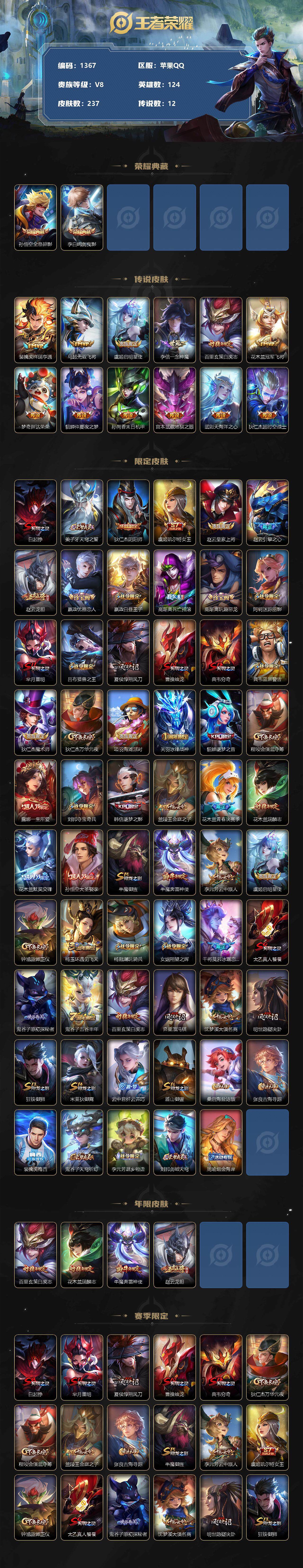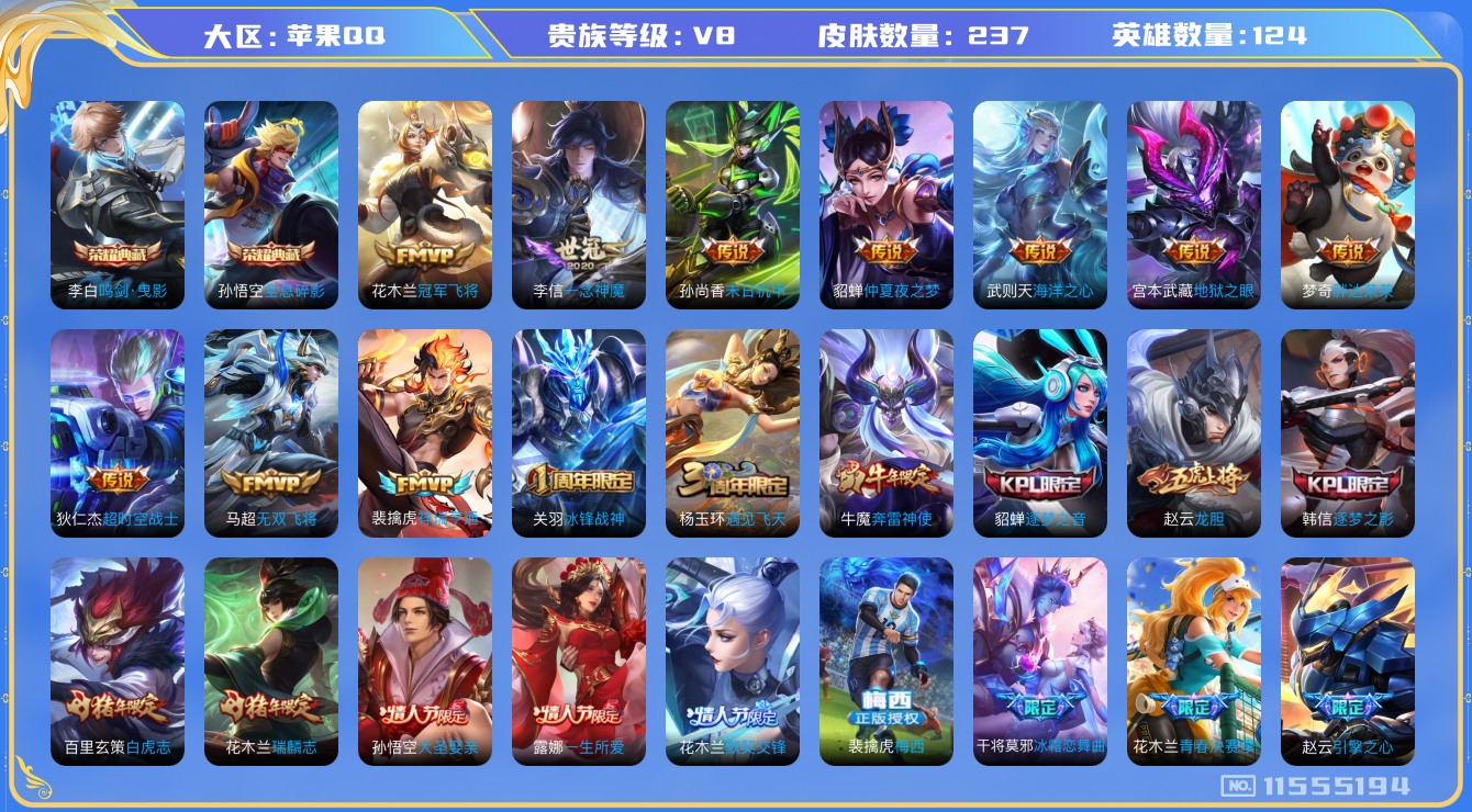 [11555194]【商品标题】:苹果Q-V7-最强王者段位-124英雄-237皮肤-2典藏-0珍品无双-0无双-0珍品传说-12传说-56史诗