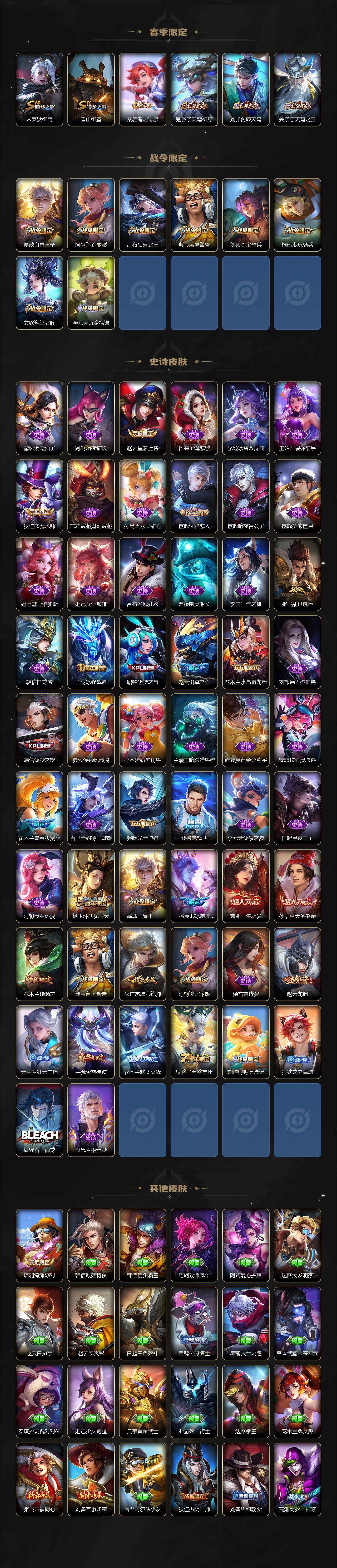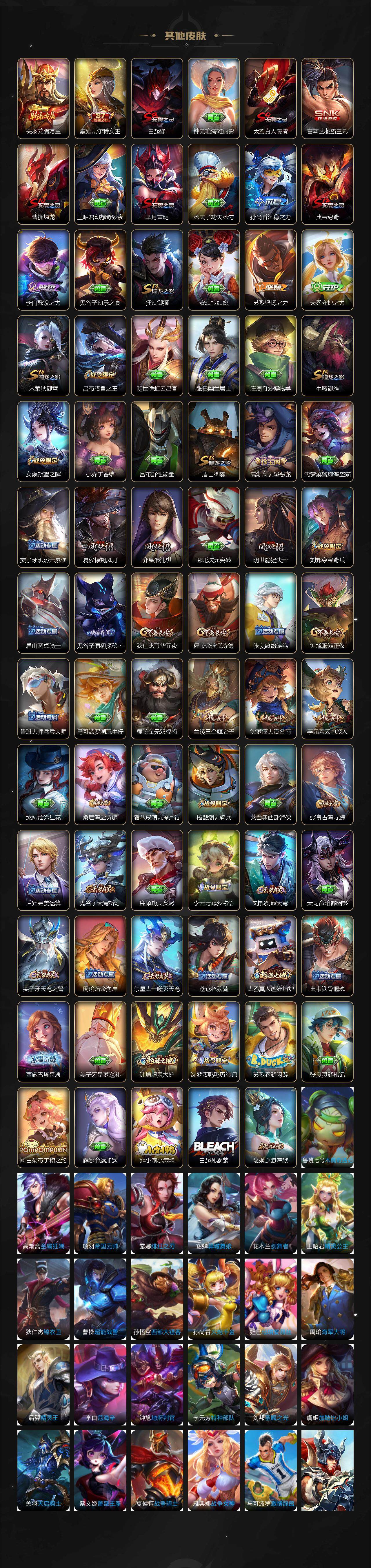【限定皮肤】:白起狰,姜子牙天穹之誓,狄仁杰阴阳师,虞姬凯尔特女王,赵云皇家上将,赵云引擎之心,赵云龙胆,嬴政优雅恋人,嬴政白昼王子,高渐离死亡摇滚,高渐离玩趣恶龙,阿轲迷踪丽影,芈月重明,吕布猎兽之王,夏侯惇朔风刀,曹操烛龙,典韦穷奇,典韦蓝屏警告,狄仁杰魔术师,狄仁杰万华元夜,项羽海滩派对,关羽冰锋战神,貂蝉逐梦之音,程咬金演武夺筹,露娜一生所爱,刘邦夺宝奇兵,韩信逐梦之影,兰陵王金庭之子,花木兰青春决赛季,花木兰瑞麟志,花木兰默契交锋,孙悟空大圣娶亲,牛魔御旌,牛魔奔雷神使,李元芳云中旅人,虞姬启明星使,钟馗驱傩正仪,杨玉环遇见飞天,杨戬潮玩骑兵,女娲朔望之晖,干将莫邪冰霜恋舞曲,太乙真人饕餮,鬼谷子原初探秘者,鬼谷子五谷丰年,百里玄策白虎志,弈星混沌棋,沈梦溪大漠名商,明世隐疑决卦,狂铁御狮,米莱狄御霄,云中君纤云弄巧,盾山御銮,桑启海盐诗旅,张良古海寻踪,裴擒虎梅西,鬼谷子天穹祈灯,李元芳蔬乡物语,刘邦剑破天穹,周瑜熔金海岸