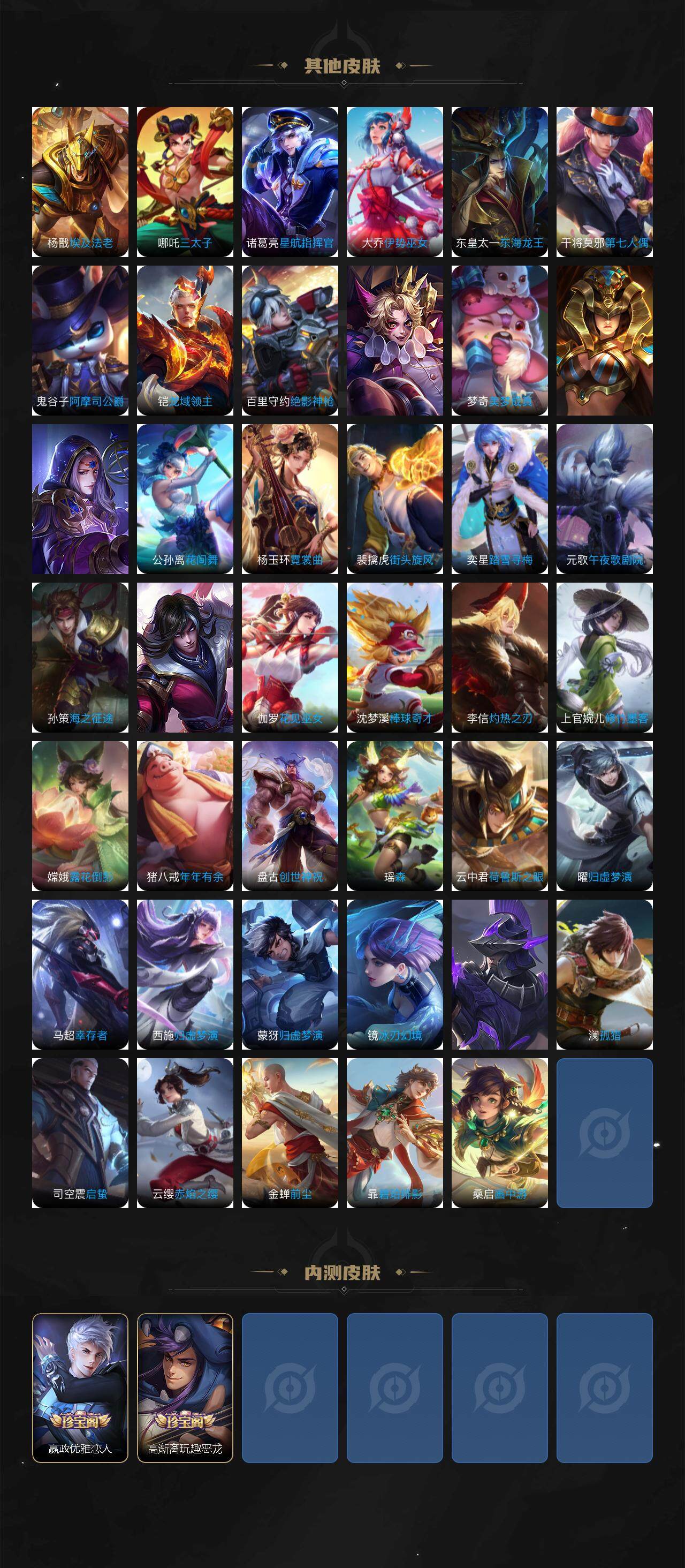 虞姬凯尔特女王,白起狰,太乙真人饕餮,曹操烛龙,芈月重明,典韦穷奇,狂铁御狮,米莱狄御霄,牛魔御旌,盾山御銮,夏侯惇朔风刀,明世隐疑决卦,鬼谷子原初探秘者,狄仁杰万华元夜,程咬金演武夺筹,钟馗驱傩正仪,吕布猎兽之王,嬴政白昼王子,女娲朔望之晖,典韦蓝屏警告,刘邦夺宝奇兵,弈星混沌棋,兰陵王金庭之子,沈梦溪大漠名商,李元芳云中旅人,桑启海盐诗旅,张良古海寻踪