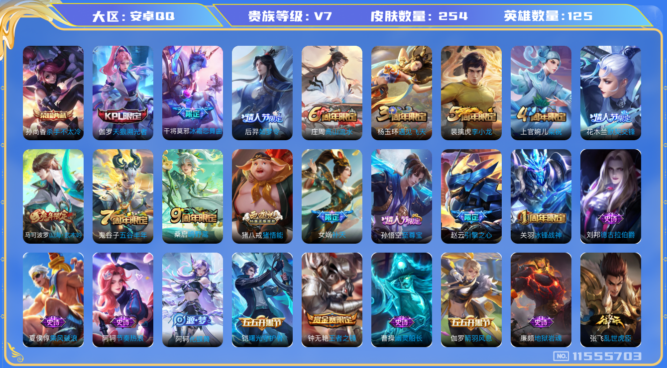 [11555703]V7 1典藏 2传说 125英雄 254皮肤 可修改实名 优质装备:杀手不太冷 珍宝阁皮:女武神,玩趣恶龙 限定皮:鸣野蒿,至尊宝,补天,遇见飞天,高山流水,五谷丰年,冰锋战神,梁祝,天狼溯光者,李小龙,如梦令-后羿,默契交锋-花木兰,猪悟能,引擎之心,冰霜恋舞曲,山海·玄木吟(马可年限) 史诗皮:器灵·浮梦炉,绮世丹青,化蝶舞,琥珀纪元伽罗,紫霞仙子,苍穹之光,电玩小子(小书包),黄金分割率,特工魅影,千年之狐,蒙恬荣光圣徽,冰冠公主,偶像歌手,晚萤,末日机甲-吕布,乱世虎臣,节奏热浪,女仆咖啡,水果甜心,绅士熊喵,天才门将,星夜王子,功夫厨神,德古拉伯爵,暗隐猎兽者,幽灵船长,暗渊魔法,心灵战警,舞动绿茵,地狱岩魂,纤云弄巧,繁星吟游(呼啦呼啦),拒霜思,缤纷独角兽,乘风破浪,逐浪之夏,水晶猎龙者,曙光守护者,箭羽风息,金属风暴,原初追逐者,圣诞狂欢,圣诞恋歌,鹰眼统帅,王者之锤,魅力维加斯,黎明之约,无心,未来纪元-赵云