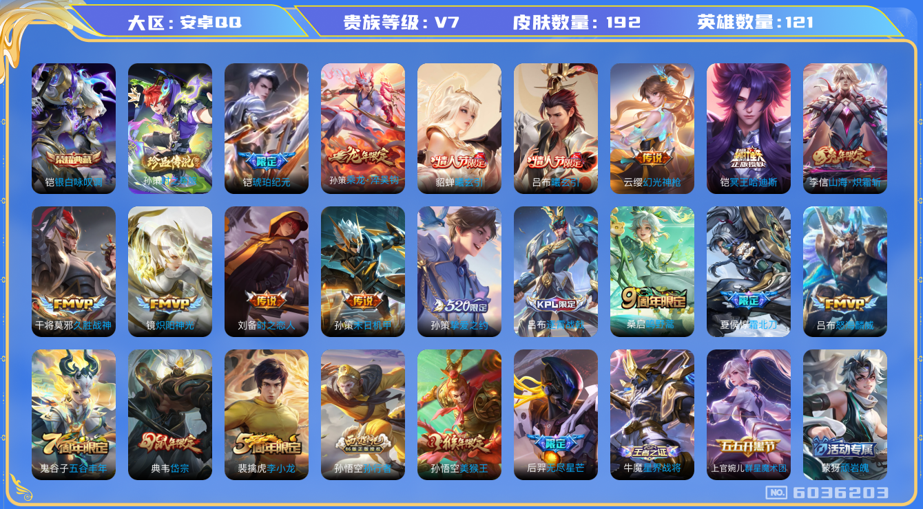 [6036203]有一颗荣耀水晶、实名: 可修改 英雄数: 121 皮肤数: 192 荣耀水晶: 银白咏叹调 珍品传说: 时之奇旅-孙策 传说皮: 久胜战神,炽阳神光,时之恋人-刘备,末日机甲-孙策,挚爱之约,山海·炽霜斩,琥珀纪元铠,乘龙·淬吴钩,貂蝉曦玄引,吕布曦玄引,铠冥王哈迪斯,幻光神枪 限定皮: 李小龙,岱宗,美猴王,孙行者,无尽星芒,五谷丰年,怒海麟威,夏侯惇霜北刀,鸣野蒿,逐霄战戟