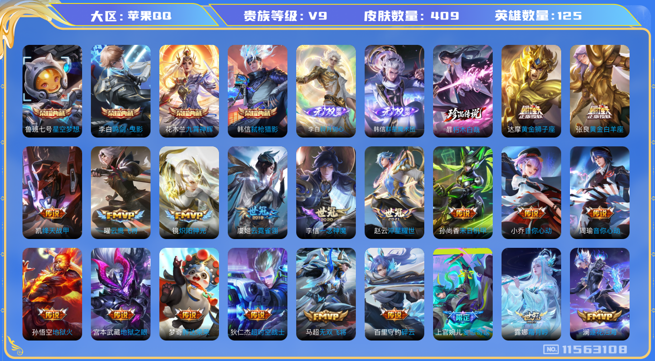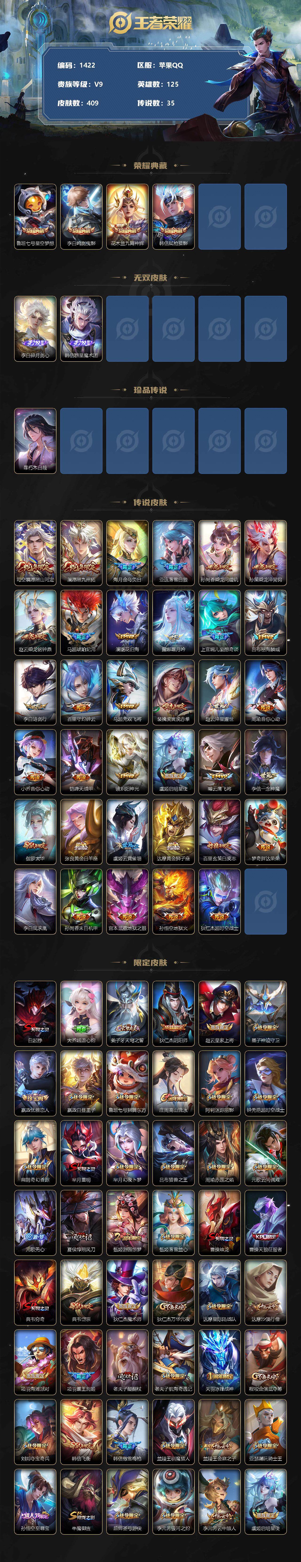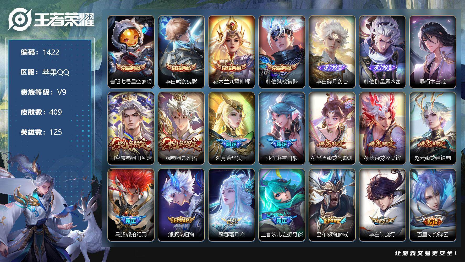 [11563108]【商品标题】:苹果Q-V9-最强王者段位-125英雄-409皮肤-4典藏-0珍品无双-2无双-1珍品传说-35传说-123史诗