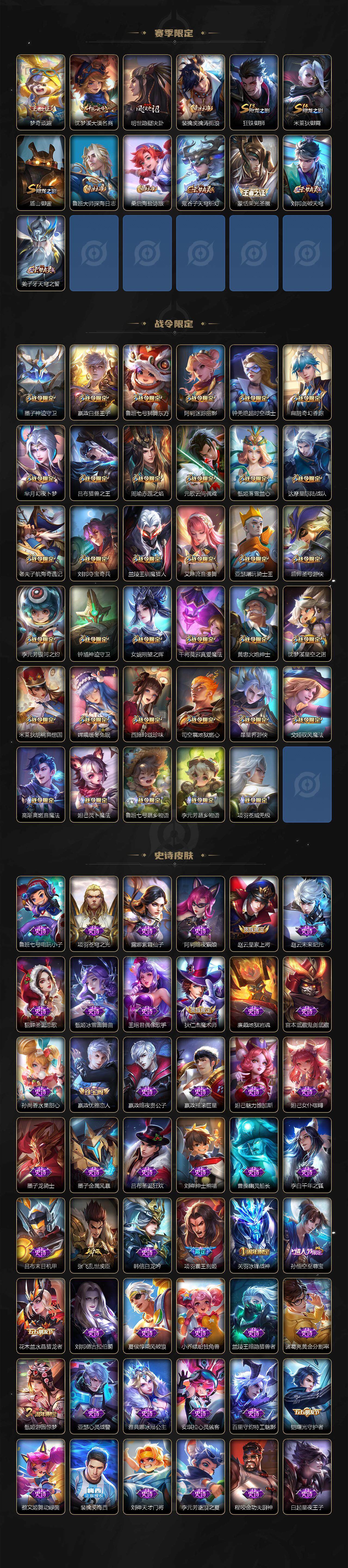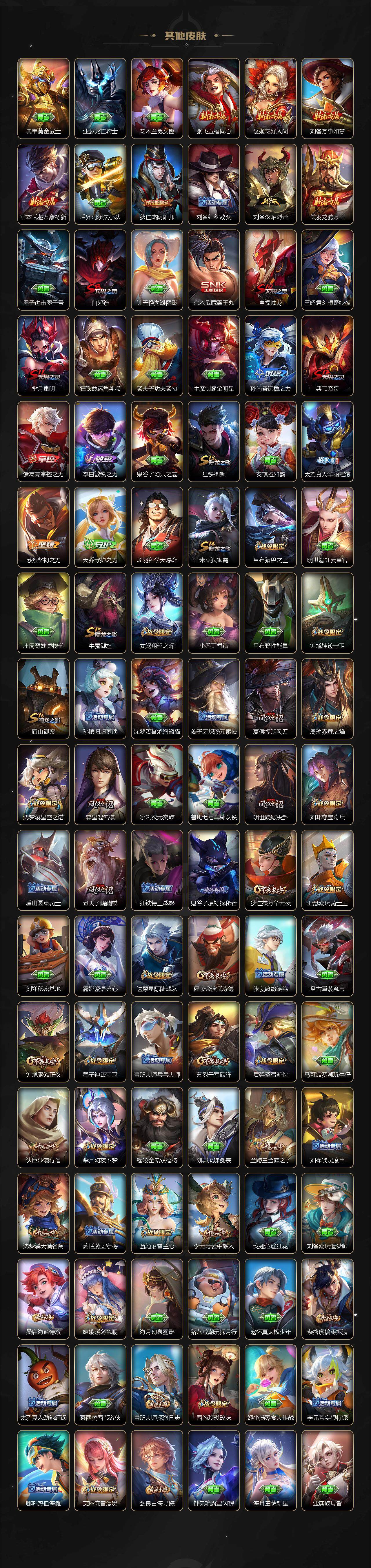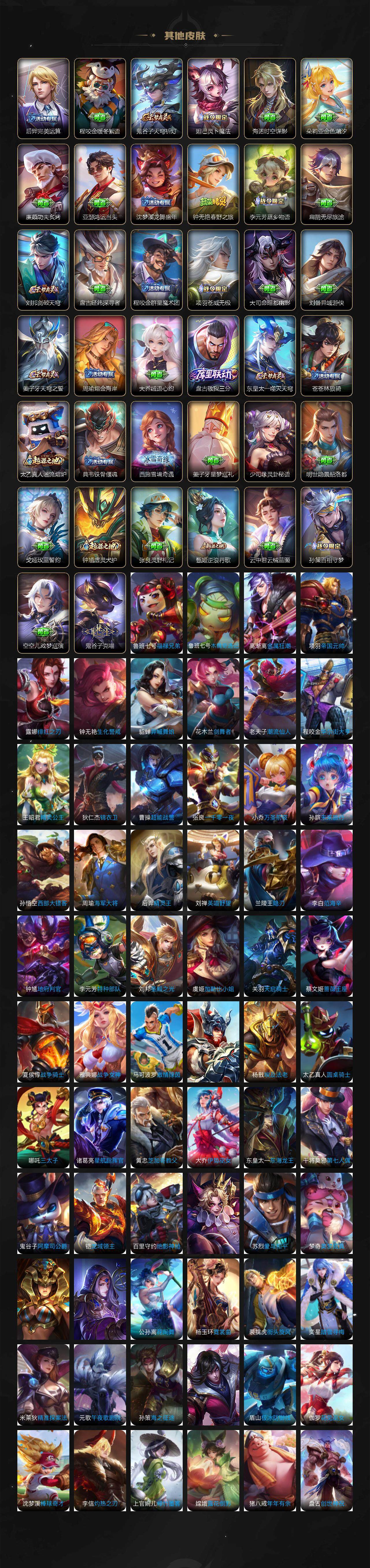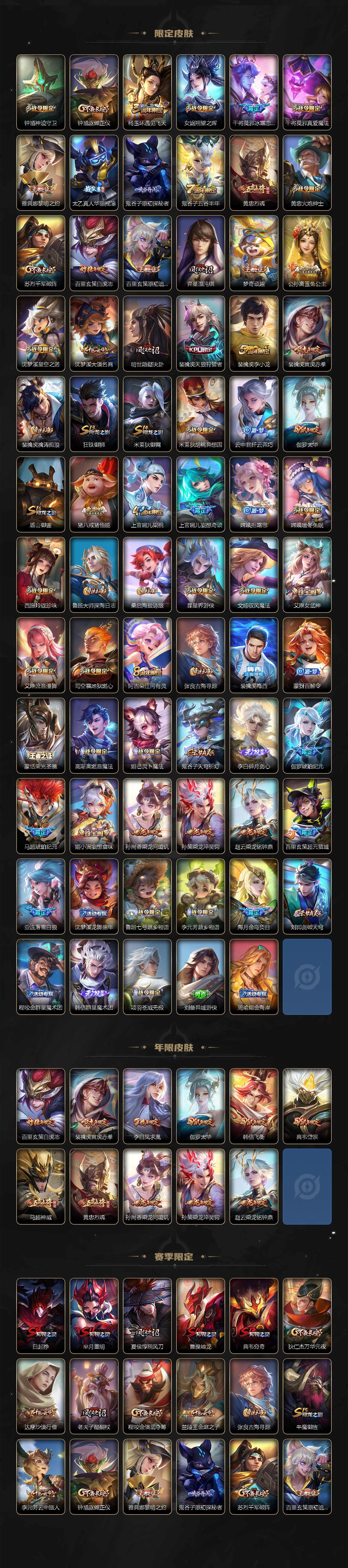 【限定皮肤】:白起狰,大乔绒语心约,姜子牙天穹之誓,狄仁杰阴阳师,赵云皇家上将,墨子神迹守卫,嬴政优雅恋人,嬴政白昼王子,鲁班七号狮舞东方,庄周高山流水,阿轲迷踪丽影,钟无艳超时空战士,扁鹊奇幻香踪,芈月重明,芈月幻夜卜梦,吕布猎兽之王,周瑜赤莲之焰,元歌云间偶戏,元歌无心,夏侯惇朔风刀,甄姬游园惊梦,甄姬落雪兰心,曹操烛龙,曹操天狼征服者,典韦穷奇,典韦岱宗,狄仁杰魔术师,狄仁杰万华元夜,达摩星际陆战队,达摩沙漠行僧,项羽海滩派对,项羽霸王别姬,老夫子醍醐杖,老夫子航海奇遇记,关羽冰锋战神,程咬金演武夺筹,刘邦夺宝奇兵,韩信飞衡,韩信傲雪梅枪,兰陵王驯魔猎人,兰陵王金庭之子,亚瑟潮玩骑士王,孙悟空至尊宝,牛魔御旌,后羿圣弓游侠,李元芳银河之约,李元芳云中旅人,虞姬启明星使,钟馗神迹守卫,钟馗驱傩正仪,杨玉环遇见飞天,女娲朔望之晖,干将莫邪冰霜恋舞曲,干将莫邪真爱魔法,雅典娜黎明之约,太乙真人华丽摇滚,鬼谷子原初探秘者,鬼谷子五谷丰年,黄忠烈魂,黄忠火炮绅士,苏烈千军破阵,百里玄策白虎志,百里玄策原初追逐者,弈星混沌棋,梦奇顽趣,公孙离玉兔公主,沈梦溪星空之诺,沈梦溪大漠名商,明世隐疑决卦,裴擒虎天狼狩猎者,裴擒虎李小龙,裴擒虎寅虎赤拳,裴擒虎擒涛扼浪,狂铁御狮,米莱狄御霄,米莱狄胡桃异想国,云中君纤云弄巧,伽罗太华,盾山御銮,猪八戒猪悟能,上官婉儿梁祝,上官婉儿妄想奇谈,嫦娥拒霜思,
