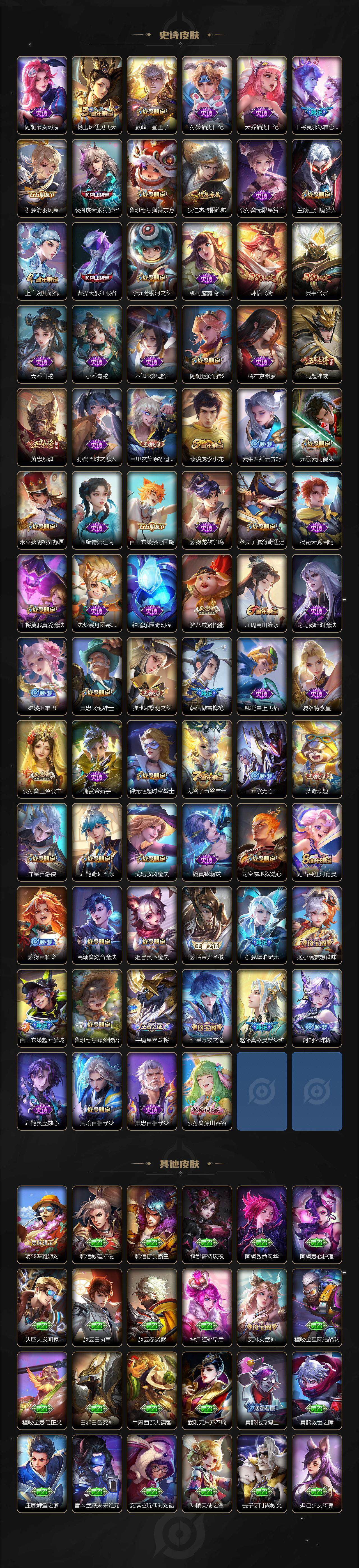白起狰,曹操烛龙,芈月重明,典韦穷奇,狂铁御狮,米莱狄御霄,牛魔御旌,盾山御銮,夏侯惇朔风刀,明世隐疑决卦,老夫子醍醐杖,鬼谷子原初探秘者,狄仁杰万华元夜,程咬金演武夺筹,钟馗驱傩正仪,苏烈千军破阵,吕布猎兽之王,嬴政白昼王子,女娲朔望之晖,钟馗神迹守卫,鲁班七号狮舞东方,沈梦溪星空之诺,李元芳银河之约,刘邦夺宝奇兵,元歌云间偶戏,弈星混沌棋,达摩沙漠行僧,兰陵王金庭之子,沈梦溪大漠名商,李元芳云中旅人,桑启海盐诗旅,裴擒虎擒涛扼浪,鲁班大师探海日志,张良古海寻踪,项羽苍威无极