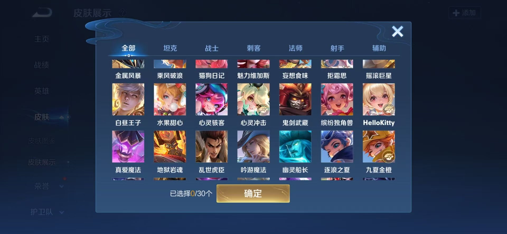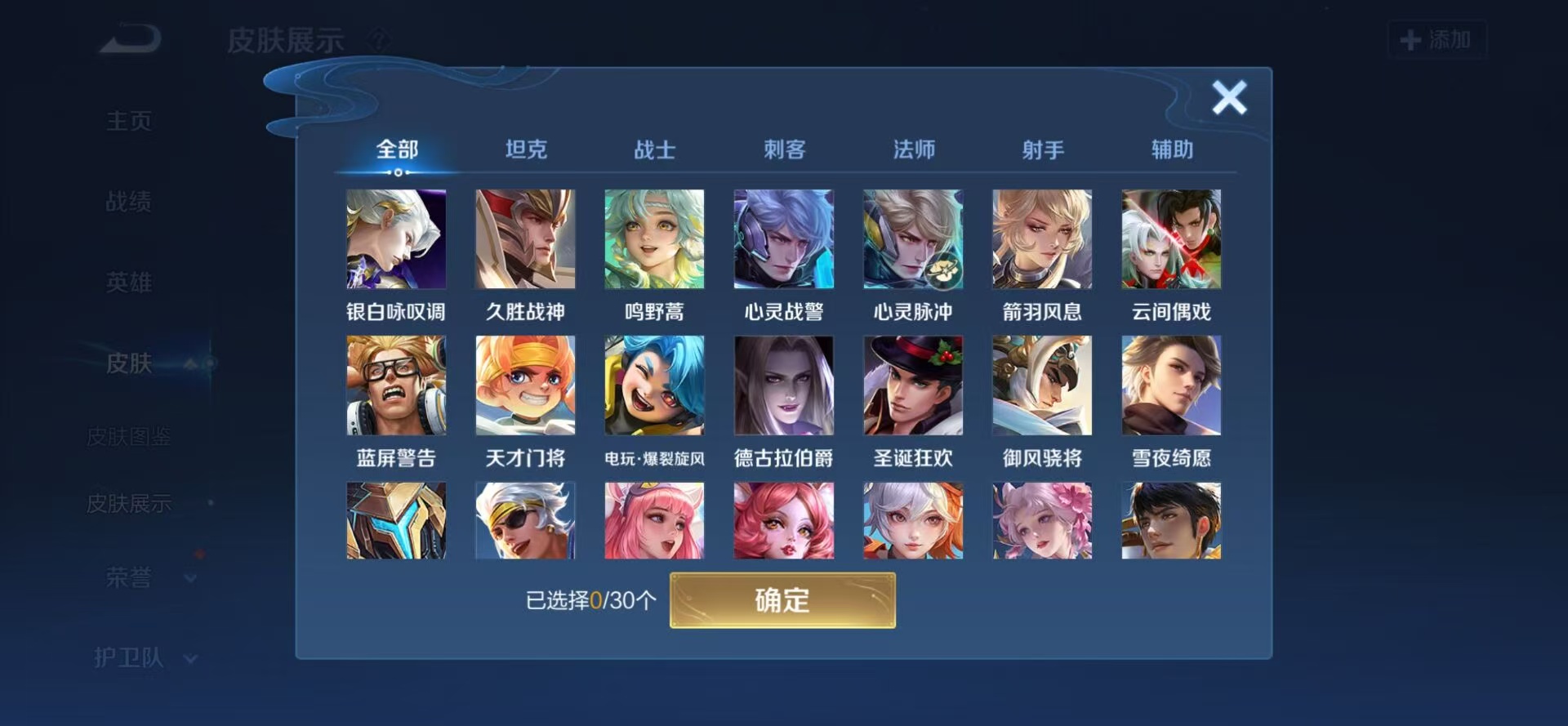 伽罗箭羽风息,李元芳逐浪之夏,大乔猫狗日记,露娜紫霞仙子,诸葛亮黄金分割率,王昭君偶像歌手,雅典娜冰冠公主,鲁班七号电玩小子,嬴政摇滚巨星,刘禅天才门将,白起星夜王子,安琪拉心灵骇客,程咬金功夫厨神,刘邦德古拉伯爵,曹操幽灵船长,宫本武藏鬼剑武藏,亚瑟心灵战警,蔡文姬舞动绿茵,廉颇地狱岩魂,小乔缤纷独角兽,夏侯惇乘风破浪,花木兰水晶猎龙者,墨子金属风暴,吕布圣诞狂欢,貂蝉圣诞恋歌,百里守约特工魅影,嫦娥拒霜思,李白千年之狐,刘禅电玩·爆裂旋风,蒙犽百解令,周瑜雪夜绮愿