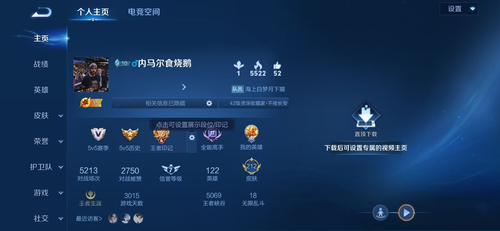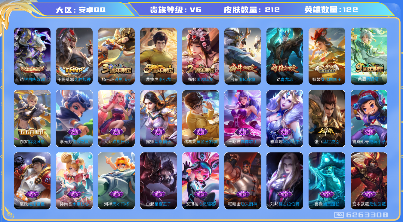 [6263308]实名: 不可修改 性别: 男号 贵族等级: V6 英雄数: 122 皮肤数: 212 荣耀水晶: 银白咏叹调 传说皮: 久胜战神 限定皮: 遇见飞天,李小龙,游园惊梦,御风骁将,青龙志,女儿国国王,鸣野蒿
