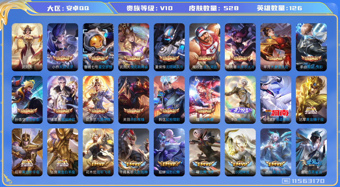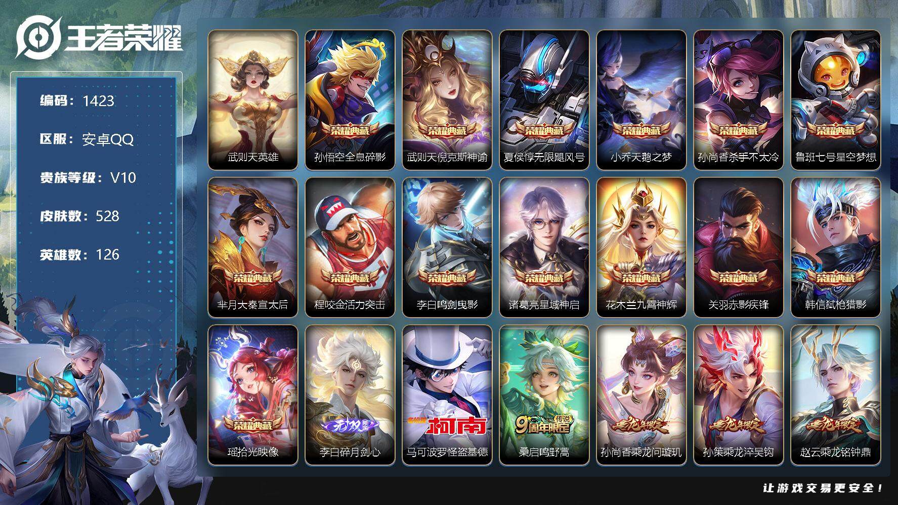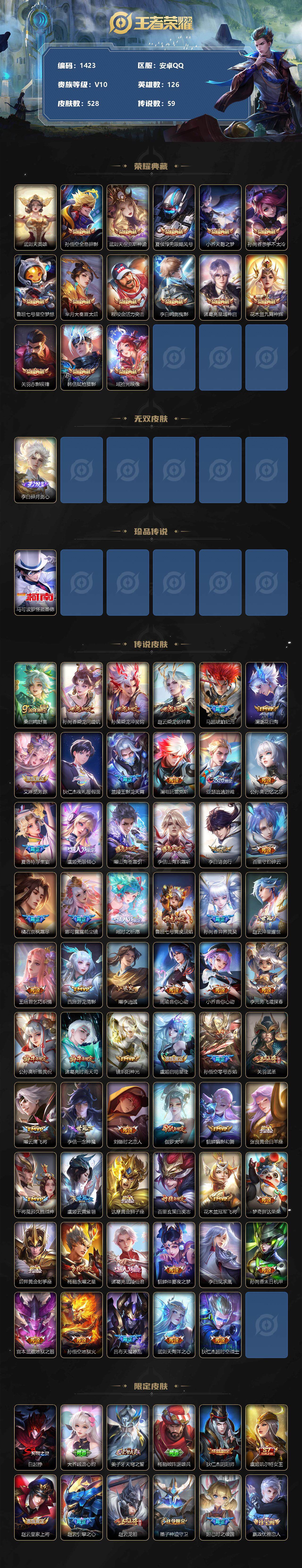[11563170]【商品标题】:安卓Q-V10-最强王者段位-126英雄-528皮肤-14典藏-0珍品无双-1无双-1珍品传说-59传说-168史诗
