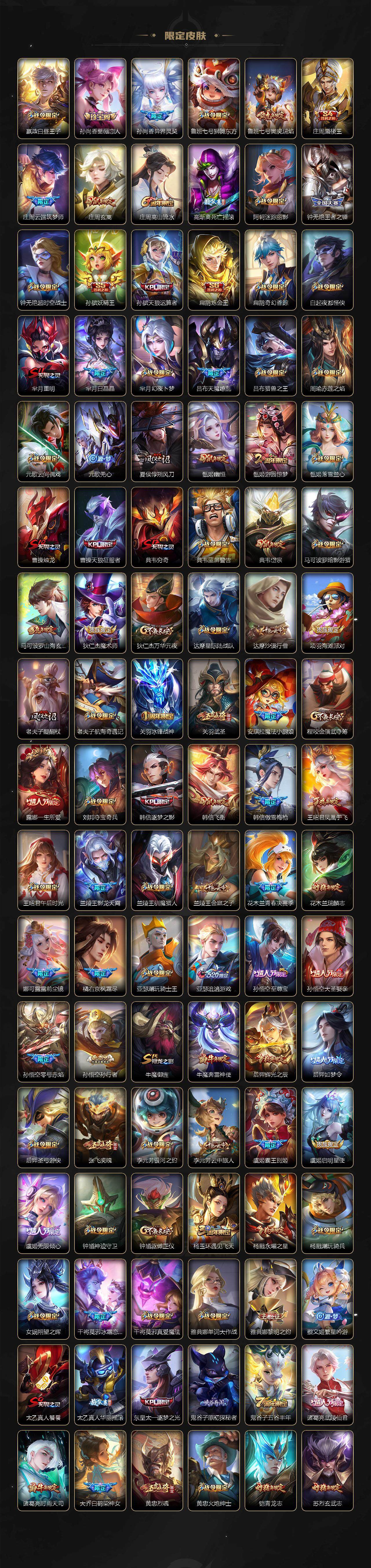 【限定皮肤】:白起狰,大乔绒语心约,姜子牙天穹之誓,杨戬破阵退雄兵,狄仁杰阴阳师,虞姬凯尔特女王,赵云皇家上将,赵云引擎之心,赵云龙胆,墨子神迹守卫,妲己时之彼端,嬴政优雅恋人,嬴政白昼王子,孙尚香蔷薇恋人,孙尚香异界灵契,鲁班七号狮舞东方,鲁班七号寅虎瑞焰,庄周蜃楼王,庄周云端筑梦师,庄周玄嵩,庄周高山流水,高渐离死亡摇滚,阿轲迷踪丽影,钟无艳王者之锤,钟无艳超时空战士,孙膑妖精王,孙膑天狼运算者,扁鹊炼金王,扁鹊奇幻香踪,白起夜都怪侠,芈月重明,芈月白晶晶,芈月幻夜卜梦,吕布天魔缭乱,吕布猎兽之王,周瑜赤莲之焰,元歌云间偶戏,元歌无心,夏侯惇朔风刀,甄姬幽恒,甄姬游园惊梦,甄姬落雪兰心,曹操烛龙,曹操天狼征服者,典韦穷奇,典韦蓝屏警告,典韦岱宗,马可波罗暗影游猎,马可