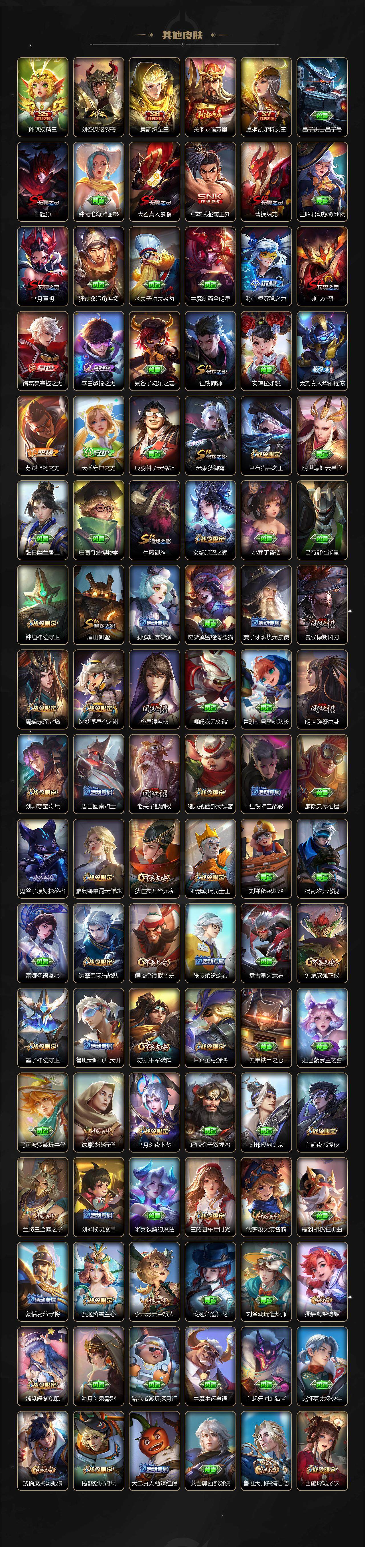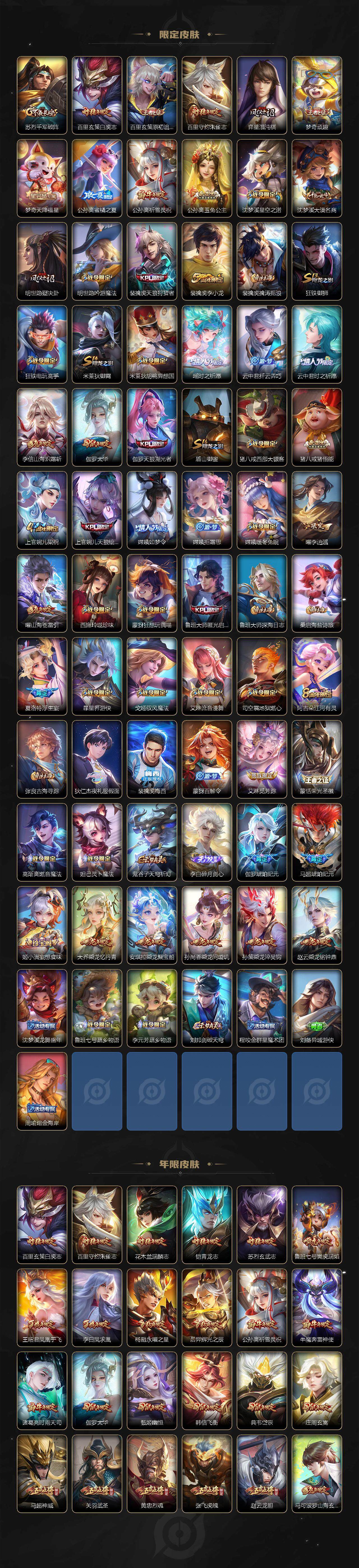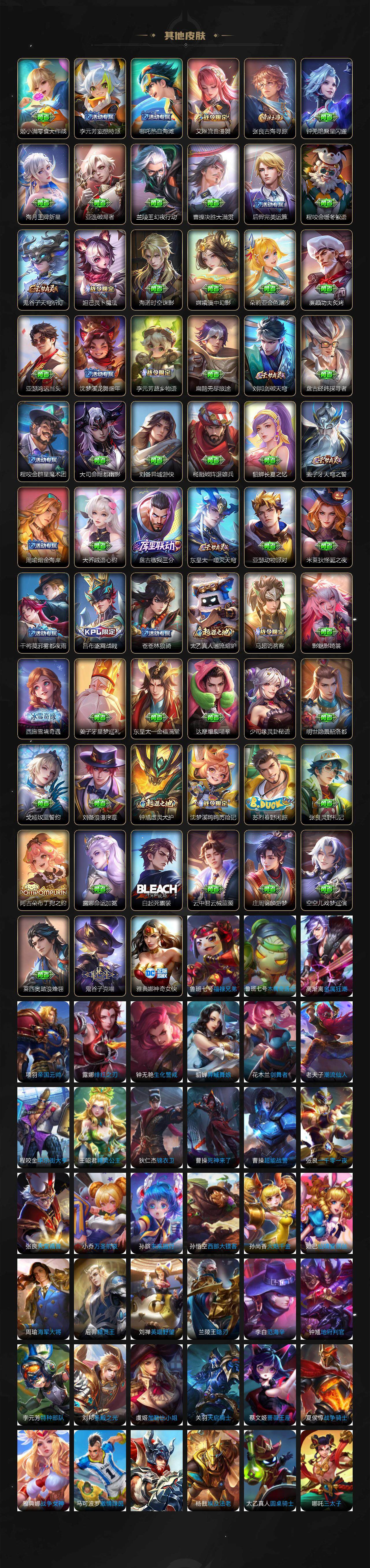 关羽冰锋战神,裴擒虎李小龙,上官婉儿梁祝,牛魔奔雷神使,公孙离祈雪灵祝,诸葛亮时雨天司,赵云龙胆,关羽武圣,黄忠烈魂,张飞虎魄,马超神威,后羿辉光之辰,庄周玄嵩,典韦岱宗,甄姬幽恒,韩信飞衡,伽罗太华,曹操天狼征服者,裴擒虎天狼狩猎者,孙膑天狼运算者,上官婉儿天狼绘梦者,伽罗天狼溯光者,韩信逐梦之影,东皇太一逐梦之光,铠青龙志,百里玄策白虎志,花木兰瑞麟志,苏烈玄武志,百里守约朱雀志,王昭君凤凰于飞,虞姬霸王别姬,孙悟空大圣娶亲,露娜一生所爱,后羿如梦令,嫦娥如梦令,孙悟空至尊宝,裴擒虎梅西,雅典娜神奇女侠,干将莫邪冰霜恋舞曲,花木兰青春决赛季,妲己时之彼端,公孙离蜜橘之夏,芈月白晶晶,安琪拉魔法小厨娘,赵云引擎之心,庄周云端筑梦师,大乔白鹤梁神女,猪八戒猪悟能,孙尚香异界灵契,孙悟空孙行者,韩信傲雪梅枪,鲁班七号寅虎·瑞焰,云中君时之祈愿,瑶时之祈愿,公孙离玉兔公主,娜可露露前尘镜,橘右京枫霜尽,鲁班大师匿光启智者,李白诗剑行,马可波罗山海·玄木吟,兰陵王影龙天霄,桑启鸣野蒿