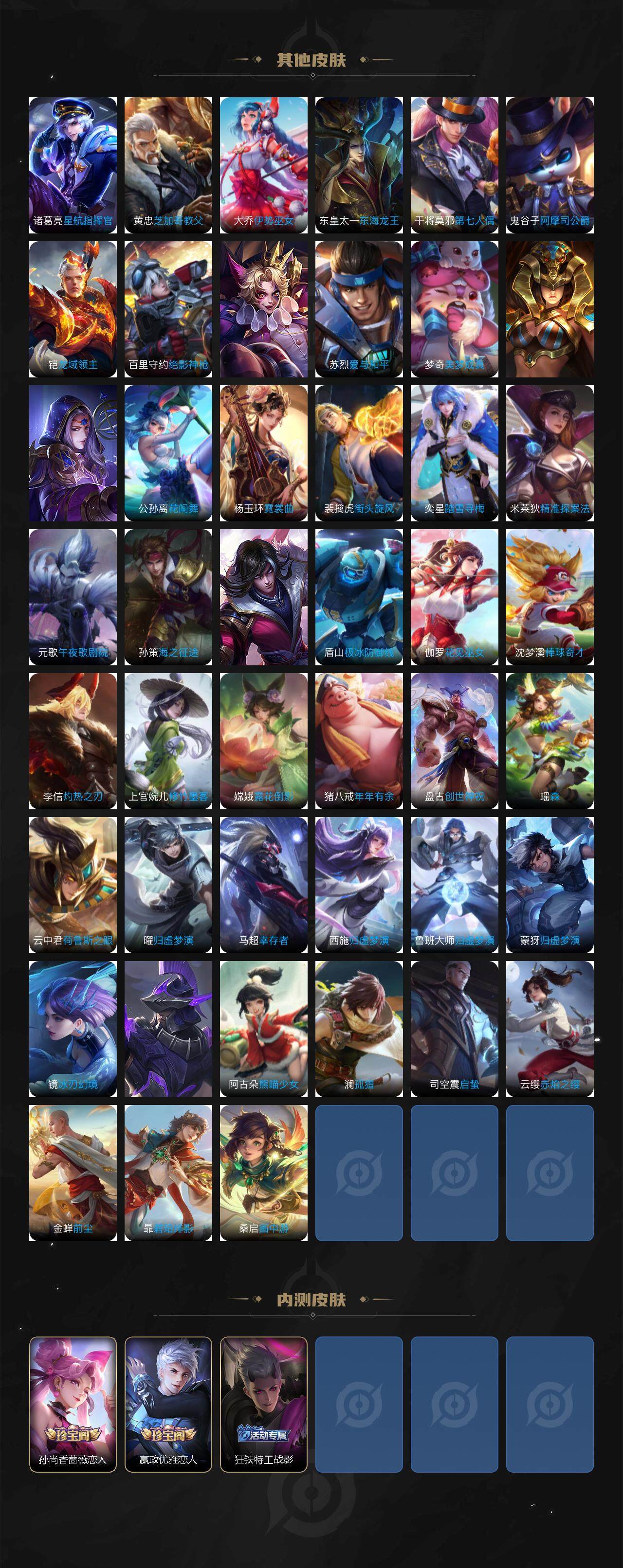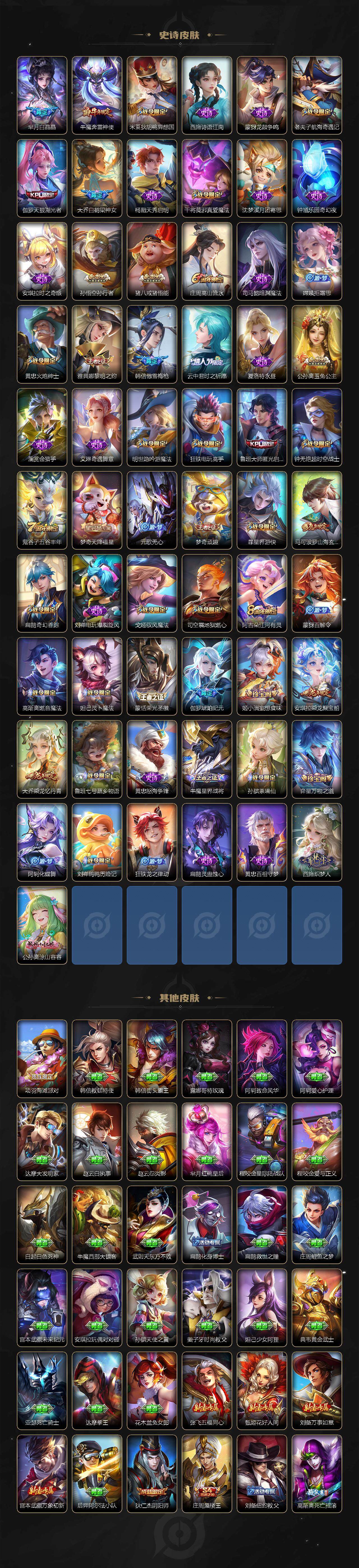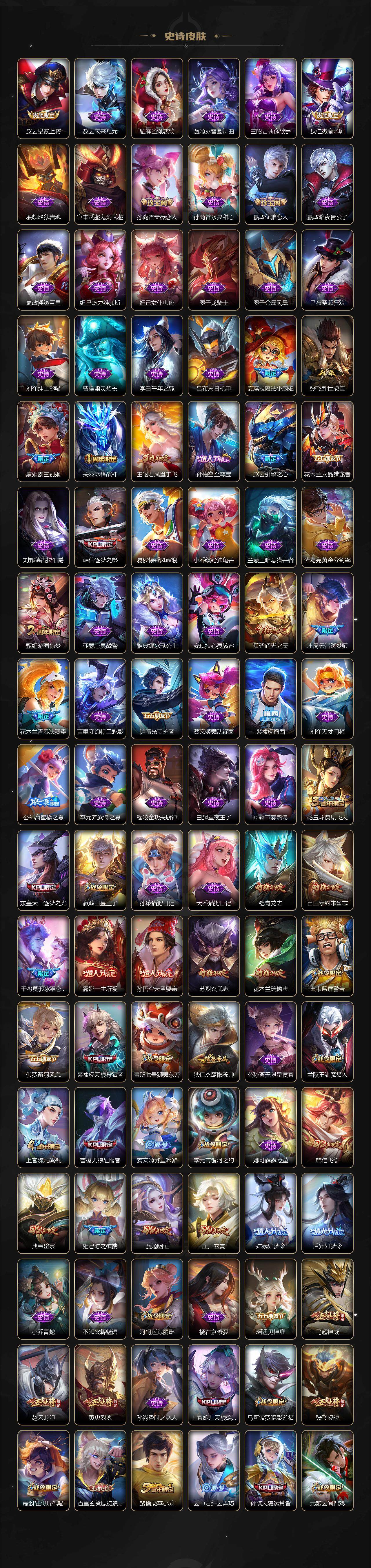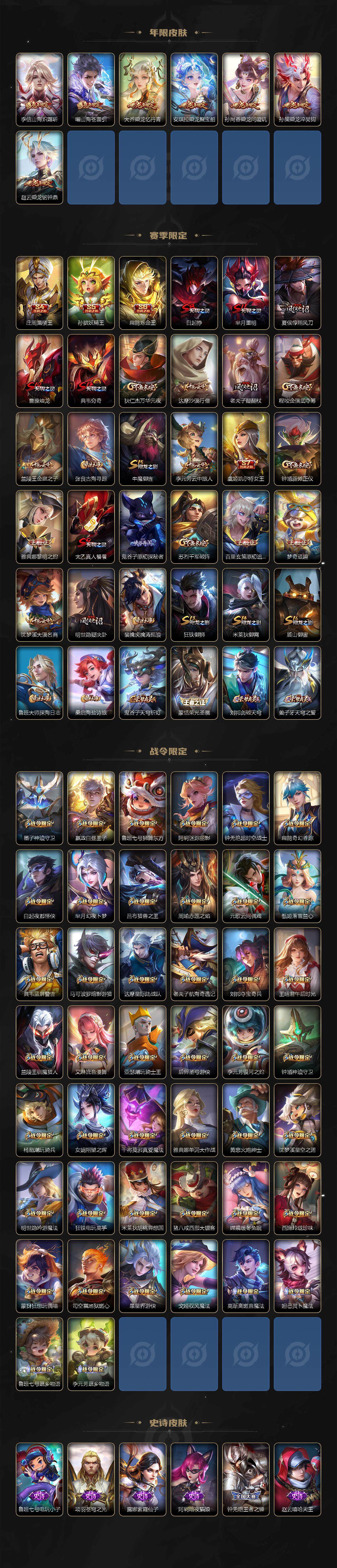 关羽冰锋战神,裴擒虎李小龙,上官婉儿梁祝,牛魔奔雷神使,公孙离祈雪灵祝,诸葛亮时雨天司,赵云龙胆,关羽武圣,黄忠烈魂,张飞虎魄,马超神威,后羿辉光之辰,庄周玄嵩,典韦岱宗,甄姬幽恒,韩信飞衡,伽罗太华,曹操天狼征服者,裴擒虎天狼狩猎者,孙膑天狼运算者,上官婉儿天狼绘梦者,伽罗天狼溯光者,韩信逐梦之影,东皇太一逐梦之光,铠青龙志,百里玄策白虎志,花木兰瑞麟志,苏烈玄武志,百里守约朱雀志,王昭君凤凰于飞,虞姬霸王别姬,孙悟空大圣娶亲,露娜一生所爱,后羿如梦令,嫦娥如梦令,孙悟空至尊宝,裴擒虎梅西,雅典娜神奇女侠,干将莫邪冰霜恋舞曲,花木兰青春决赛季,妲己时之彼端,公孙离蜜橘之夏,芈月白晶晶,安琪拉魔法小厨娘,赵云引擎之心,庄周云端筑梦师,大乔白鹤梁神女,猪八戒猪悟能,孙尚香异界灵契,孙悟空孙行者,韩信傲雪梅枪,鲁班七号寅虎·瑞焰,云中君时之祈愿,瑶时之祈愿,公孙离玉兔公主,娜可露露前尘镜,橘右京枫霜尽,鲁班大师匿光启智者,李白诗剑行,马可波罗山海·玄木吟,兰陵王影龙天霄,桑启鸣野蒿