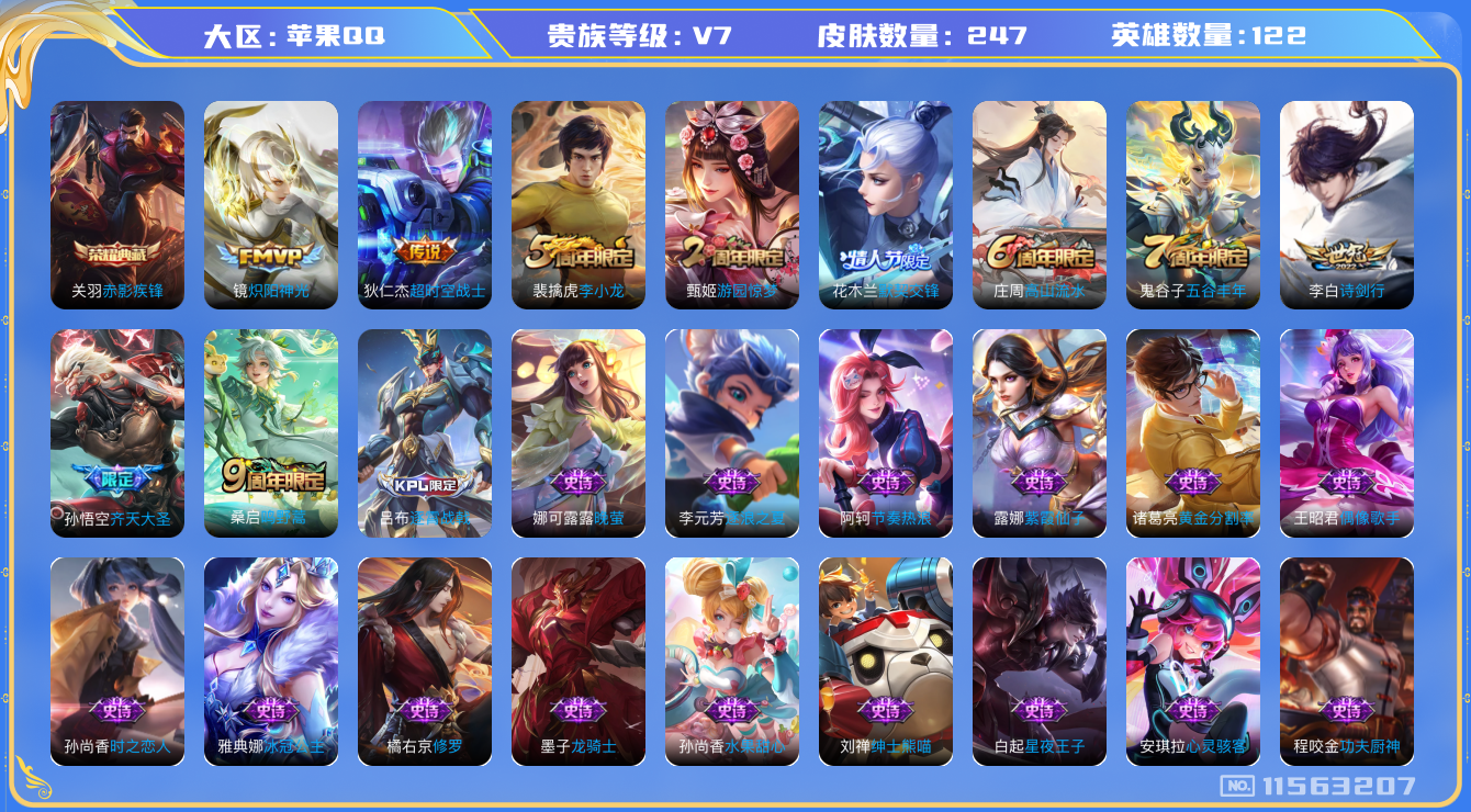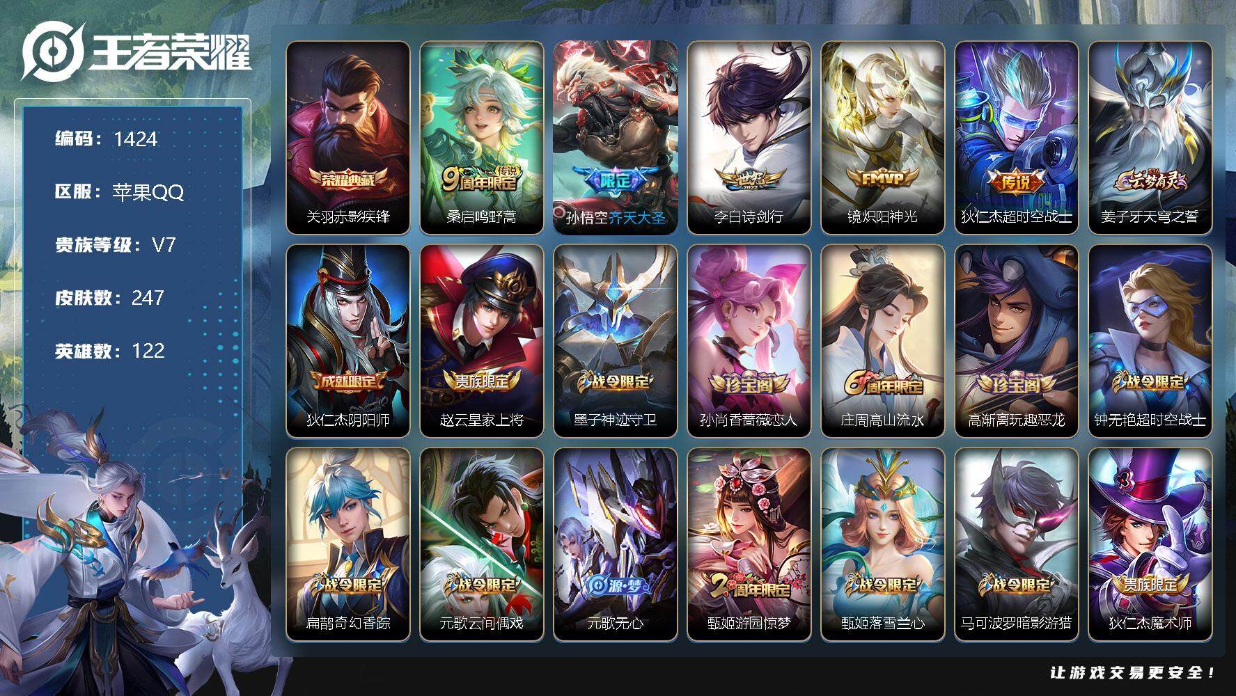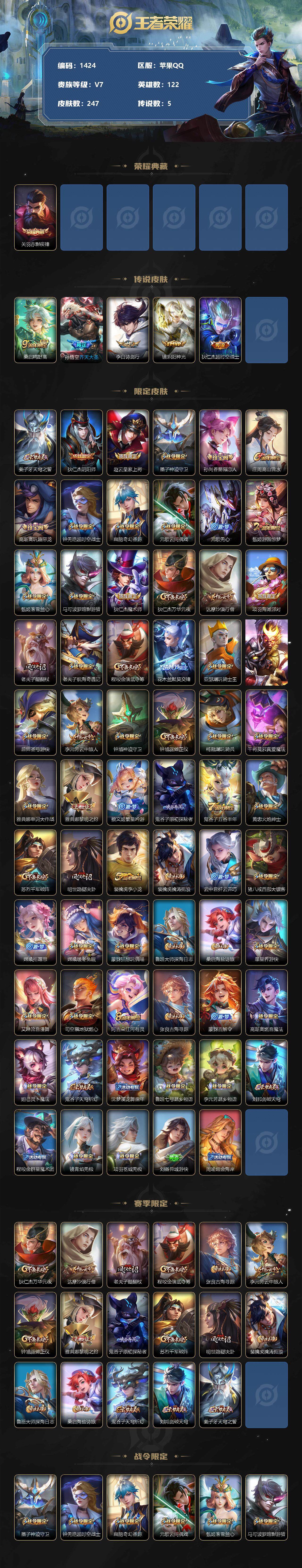 [11563207]【商品标题】:苹果Q-V5-至尊星耀III段位-122英雄-247皮肤-1典藏-0珍品无双-0无双-0珍品传说-5传说-63史诗
