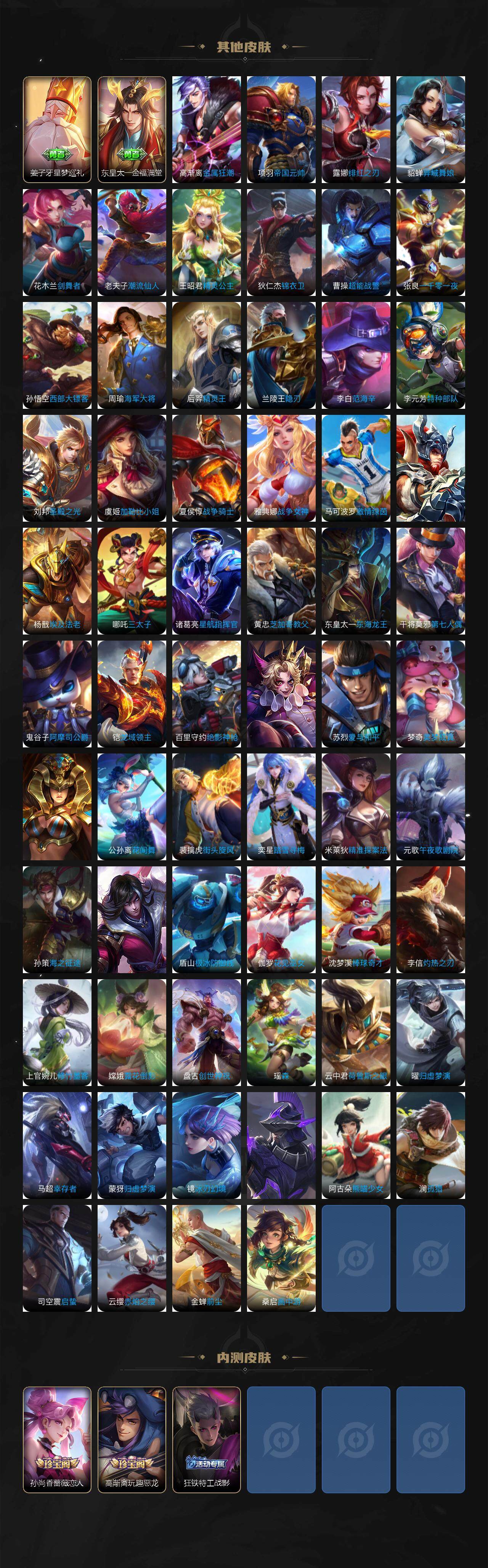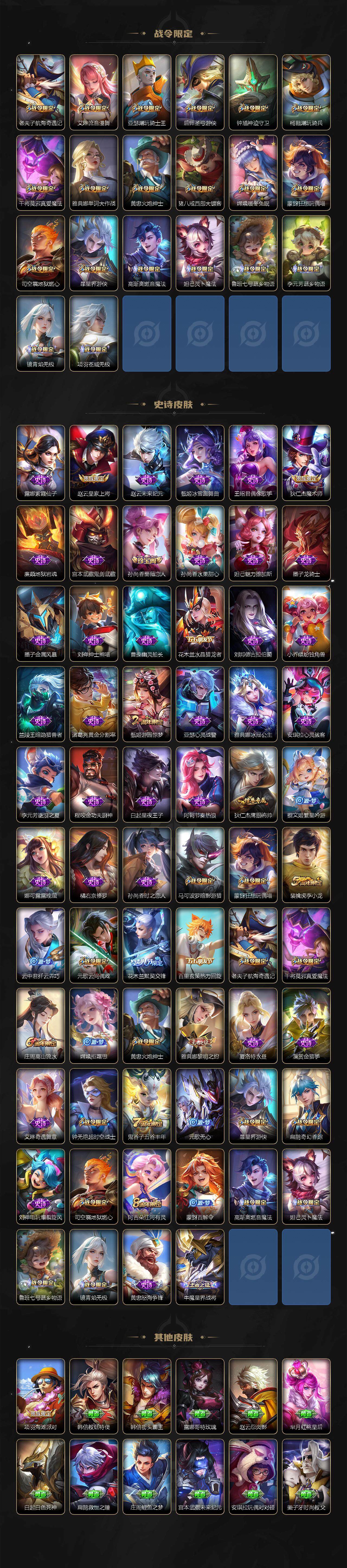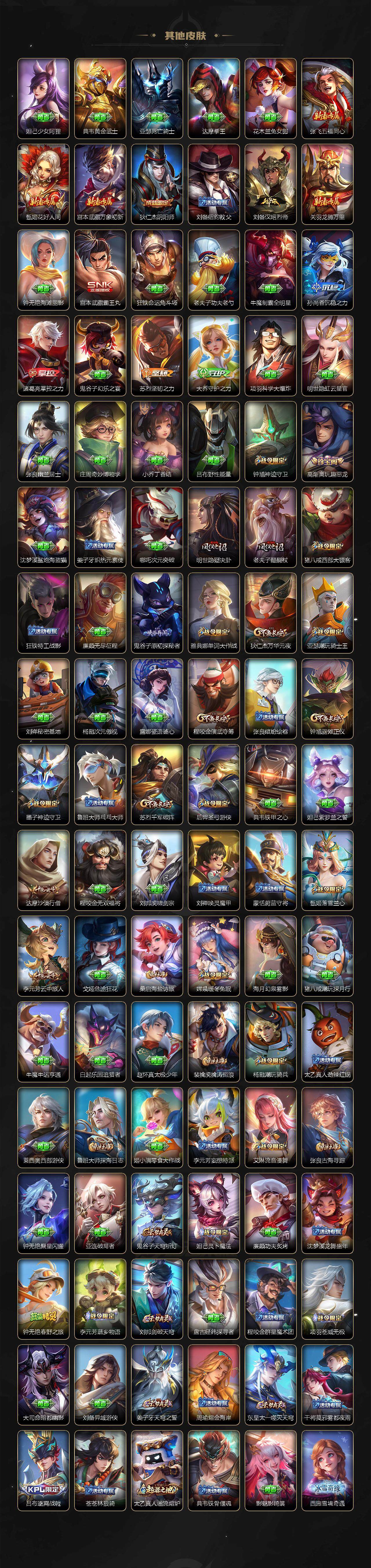 【限定皮肤】:姜子牙天穹之誓,狄仁杰阴阳师,赵云皇家上将,墨子神迹守卫,孙尚香蔷薇恋人,庄周高山流水,高渐离玩趣恶龙,钟无艳超时空战士,扁鹊奇幻香踪,元歌云间偶戏,元歌无心,甄姬游园惊梦,甄姬落雪兰心,马可波罗暗影游猎,狄仁杰魔术师,狄仁杰万华元夜,达摩沙漠行僧,项羽海滩派对,老夫子醍醐杖,老夫子航海奇遇记,程咬金演武夺筹,花木兰默契交锋,亚瑟潮玩骑士王,孙悟空齐天大圣,后羿圣弓游侠,李元芳云中旅人,钟馗神迹守卫,钟馗驱傩正仪,杨戬潮玩骑兵,干将莫邪真爱魔法,雅典娜单词大作战,雅典娜黎明之约,蔡文姬繁星吟游,鬼谷子原初探秘者,鬼谷子五谷丰年,黄忠火炮绅士,苏烈千军破阵,明世隐疑决卦,裴擒虎李小龙,裴擒虎擒涛扼浪,云中君纤云弄巧,猪八戒西部大镖客,嫦娥拒霜思,嫦娥暖冬兔眠,蒙犽狂想玩偶喵,鲁班大师探海日志,桑启海盐诗旅,暃星界游侠,艾琳流音漫舞,司空震地狱燃心,阿古朵江河有灵,张良古海寻踪,蒙犽百解令,高渐离燃音魔法,妲己灵卜魔法,鬼谷子天穹祈灯,沈梦溪龙舞盛年,鲁班七号蔬乡物语,李元芳蔬乡物语,刘邦剑破天穹,程咬金群星魔术团,镜青焰无极,项羽苍威无极,刘备异域游侠,周瑜熔金海岸