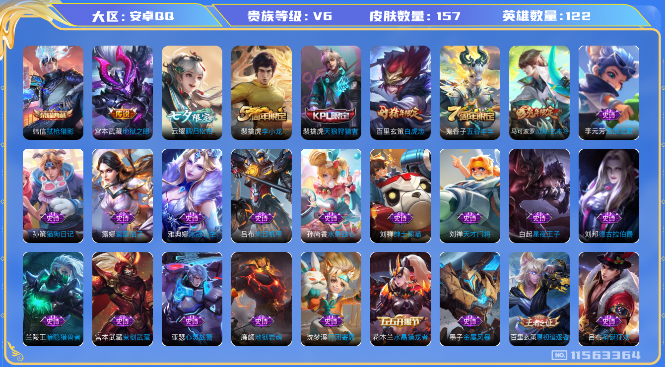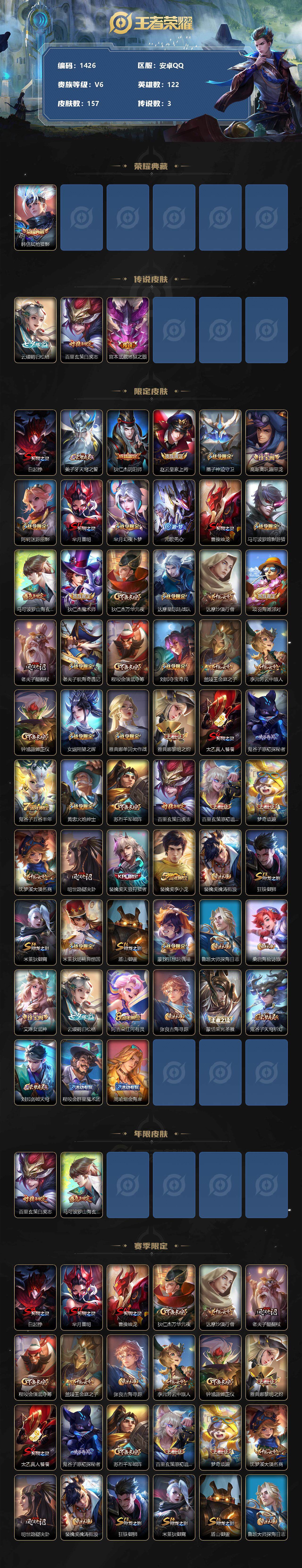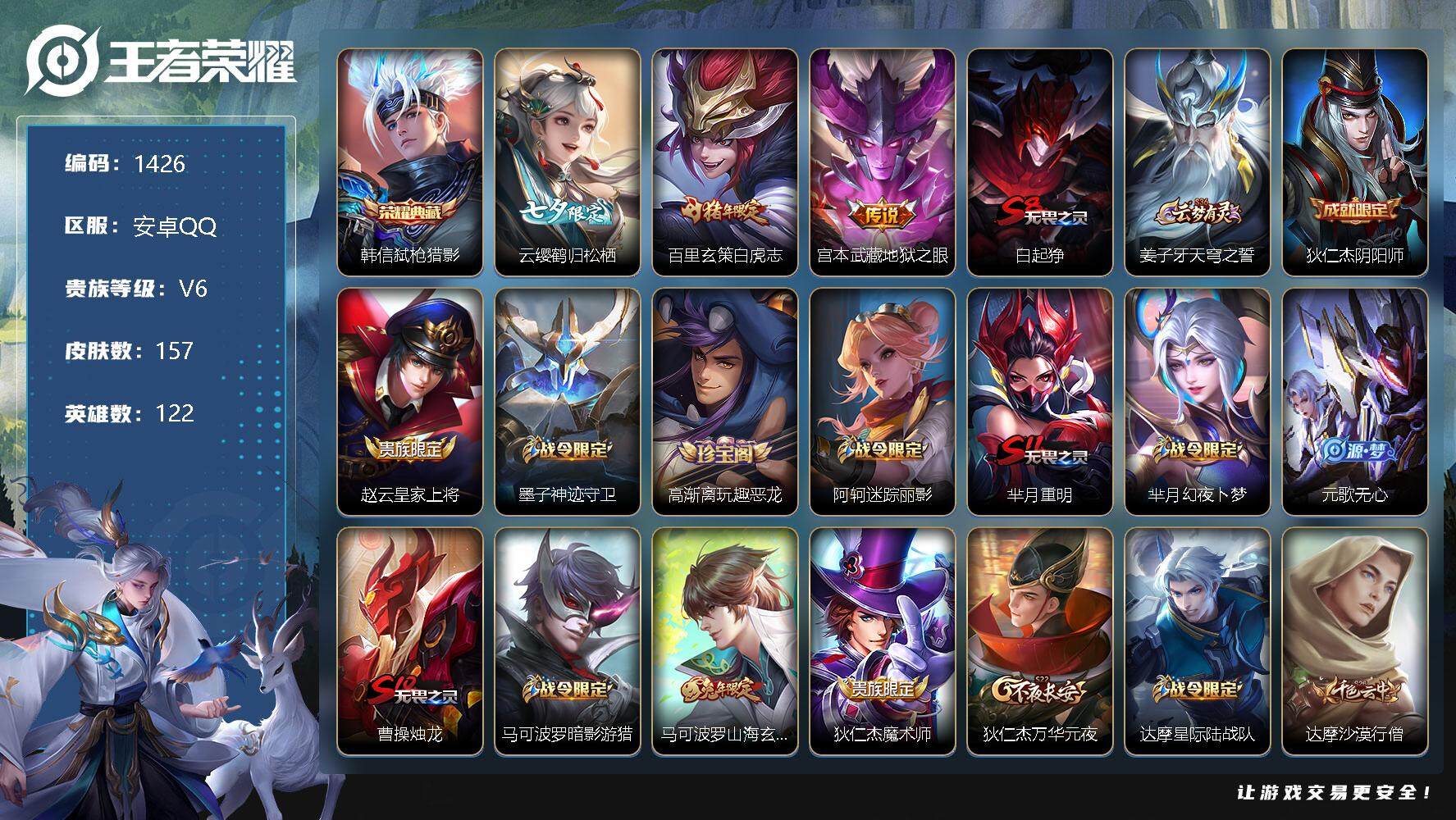 [11563364]【商品标题】:安卓Q-V4-最强王者段位-122英雄-157皮肤-1典藏-0珍品无双-0无双-0珍品传说-3传说-43史诗