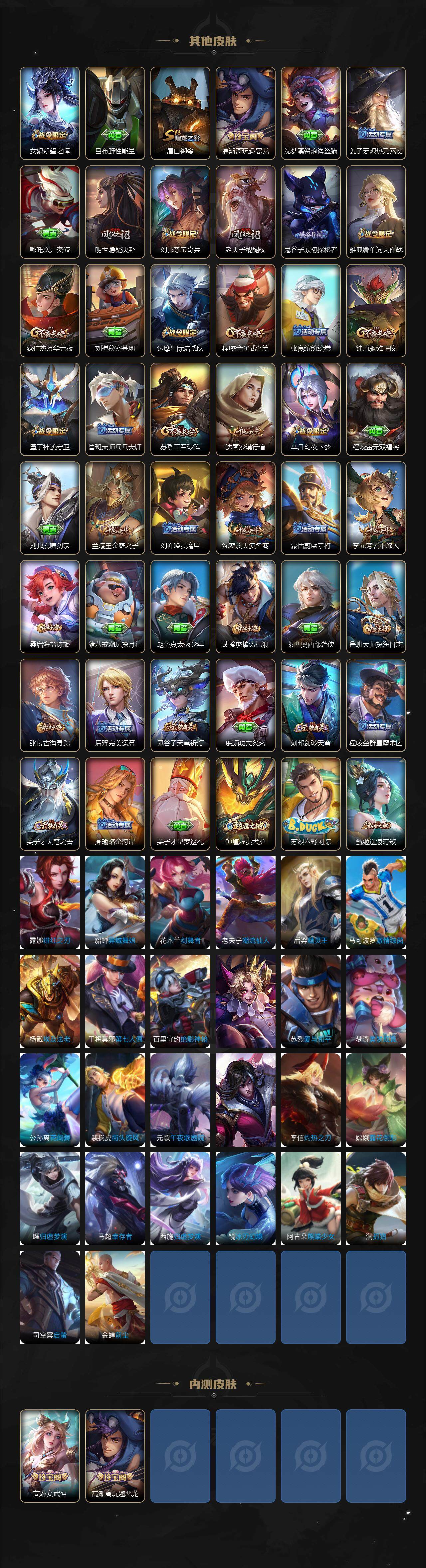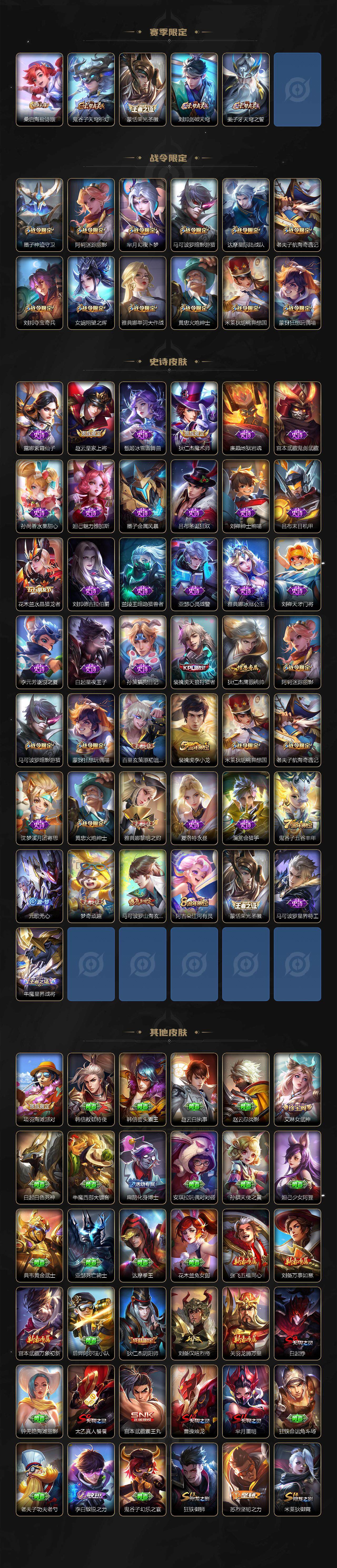 【限定皮肤】:白起狰,姜子牙天穹之誓,狄仁杰阴阳师,赵云皇家上将,墨子神迹守卫,高渐离玩趣恶龙,阿轲迷踪丽影,芈月重明,芈月幻夜卜梦,元歌无心,曹操烛龙,马可波罗暗影游猎,马可波罗山海玄木吟,狄仁杰魔术师,狄仁杰万华元夜,达摩星际陆战队,达摩沙漠行僧,项羽海滩派对,老夫子醍醐杖,老夫子航海奇遇记,程咬金演武夺筹,刘邦夺宝奇兵,兰陵王金庭之子,李元芳云中旅人,钟馗驱傩正仪,女娲朔望之晖,雅典娜单词大作战,雅典娜黎明之约,太乙真人饕餮,鬼谷子原初探秘者,鬼谷子五谷丰年,黄忠火炮绅士,苏烈千军破阵,百里玄策白虎志,百里玄策原初追逐者,梦奇顽趣,沈梦溪大漠名商,明世隐疑决卦,裴擒虎天狼狩猎者,裴擒虎李小龙,裴擒虎擒涛扼浪,狂铁御狮,米莱狄御霄,米莱狄胡桃异想国,盾山御銮,蒙犽狂想玩偶喵,鲁班大师探海日志,桑启海盐诗旅,艾琳女武神,云缨鹤归松栖,阿古朵江河有灵,张良古海寻踪,蒙恬荣光圣徽,鬼谷子天穹祈灯,刘邦剑破天穹,程咬金群星魔术团,周瑜熔金海岸