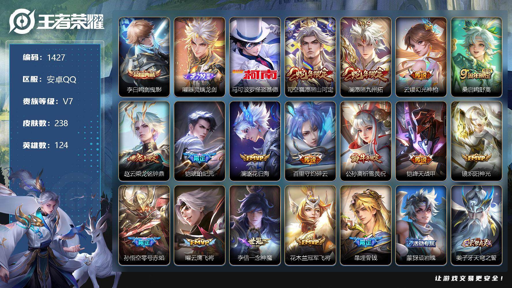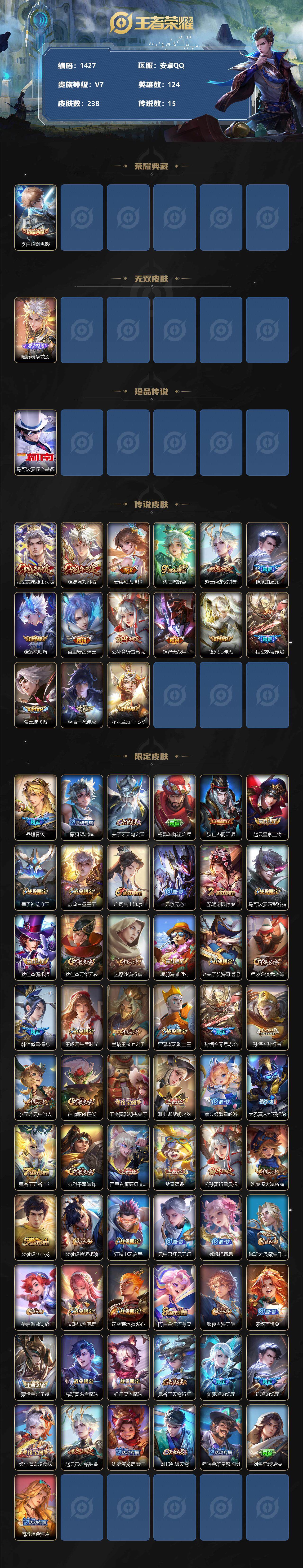 [11563406]【商品标题】:安卓Q-V7-最强王者段位-124英雄-238皮肤-1典藏-0珍品无双-1无双-1珍品传说-15传说-73史诗