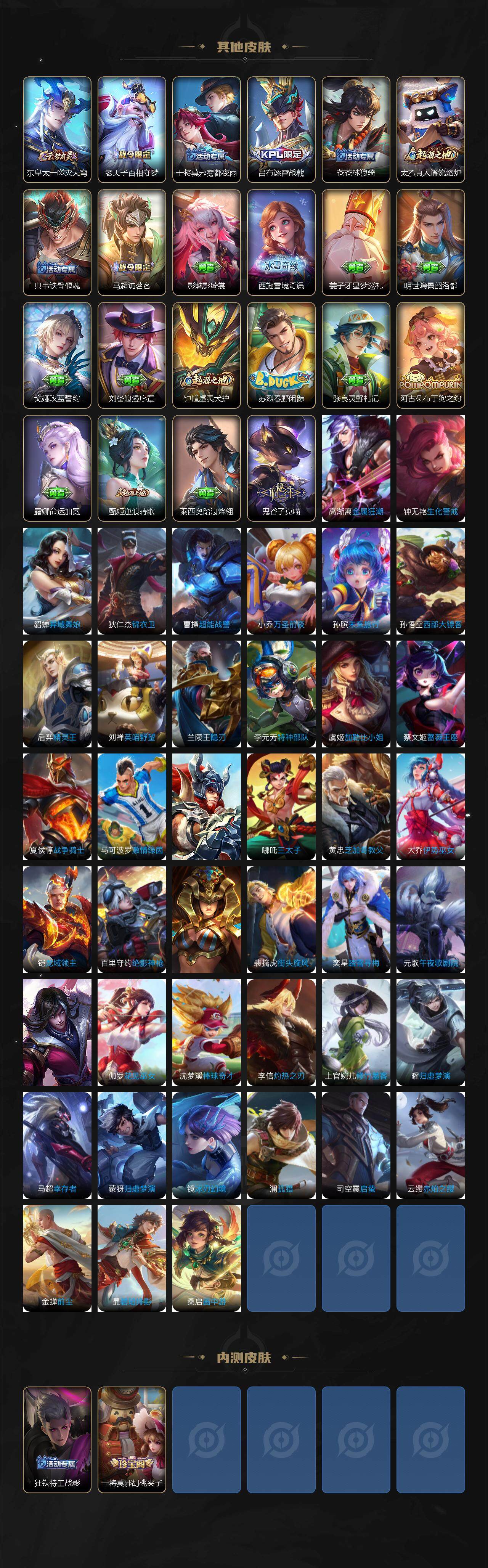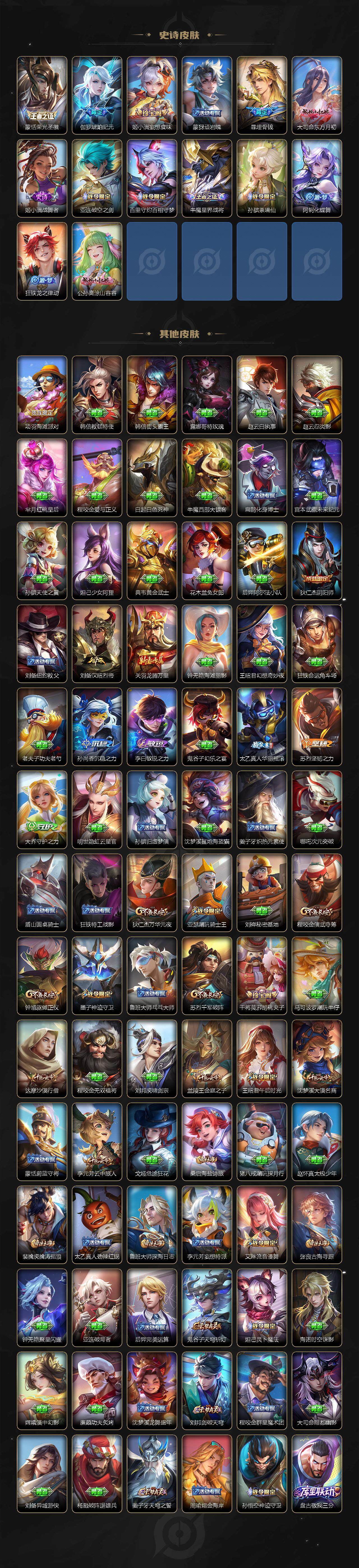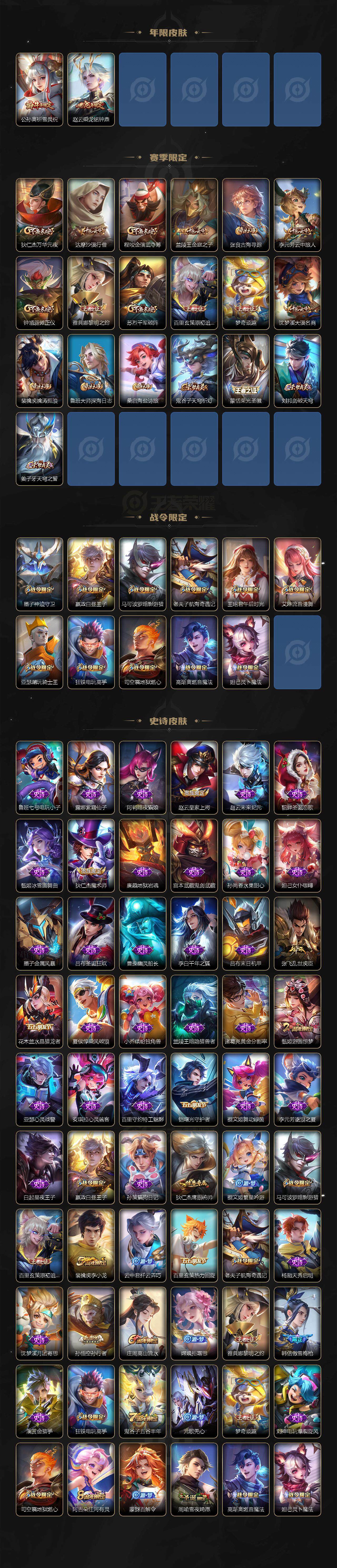 【限定皮肤】:暃埋骨钱,蒙犽顽岩魄,姜子牙天穹之誓,杨戬破阵退雄兵,狄仁杰阴阳师,赵云皇家上将,墨子神迹守卫,嬴政白昼王子,庄周高山流水,元歌无心,甄姬游园惊梦,马可波罗暗影游猎,狄仁杰魔术师,狄仁杰万华元夜,达摩沙漠行僧,项羽海滩派对,老夫子航海奇遇记,程咬金演武夺筹,韩信傲雪梅枪,王昭君午后时光,兰陵王金庭之子,亚瑟潮玩骑士王,孙悟空零号赤焰,孙悟空孙行者,李元芳云中旅人,钟馗驱傩正仪,干将莫邪胡桃夹子,雅典娜黎明之约,蔡文姬繁星吟游,太乙真人华丽摇滚,鬼谷子五谷丰年,苏烈千军破阵,百里玄策原初追逐者,梦奇顽趣,公孙离祈雪灵祝,沈梦溪大漠名商,裴擒虎李小龙,裴擒虎擒涛扼浪,狂铁电玩高手,云中君纤云弄巧,嫦娥拒霜思,鲁班大师探海日志,桑启海盐诗旅,艾琳流音漫舞,司空震地狱燃心,阿古朵江河有灵,张良古海寻踪,蒙犽百解令,蒙恬荣光圣徽,高渐离燃音魔法,妲己灵卜魔法,鬼谷子天穹祈灯,伽罗琥珀纪元,铠琥珀纪元,姬小满妄想食味,赵云乘龙铭钟鼎,沈梦溪龙舞盛年,刘邦剑破天穹,程咬金群星魔术团,刘备异域游侠,周瑜熔金海岸