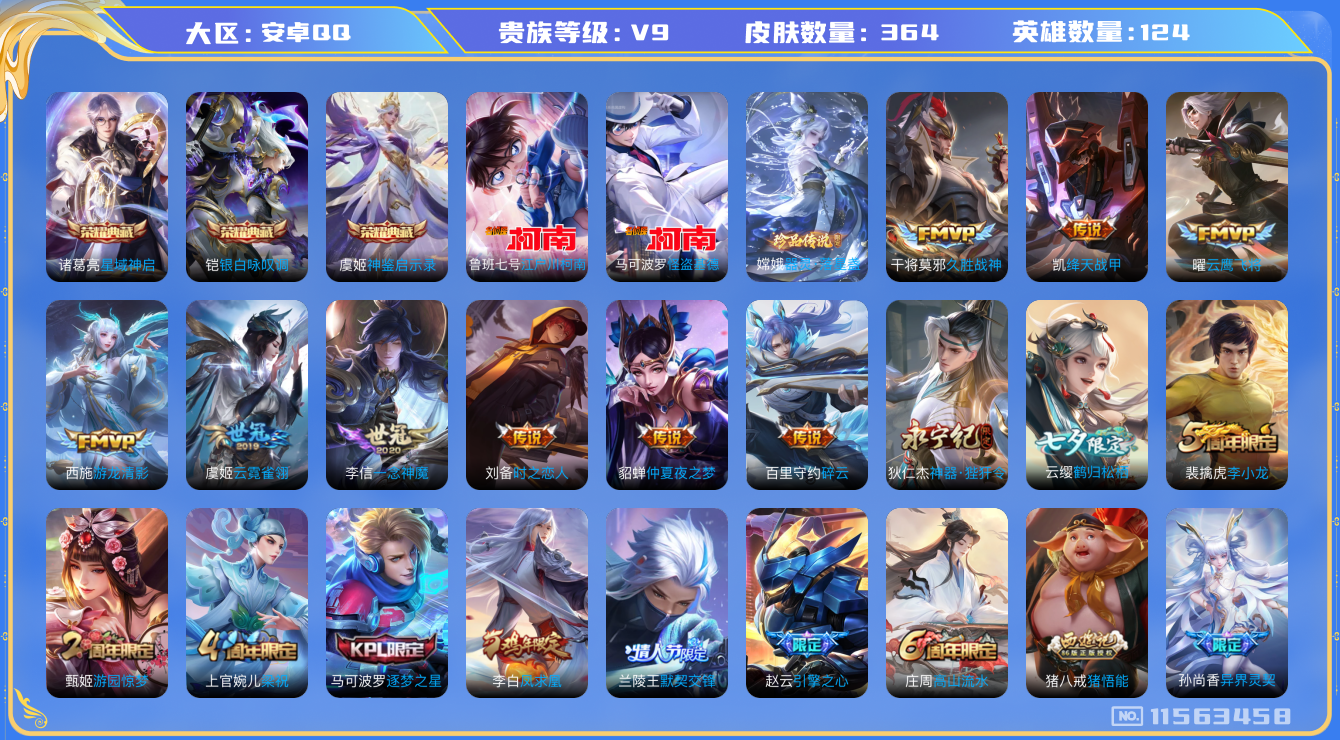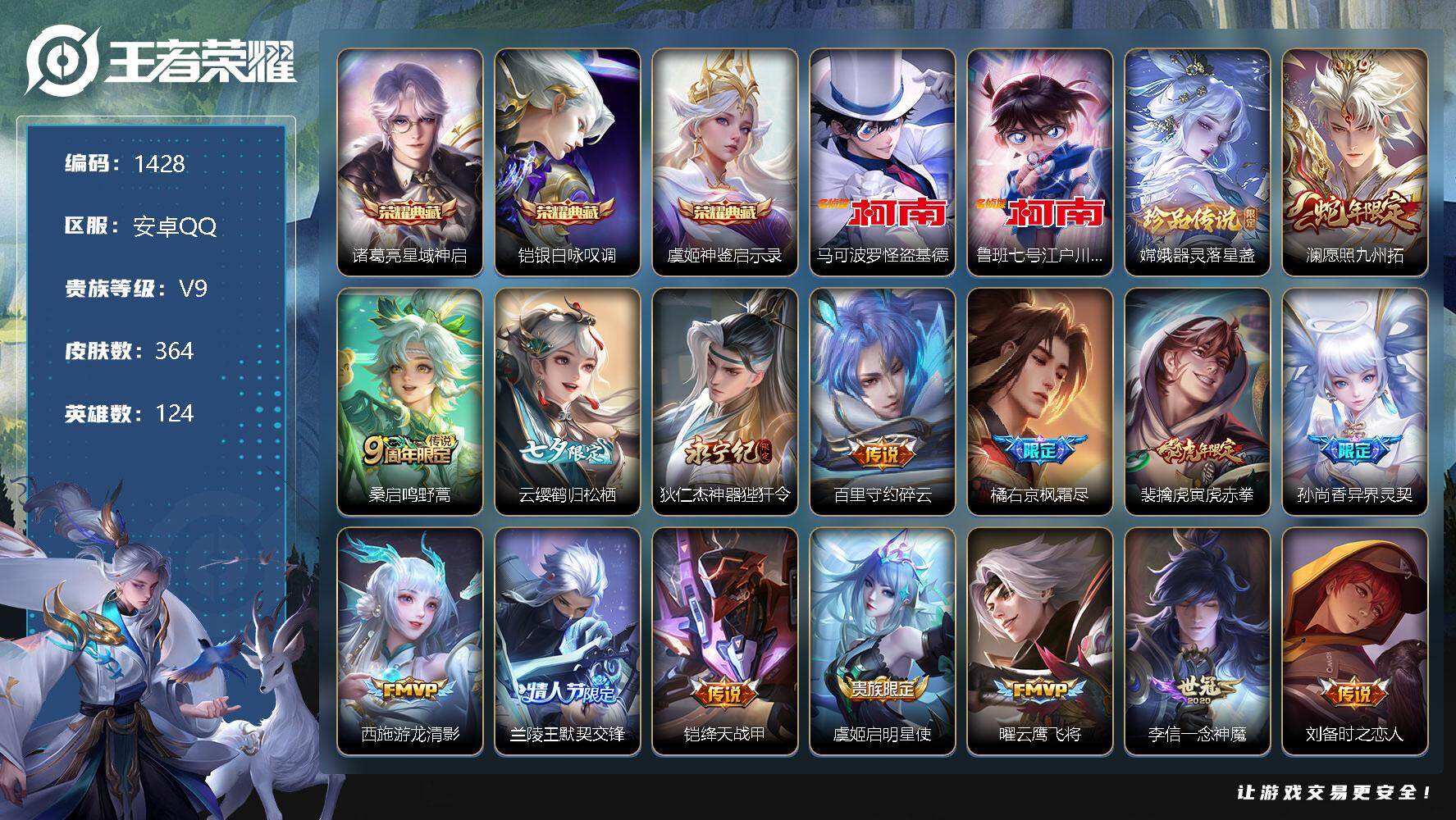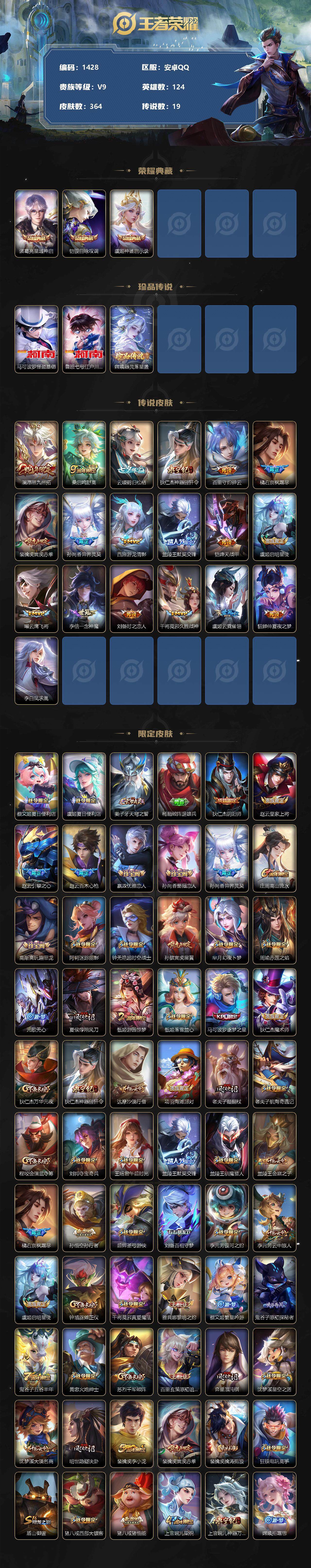 [11563458]【商品标题】:安卓Q-V9-最强王者段位-124英雄-364皮肤-3典藏-0珍品无双-0无双-3珍品传说-19传说-112史诗