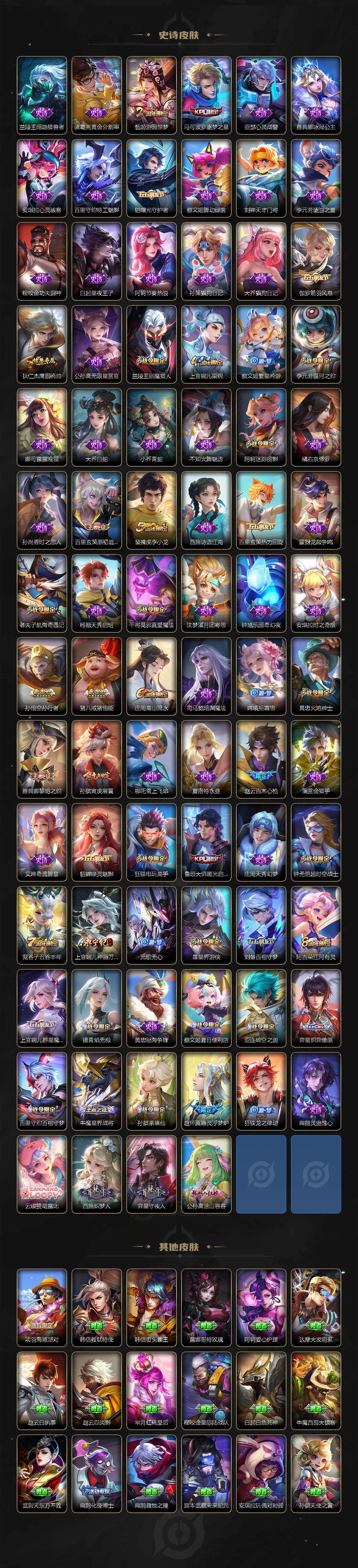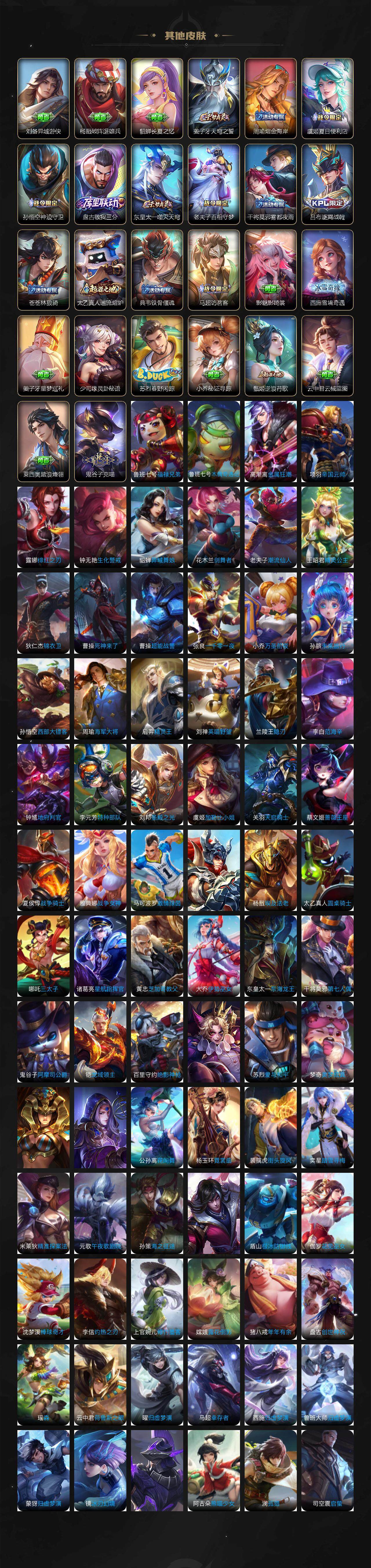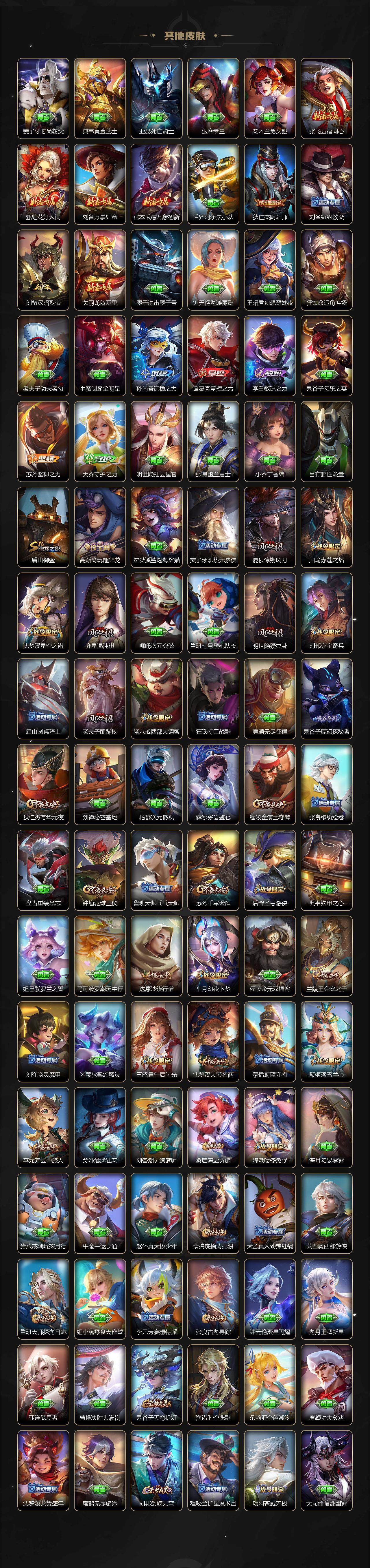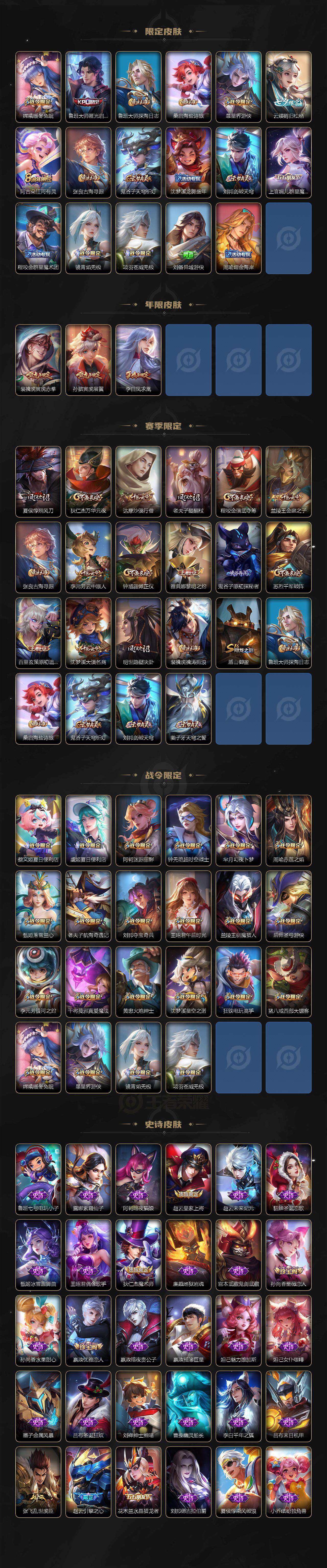 【限定皮肤】:蔡文姬夏日便利店,虞姬夏日便利店,姜子牙天穹之誓,杨戬破阵退雄兵,狄仁杰阴阳师,赵云皇家上将,赵云引擎之心,赵云百木心枪,嬴政优雅恋人,孙尚香蔷薇恋人,孙尚香异界灵契,庄周高山流水,高渐离玩趣恶龙,阿轲迷踪丽影,钟无艳超时空战士,孙膑寅虎展翼,芈月幻夜卜梦,周瑜赤莲之焰,元歌无心,夏侯惇朔风刀,甄姬游园惊梦,甄姬落雪兰心,马可波罗逐梦之星,狄仁杰魔术师,狄仁杰万华元夜,狄仁杰神器狴犴令,达摩沙漠行僧,项羽海滩派对,老夫子醍醐杖,老夫子航海奇遇记,程咬金演武夺筹,刘邦夺宝奇兵,王昭君午后时光,兰陵王默契交锋,兰陵王驯魔猎人,兰陵王金庭之子,橘右京枫霜尽,孙悟空孙行者,后羿圣弓游侠,刘备百相守梦,李元芳银河之约,李元芳云中旅人,虞姬启明星使,钟馗驱傩正仪,干将莫邪真爱魔法,雅典娜黎明之约,蔡文姬繁星吟游,鬼谷子原初探秘者,鬼谷子五谷丰年,黄忠火炮绅士,苏烈千军破阵,百里玄策原初追逐者,弈星混沌棋,沈梦溪星空之诺,沈梦溪大漠名商,明世隐疑决卦,裴擒虎李小龙,裴擒虎寅虎赤拳,裴擒虎擒涛扼浪,狂铁电玩高手,盾山御銮,猪八戒西部大镖客,猪八戒猪悟能,上官婉儿梁祝,上官婉儿神器万象笔,嫦娥拒霜思,嫦娥暖冬兔眠,鲁班大师匿光启智者,鲁班大师探海日志,桑启海盐诗旅,暃星界游侠,云缨鹤归松栖,阿古朵江河有灵,张良古海寻踪,鬼谷子天穹祈灯,沈梦溪龙舞盛年,刘邦剑破天穹,上官婉儿群星魔术团,程咬金群星魔术团,镜青焰无极,项羽苍威无极,刘备异域游侠,周瑜熔金海岸