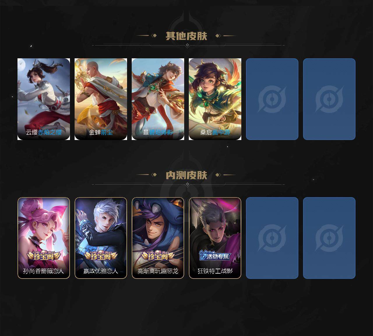 裴擒虎李小龙,上官婉儿梁祝,马可波罗逐梦之星,兰陵王默契交锋,赵云引擎之心,猪八戒猪悟能,孙尚香异界灵契,孙悟空孙行者,孙膑寅虎·展翼,裴擒虎寅虎·赤拳,赵云百木心枪,橘右京枫霜尽,鲁班大师匿光启智者,上官婉儿神器·万象笔,桑启鸣野蒿,澜愿照·九州拓