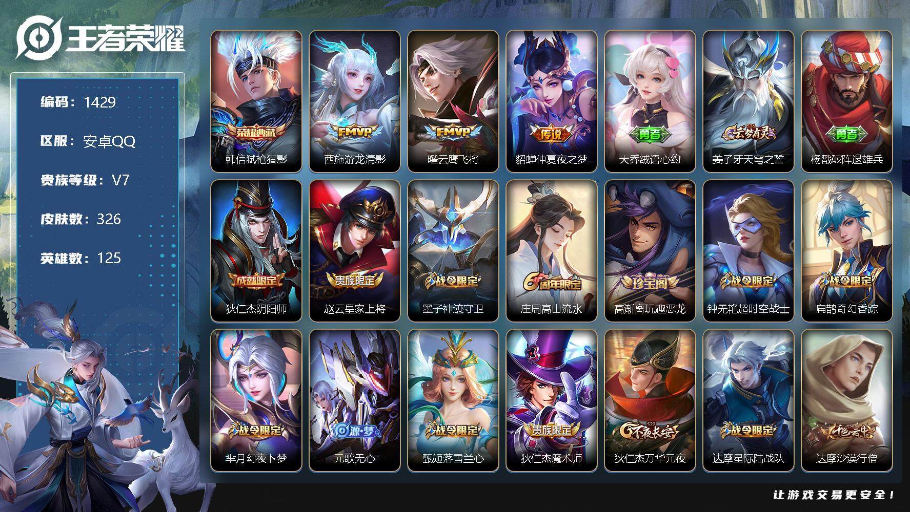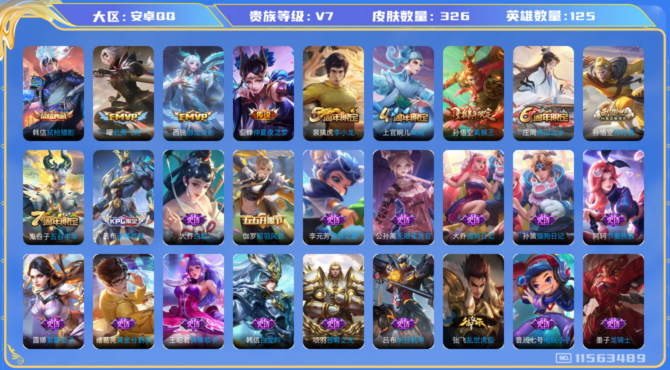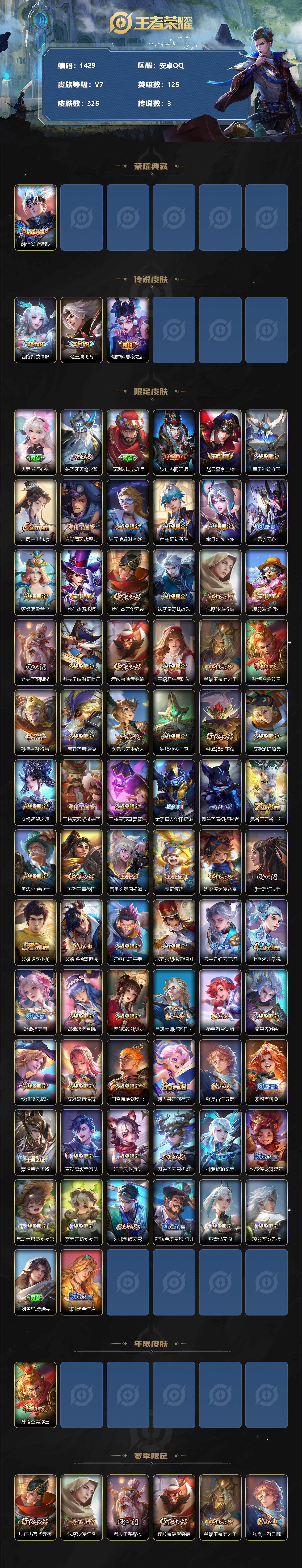 [11563489]【商品标题】:安卓Q-V7-永恒钻石II段位-125英雄-326皮肤-1典藏-0珍品无双-0无双-0珍品传说-3传说-84史诗
