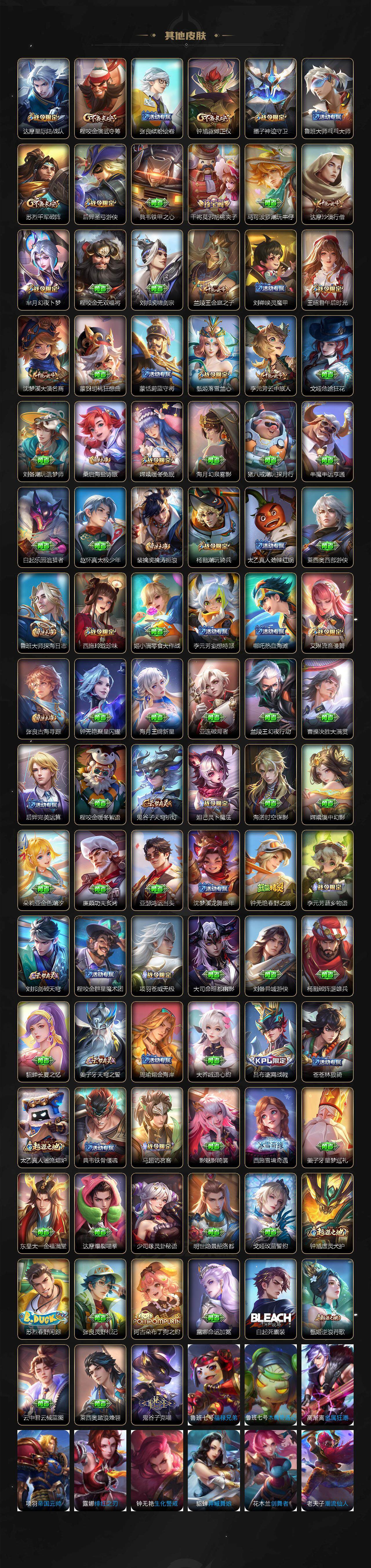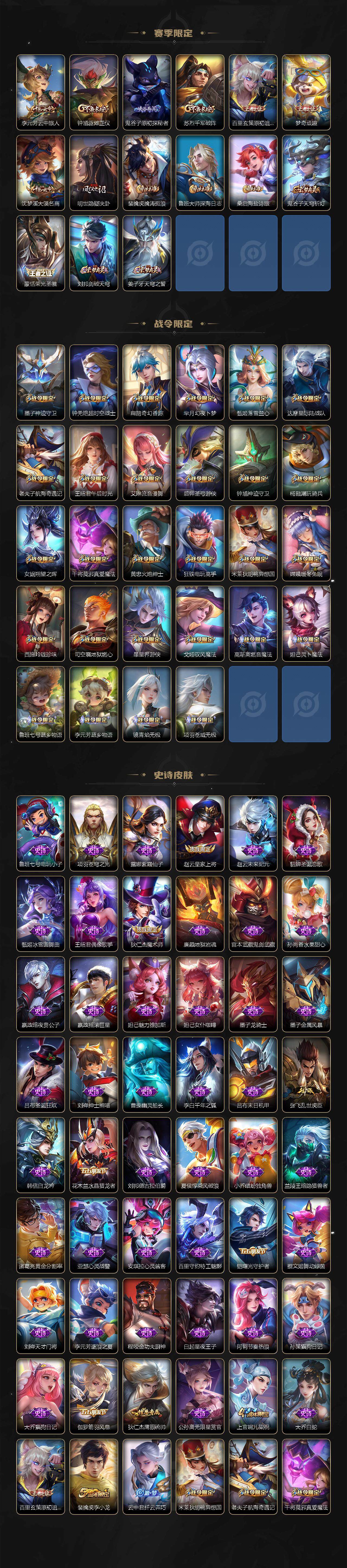 【赛季限定】:狄仁杰万华元夜,达摩沙漠行僧,老夫子醍醐杖,程咬金演武夺筹,兰陵王金庭之子,张良古海寻踪,李元芳云中旅人,钟馗驱傩正仪,鬼谷子原初探秘者,苏烈千军破阵,百里玄策原初追逐者,梦奇顽趣,沈梦溪大漠名商,明世隐疑决卦,裴擒虎擒涛扼浪,鲁班大师探海日志,桑启海盐诗旅,鬼谷子天穹祈灯,蒙恬荣光圣徽,刘邦剑破天穹,姜子牙天穹之誓