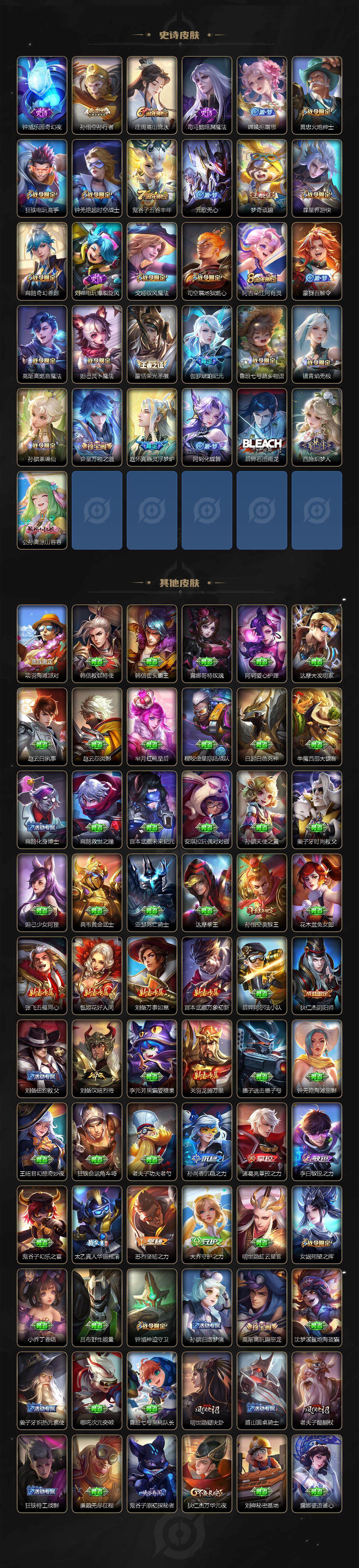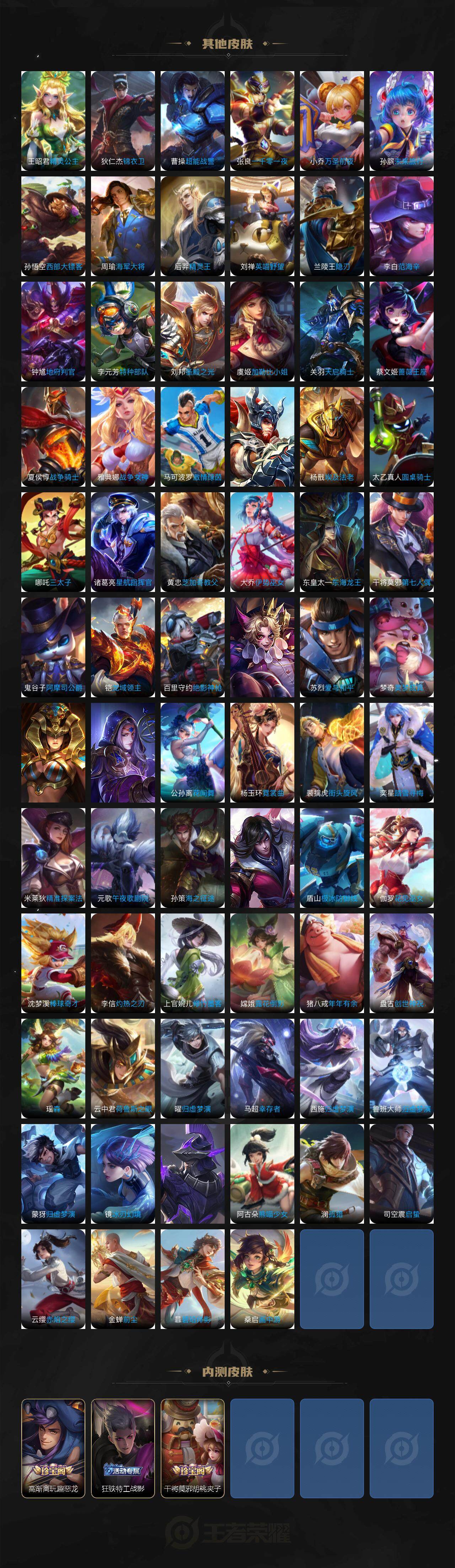 【限定皮肤】:大乔绒语心约,姜子牙天穹之誓,杨戬破阵退雄兵,狄仁杰阴阳师,赵云皇家上将,墨子神迹守卫,庄周高山流水,高渐离玩趣恶龙,钟无艳超时空战士,扁鹊奇幻香踪,芈月幻夜卜梦,元歌无心,甄姬落雪兰心,狄仁杰魔术师,狄仁杰万华元夜,达摩星际陆战队,达摩沙漠行僧,项羽海滩派对,老夫子醍醐杖,老夫子航海奇遇记,程咬金演武夺筹,王昭君午后时光,兰陵王金庭之子,孙悟空美猴王,孙悟空孙行者,后羿圣弓游侠,李元芳云中旅人,钟馗神迹守卫,钟馗驱傩正仪,杨戬潮玩骑兵,女娲朔望之晖,干将莫邪胡桃夹子,干将莫邪真爱魔法,太乙真人华丽摇滚,鬼谷子原初探秘者,鬼谷子五谷丰年,黄忠火炮绅士,苏烈千军破阵,百里玄策原初追逐者,梦奇顽趣,沈梦溪大漠名商,明世隐疑决卦,裴擒虎李小龙,裴擒虎擒涛扼浪,狂铁电玩高手,米莱狄胡桃异想国,云中君纤云弄巧,上官婉儿梁祝,嫦娥拒霜思,嫦娥暖冬兔眠,西施玲珑珍味,鲁班大师探海日志,桑启海盐诗旅,暃星界游侠,戈娅驭风魔法,艾琳流音漫舞,司空震地狱燃心,阿古朵江河有灵,张良古海寻踪,蒙犽百解令,蒙恬荣光圣徽,高渐离燃音魔法,妲己灵卜魔法,鬼谷子天穹祈灯,伽罗琥珀纪元,沈梦溪龙舞盛年,鲁班七号蔬乡物语,李元芳蔬乡物语,刘邦剑破天穹,程咬金群星魔术团,镜青焰无极,项羽苍威无极,刘备异域游侠,周瑜熔金海岸