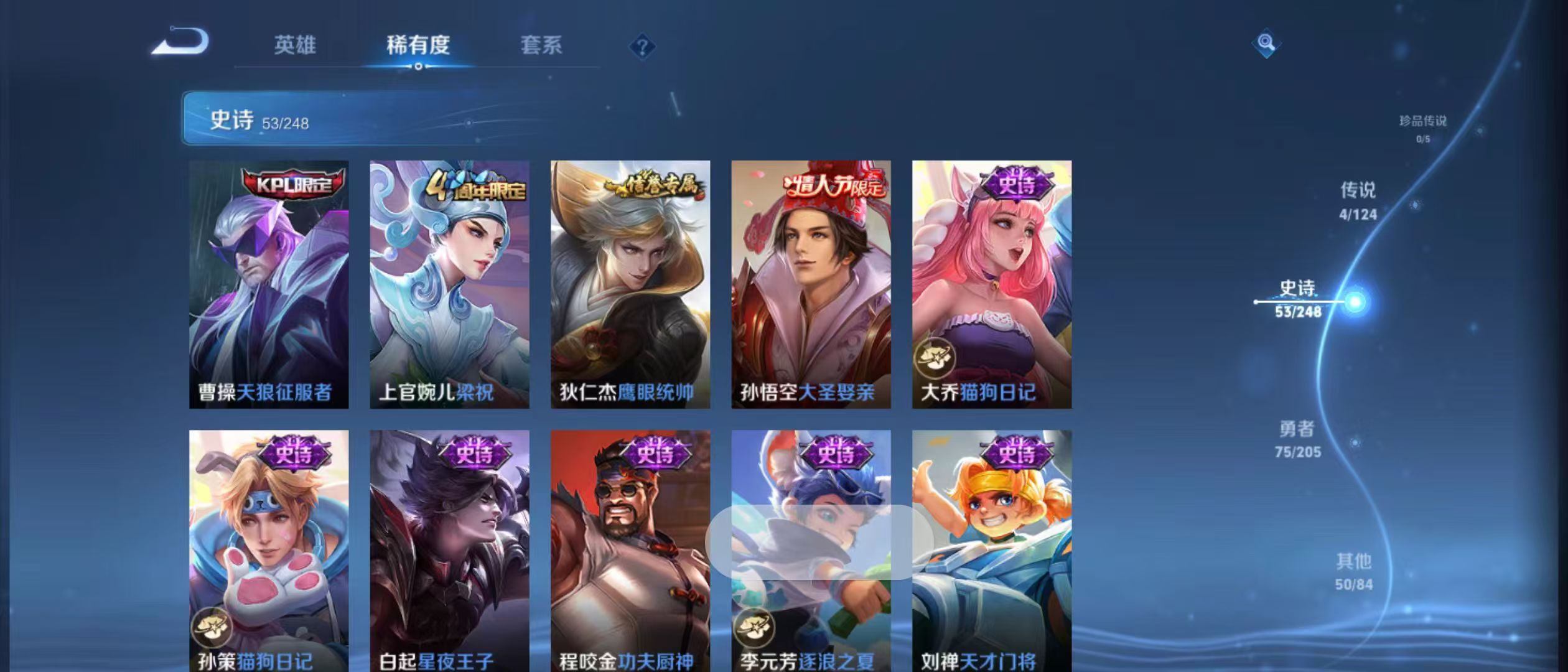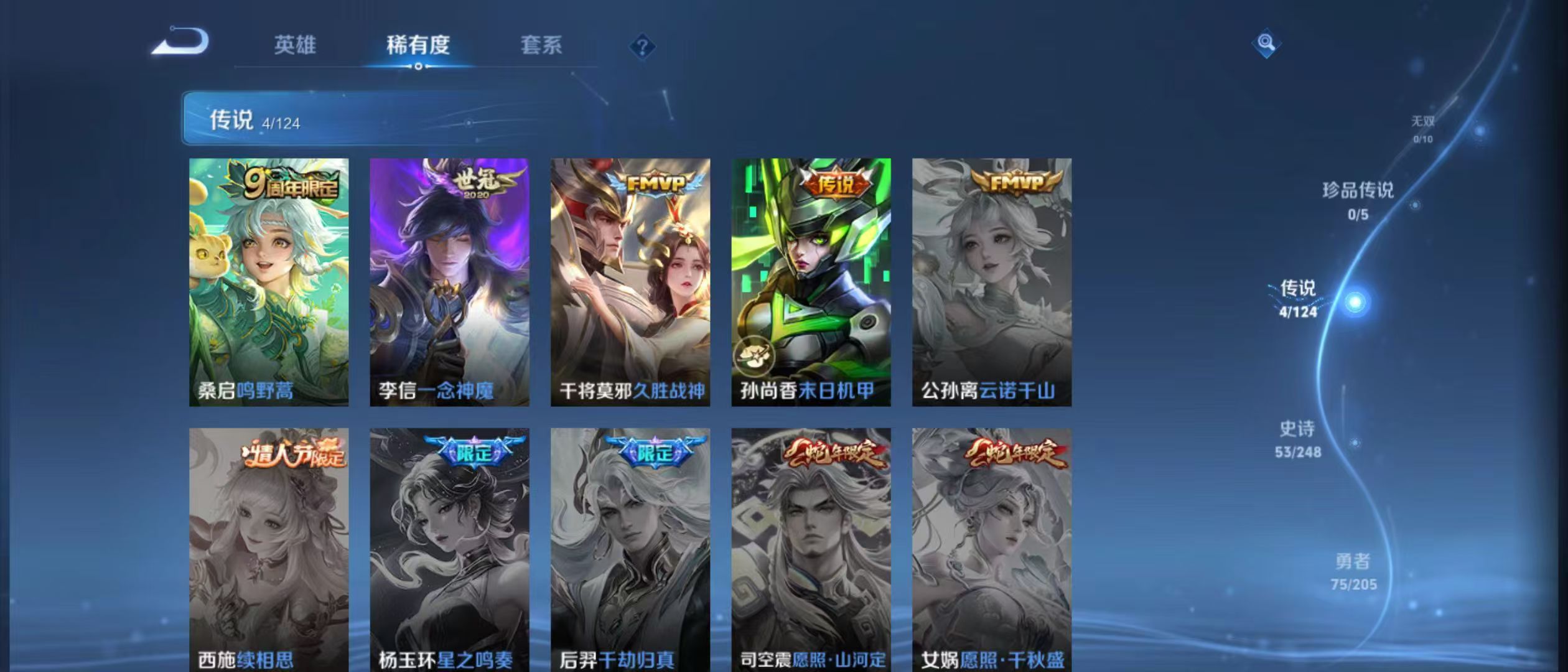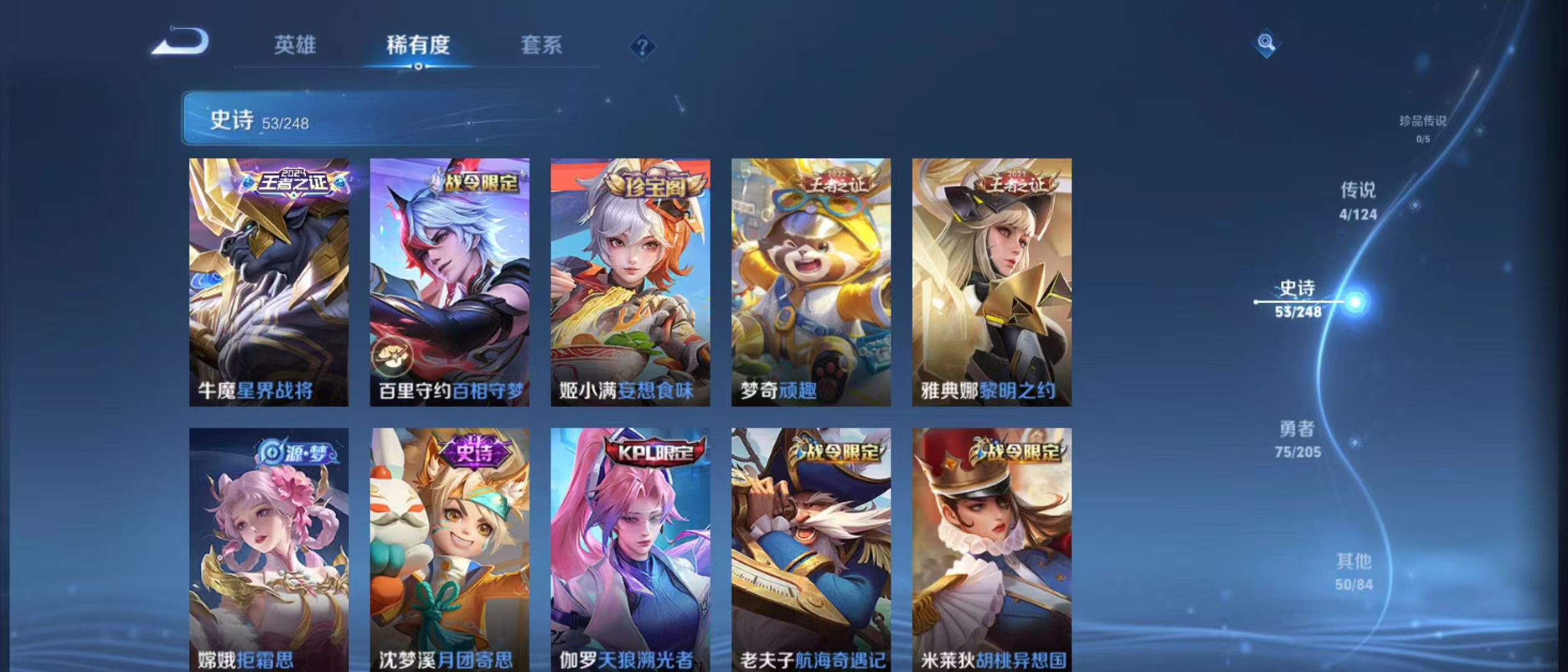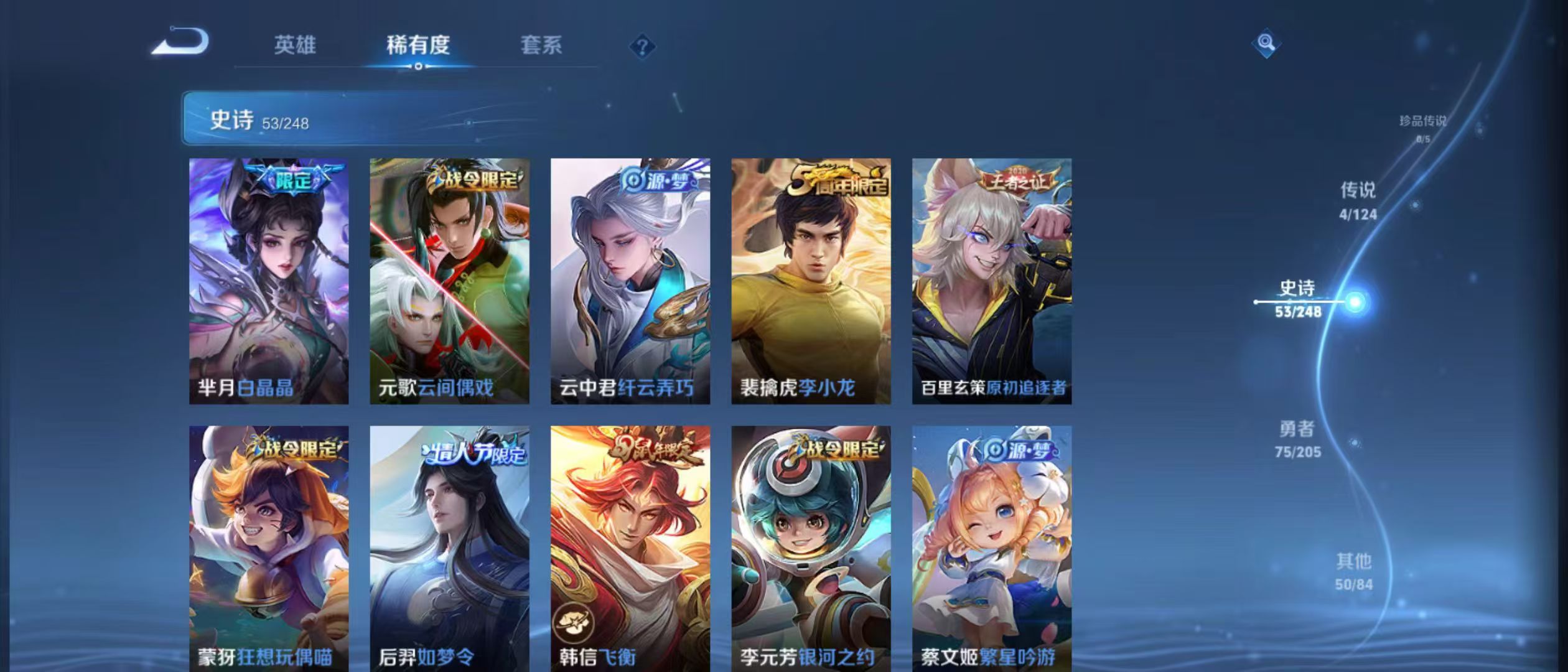 - PX_2096203-77 安卓QQ/最强王者/171皮肤/123英雄/2典藏/0珍品无双/0无双/0珍品传说/10传说/50史诗/7稀有英雄 【2 典藏皮肤】鸣剑·曳影 李白,九霄神辉 花木兰, 【10 传说皮肤】逐花归海 澜,无双飞将 马超,零号·赤焰 孙悟空,云鹰飞将 曜,山海·炽霜斩 李信,一念神魔 李信,琥珀纪元 铠,琥珀纪元 马超,祥瑞亨通 裴擒虎,鸣野蒿 桑启, 【50 史诗皮肤】末