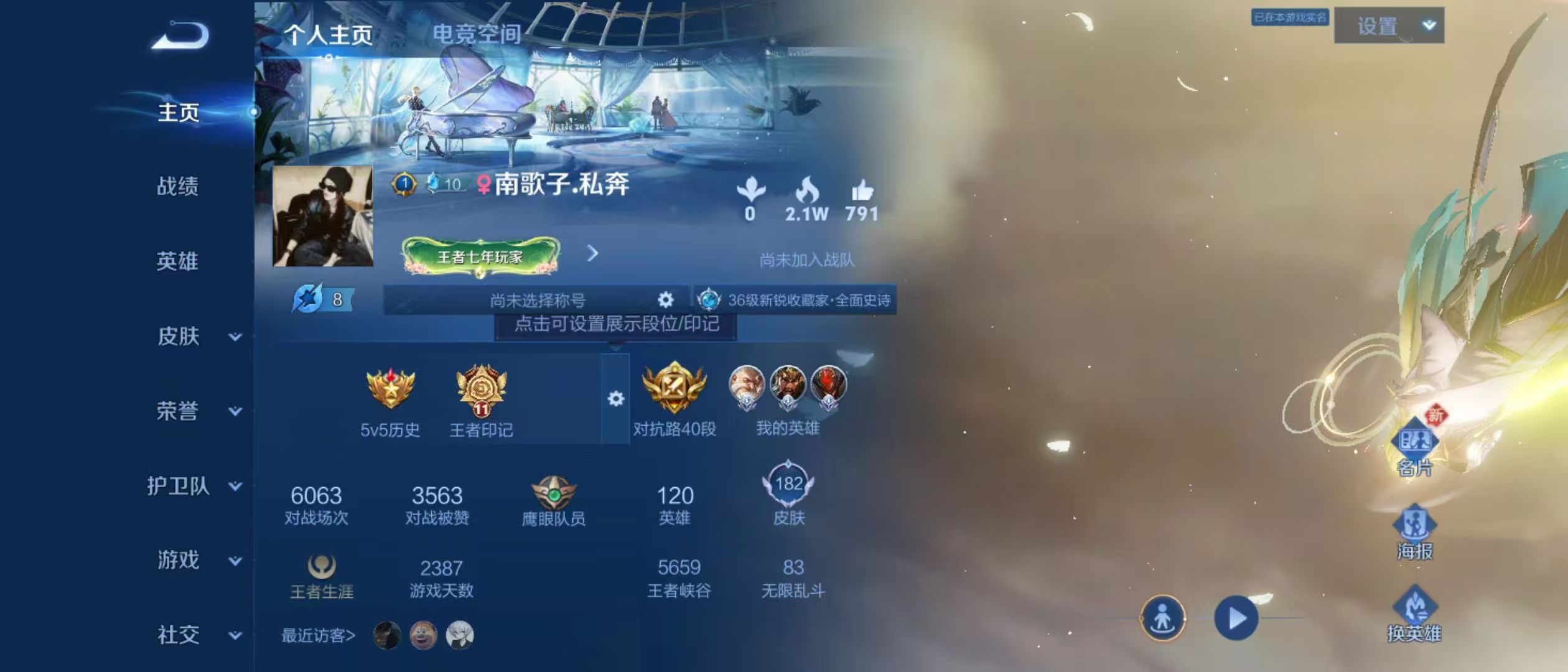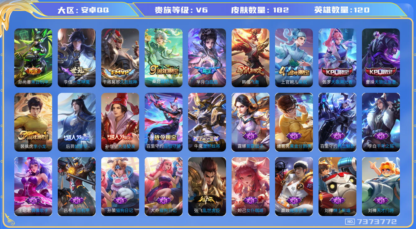 [7373772]实名: 不可修改 贵族等级: V6 英雄数: 120 皮肤数: 182 传说皮: 久胜战神,一念神魔,末日机甲-孙尚香 限定皮: 李小龙,梁祝,白晶晶,天狼溯光者,飞衡,天狼征服者,如梦令-后羿,大圣娶亲,鸣野蒿