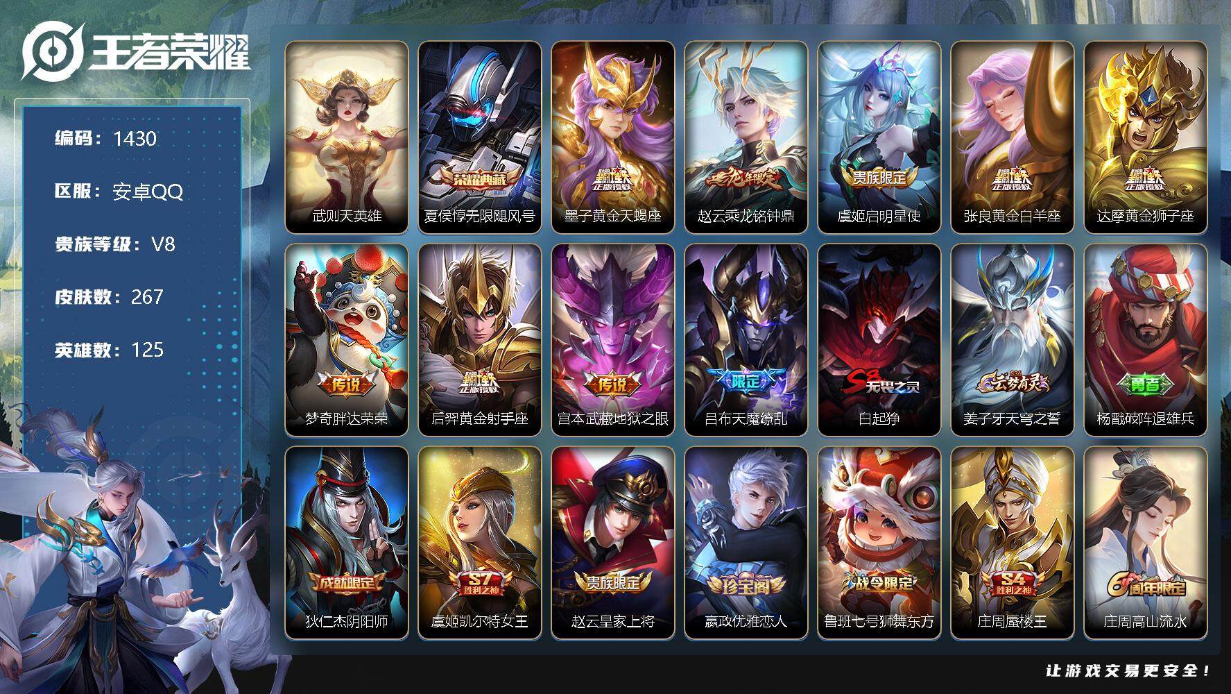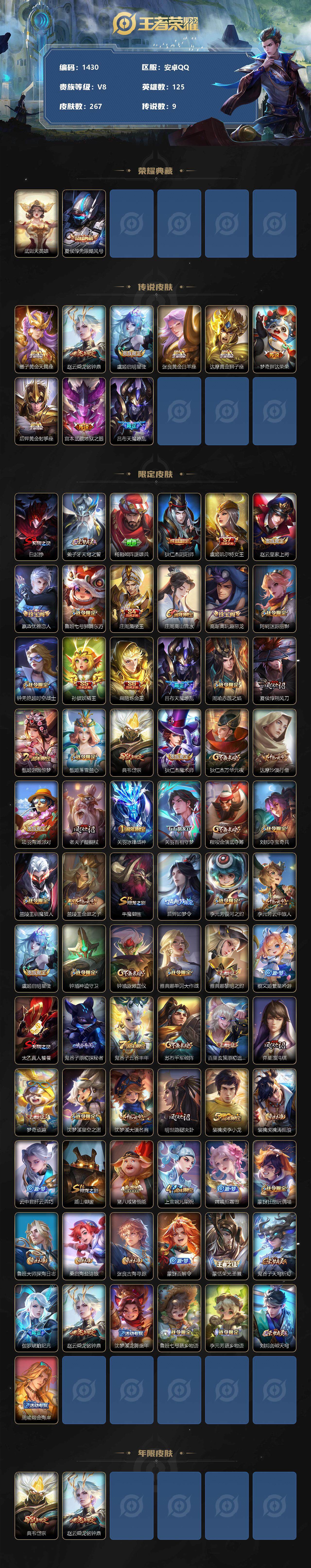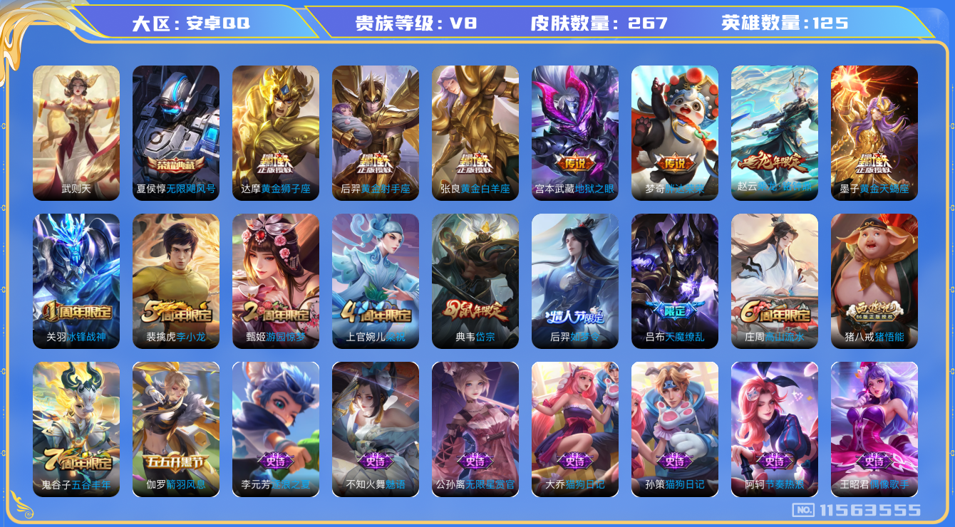 [11563555]【商品标题】:安卓Q-V8-最强王者段位-125英雄-267皮肤-1典藏-0珍品无双-0无双-0珍品传说-9传说-73史诗
