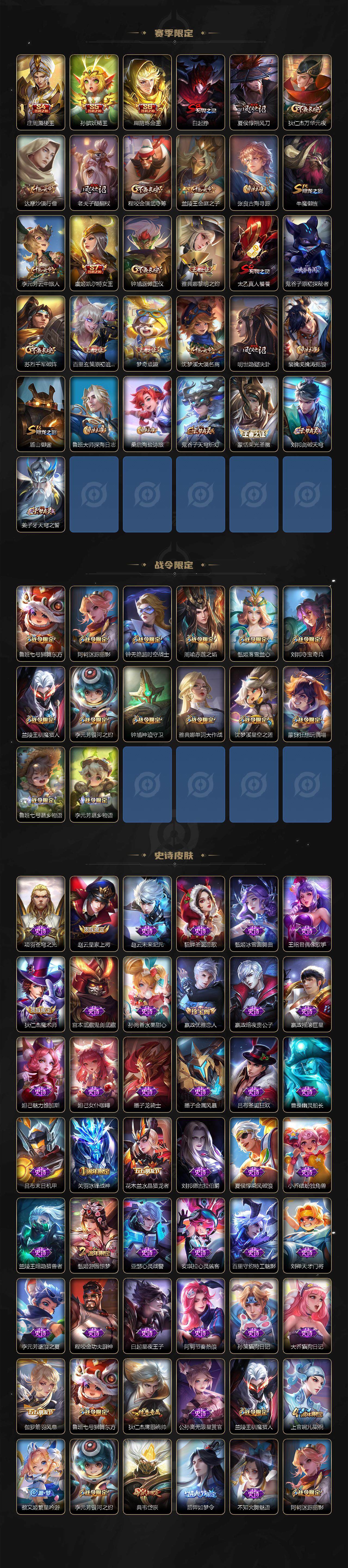 【赛季限定】:庄周蜃楼王,孙膑妖精王,扁鹊炼金王,白起狰,夏侯惇朔风刀,狄仁杰万华元夜,达摩沙漠行僧,老夫子醍醐杖,程咬金演武夺筹,兰陵王金庭之子,张良古海寻踪,牛魔御旌,李元芳云中旅人,虞姬凯尔特女王,钟馗驱傩正仪,雅典娜黎明之约,太乙真人饕餮,鬼谷子原初探秘者,苏烈千军破阵,百里玄策原初追逐者,弈星混沌棋,梦奇顽趣,沈梦溪大漠名商,明世隐疑决卦,裴擒虎擒涛扼浪,盾山御銮,鲁班大师探海日志,桑启海盐诗旅,鬼谷子天穹祈灯,蒙恬荣光圣徽,刘邦剑破天穹,姜子牙天穹之誓
