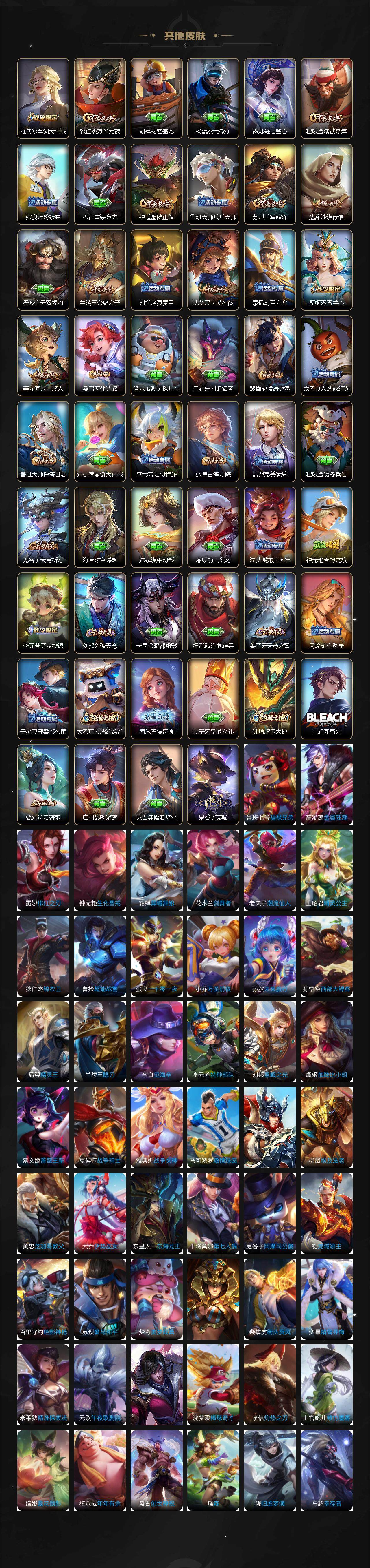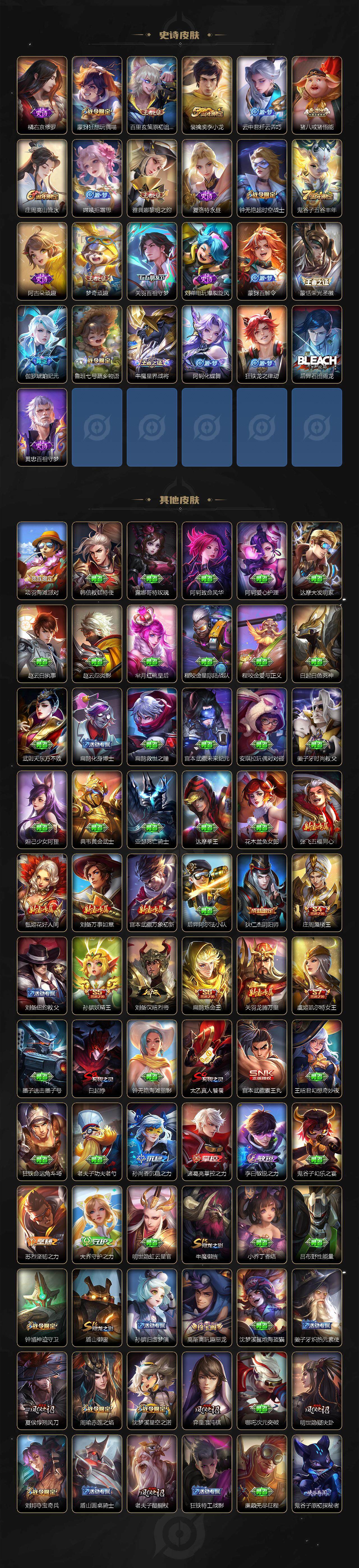 【限定皮肤】:白起狰,姜子牙天穹之誓,杨戬破阵退雄兵,狄仁杰阴阳师,虞姬凯尔特女王,赵云皇家上将,嬴政优雅恋人,鲁班七号狮舞东方,庄周蜃楼王,庄周高山流水,高渐离玩趣恶龙,阿轲迷踪丽影,钟无艳超时空战士,孙膑妖精王,扁鹊炼金王,吕布天魔缭乱,周瑜赤莲之焰,夏侯惇朔风刀,甄姬游园惊梦,甄姬落雪兰心,典韦岱宗,狄仁杰魔术师,狄仁杰万华元夜,达摩沙漠行僧,项羽海滩派对,老夫子醍醐杖,关羽冰锋战神,关羽百相守梦,程咬金演武夺筹,刘邦夺宝奇兵,兰陵王驯魔猎人,兰陵王金庭之子,牛魔御旌,后羿如梦令,李元芳银河之约,李元芳云中旅人,虞姬启明星使,钟馗神迹守卫,钟馗驱傩正仪,雅典娜单词大作战,雅典娜黎明之约,蔡文姬繁星吟游,太乙真人饕餮,鬼谷子原初探秘者,鬼谷子五谷丰年,苏烈千军破阵,百里玄策原初追逐者,弈星混沌棋,梦奇顽趣,沈梦溪星空之诺,沈梦溪大漠名商,明世隐疑决卦,裴擒虎李小龙,裴擒虎擒涛扼浪,云中君纤云弄巧,盾山御銮,猪八戒猪悟能,上官婉儿梁祝,嫦娥拒霜思,蒙犽狂想玩偶喵,鲁班大师探海日志,桑启海盐诗旅,张良古海寻踪,蒙犽百解令,蒙恬荣光圣徽,鬼谷子天穹祈灯,伽罗琥珀纪元,赵云乘龙铭钟鼎,沈梦溪龙舞盛年,鲁班七号蔬乡物语,李元芳蔬乡物语,刘邦剑破天穹,周瑜熔金海岸