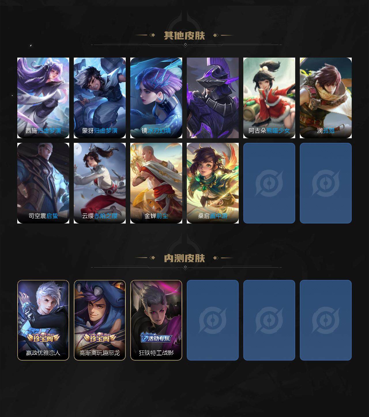 伽罗箭羽风息,李元芳逐浪之夏,不知火舞魅语,公孙离无限星赏官,大乔猫狗日记,孙策猫狗日记,阿轲节奏热浪,王昭君偶像歌手,项羽苍穹之光,吕布末日机甲,橘右京修罗,墨子龙骑士,嬴政摇滚巨星,刘禅天才门将,白起星夜王子,安琪拉心灵骇客,程咬金功夫厨神,刘邦德古拉伯爵,兰陵王暗隐猎兽者,曹操幽灵船长,宫本武藏鬼剑武藏,亚瑟心灵战警,小乔缤纷独角兽,夏侯惇乘风破浪,花木兰水晶猎龙者,墨子金属风暴,百里玄策原初追逐者,吕布圣诞狂欢,貂蝉圣诞恋歌,百里守约特工魅影,嬴政暗夜贵公子,嫦娥拒霜思,雅典娜黎明之约,夏洛特永昼,阿古朵顽趣,关羽百相守梦,刘禅电玩·爆裂旋风,蒙犽百解令,伽罗琥珀纪元