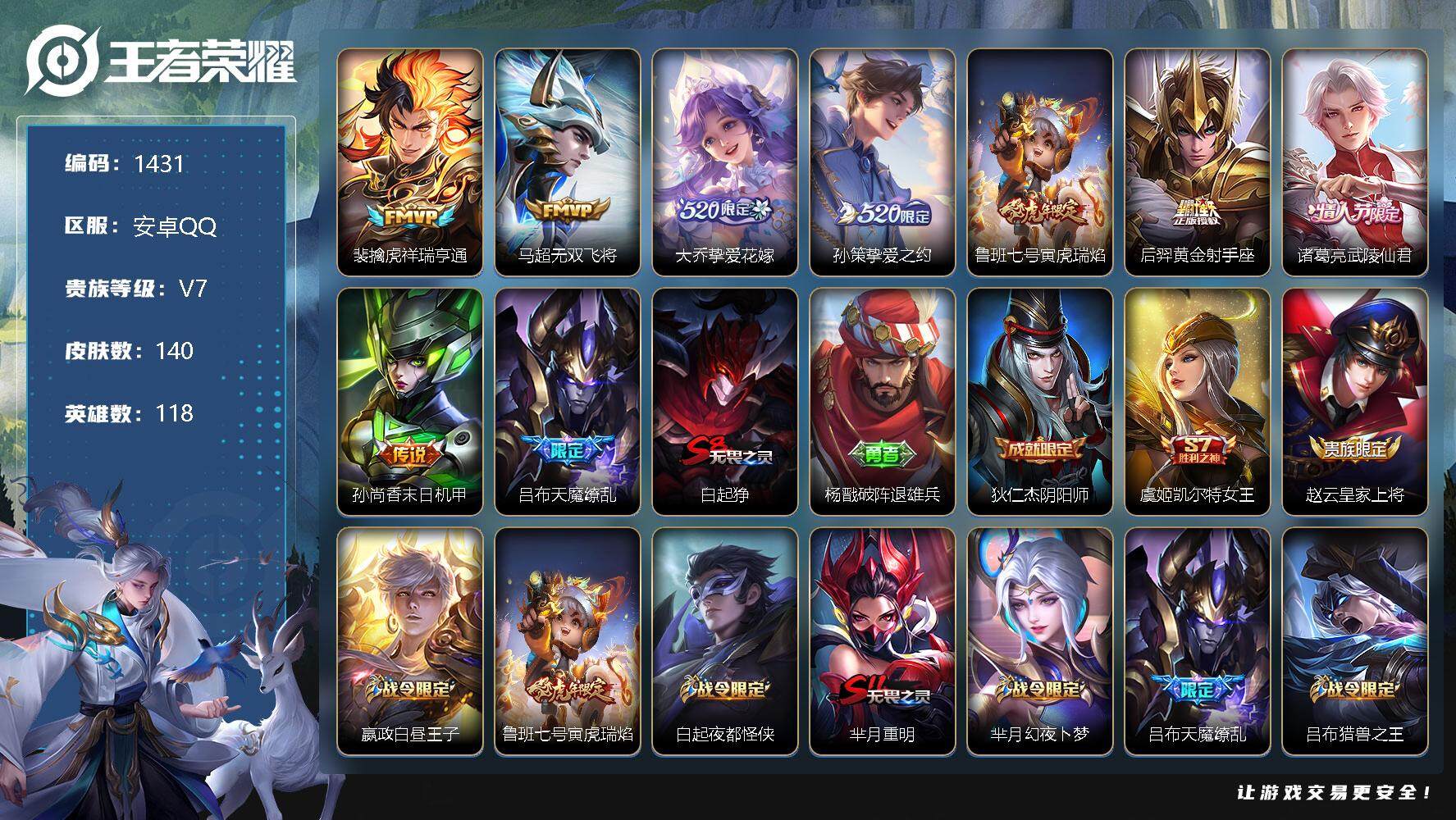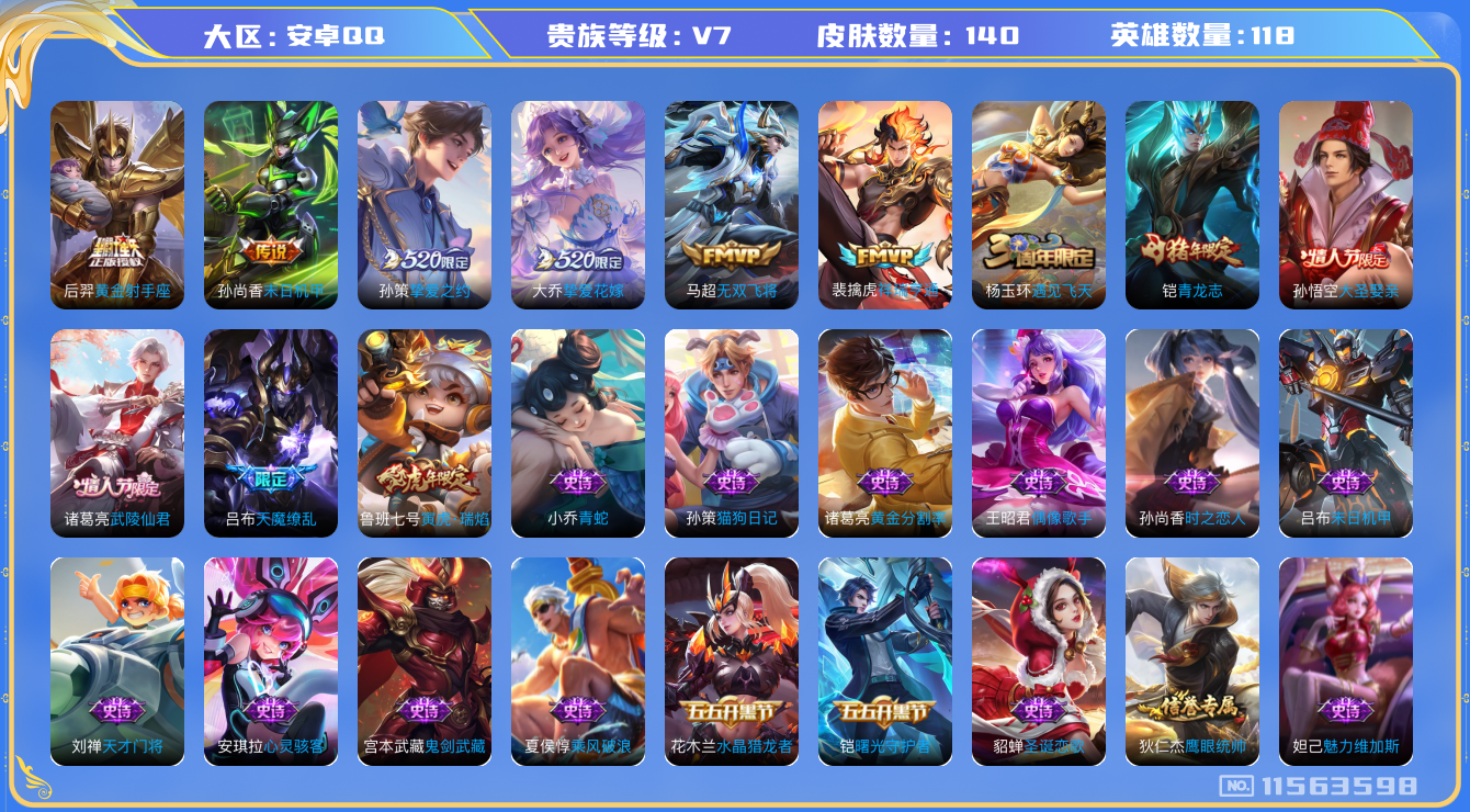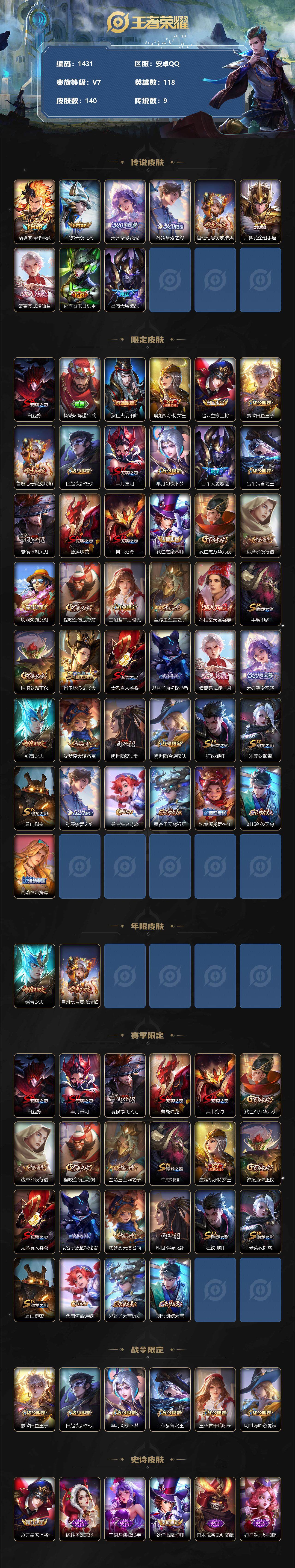 [11563598]【商品标题】:安卓Q-V1-永恒钻石III段位-118英雄-140皮肤-0典藏-0珍品无双-0无双-0珍品传说-9传说-24史诗