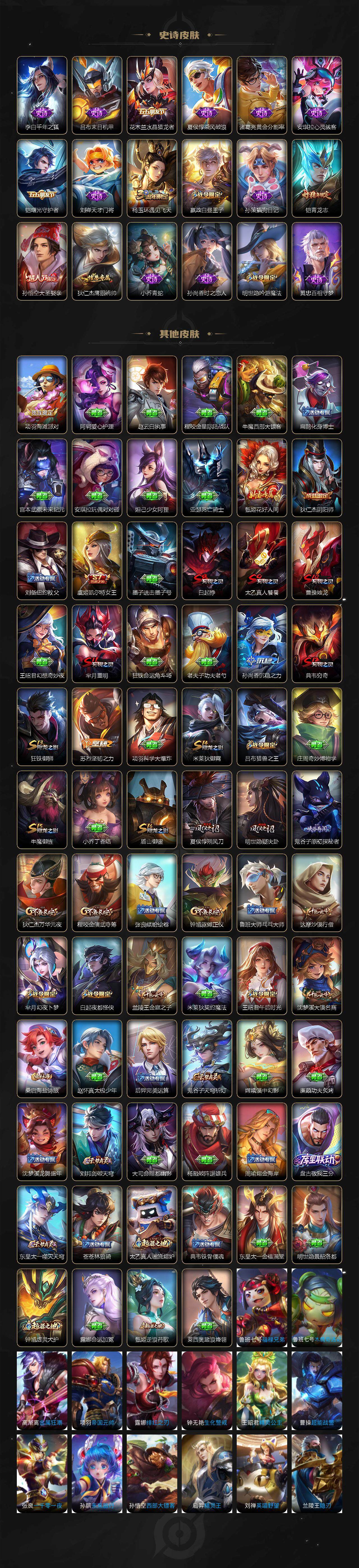 【史诗皮肤】:赵云皇家上将,貂蝉圣诞恋歌,王昭君偶像歌手,狄仁杰魔术师,宫本武藏鬼剑武藏,妲己魅力维加斯,李白千年之狐,吕布末日机甲,花木兰水晶猎龙者,夏侯惇乘风破浪,诸葛亮黄金分割率,安琪拉心灵骇客,铠曙光守护者,刘禅天才门将,杨玉环遇见飞天,嬴政白昼王子,孙策猫狗日记,铠青龙志,孙悟空大圣娶亲,狄仁杰鹰眼统帅,小乔青蛇,孙尚香时之恋人,明世隐吟游魔法,黄忠百相守梦