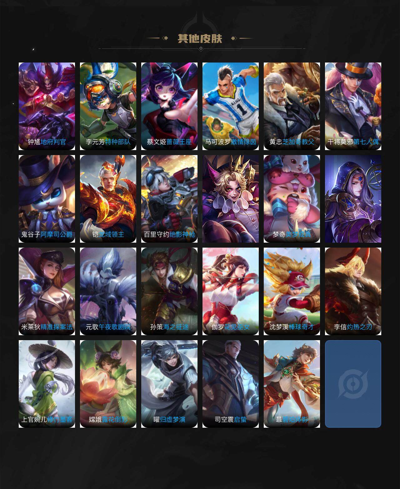 【其他皮肤】:项羽海滩派对,阿轲爱心护理,赵云白执事,程咬金星际陆战队,牛魔西部大镖客,扁鹊化身博士,宫本武藏未来纪元,安琪拉玩偶对对碰,妲己少女阿狸,亚瑟死亡骑士,甄姬花好人间,狄仁杰阴阳师,刘备纽约教父,虞姬凯尔特女王,墨子进击墨子号,白起狰,太乙真人饕餮,曹操烛龙,王昭君幻