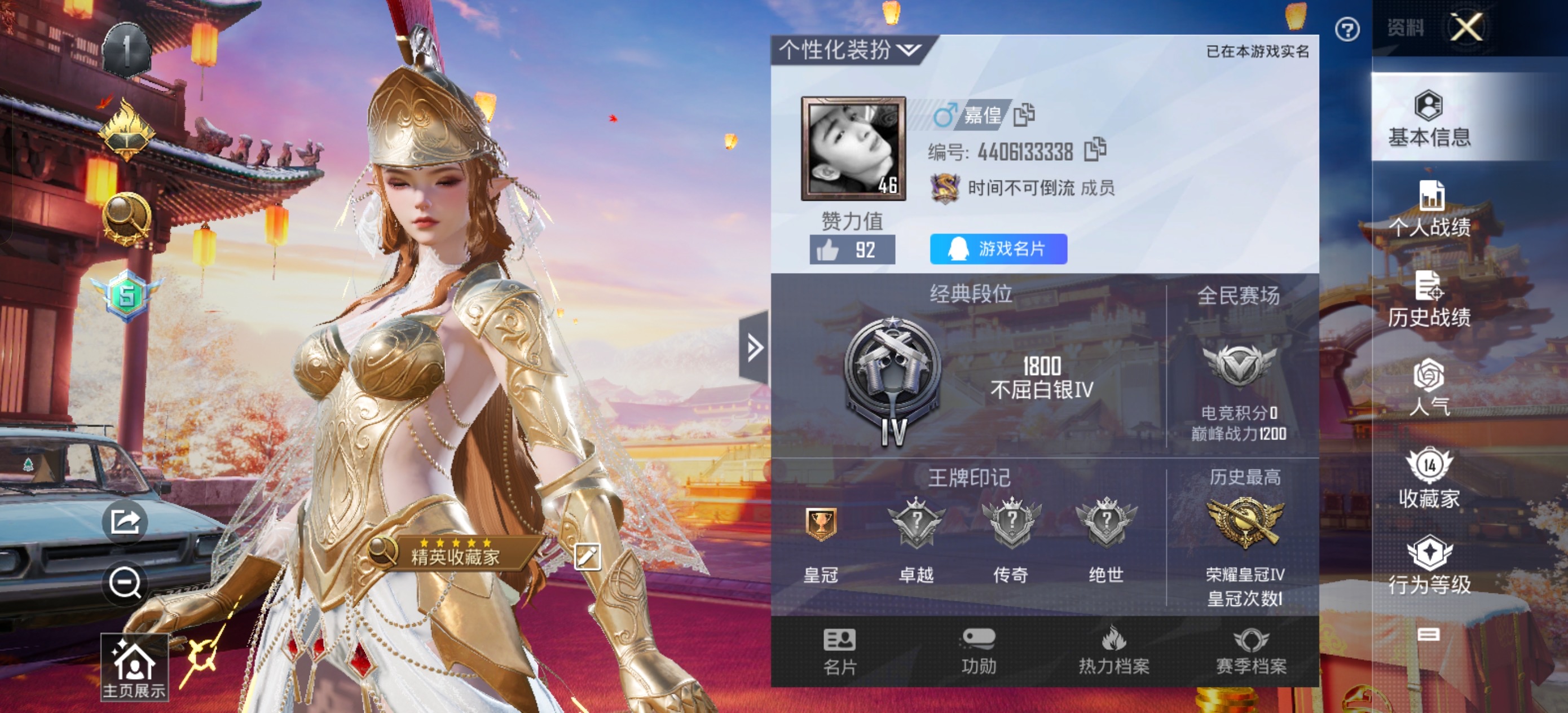 - PX_2106299-苹果QQ 历史总热力值:81601 粉装数量:4 特效枪数量:9 王牌印记:8 历史最高段位:绝世王牌16星 套装数量:192 时装数量:777 枪械数量:264 战备数量:175 装备数量:320 时装:套装-创世·救赎,套装-桃粉嫣然,角色-冷漠罗丽,角色-女娲灵识,套装-SS12特训,套装-SS13特训,套装-SS14特训,套装-SS15特训,套装-SS16特训,套装-