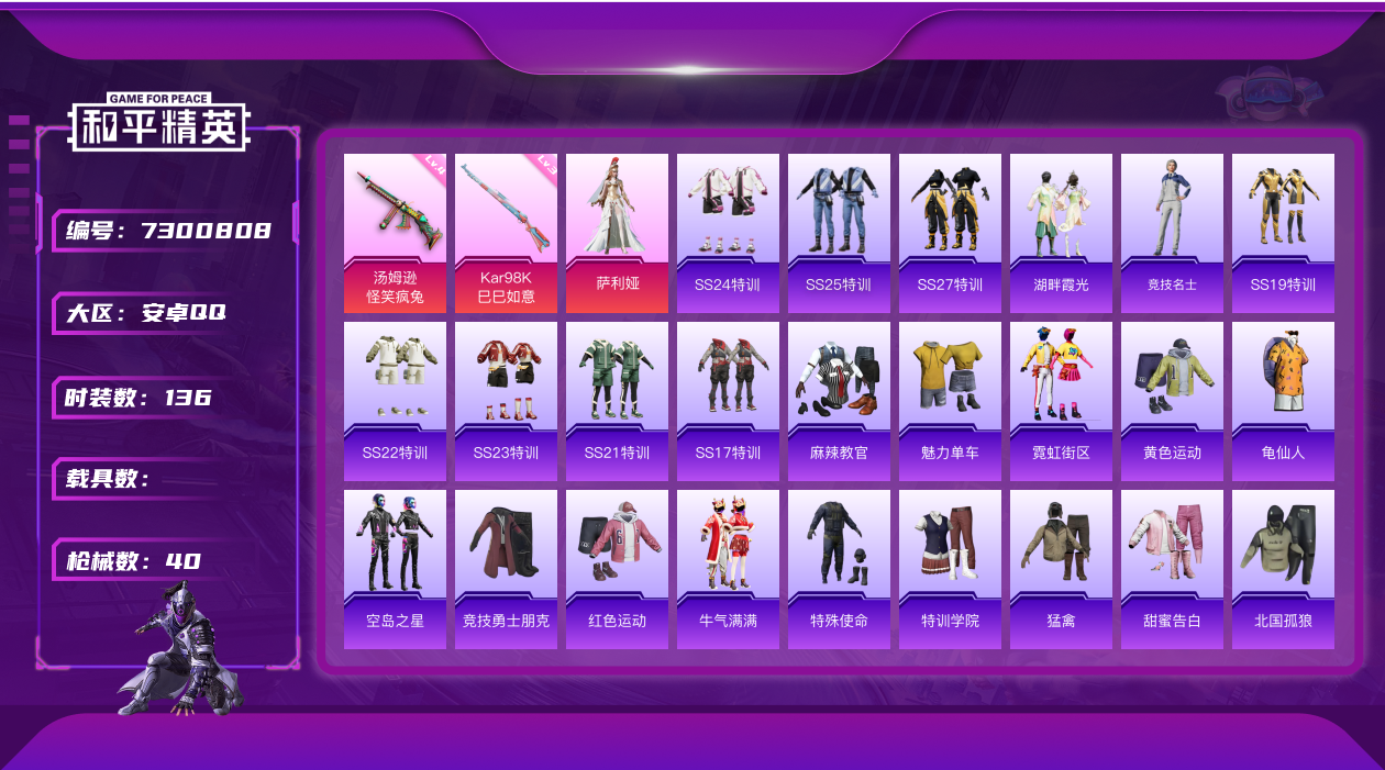 [7300808]实名: 可修改 时装数: 136 枪械数: 40 战备数: 21 热门装扮: 萨利娅 稀有枪皮: 汤姆逊怪笑疯兔,Kar98K-巳巳如意