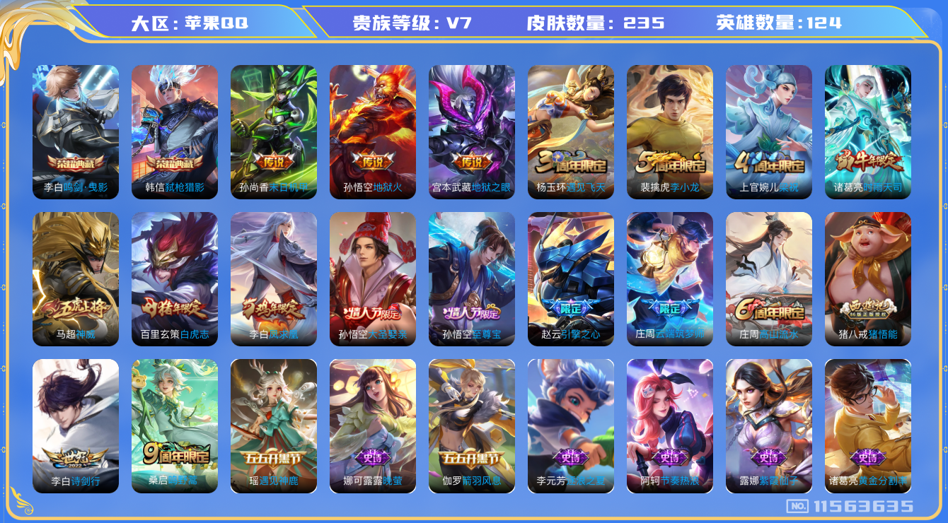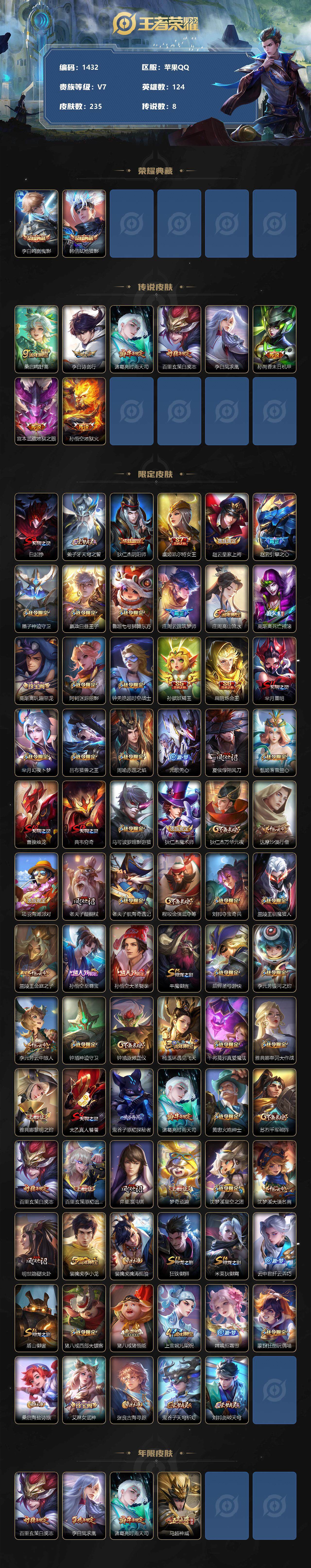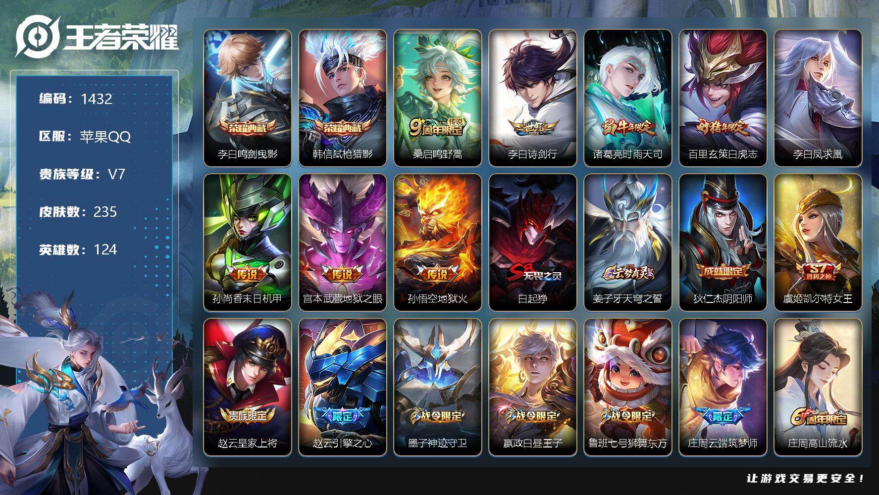 [11563635]【商品标题】:苹果Q-V7-最强王者段位-124英雄-235皮肤-2典藏-0珍品无双-0无双-0珍品传说-8传说-70史诗