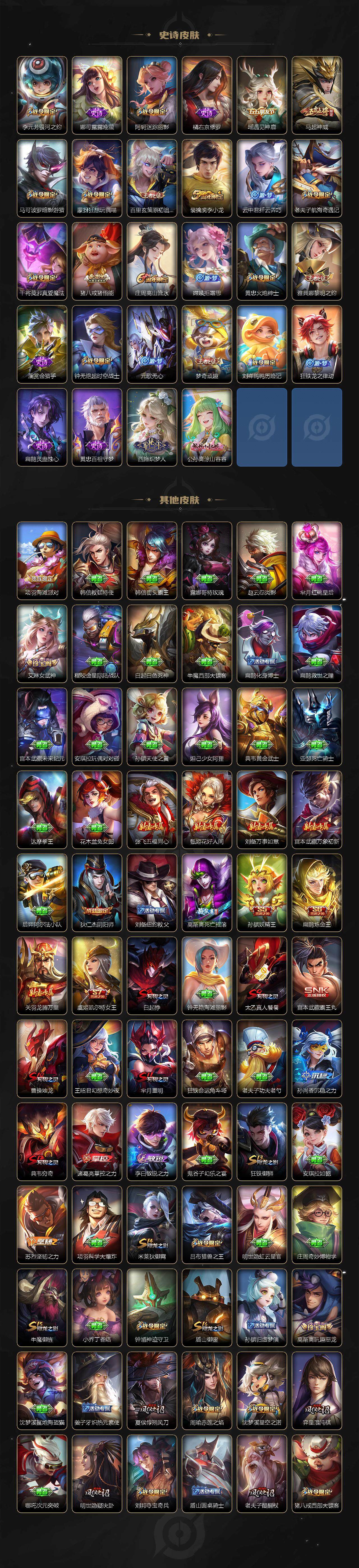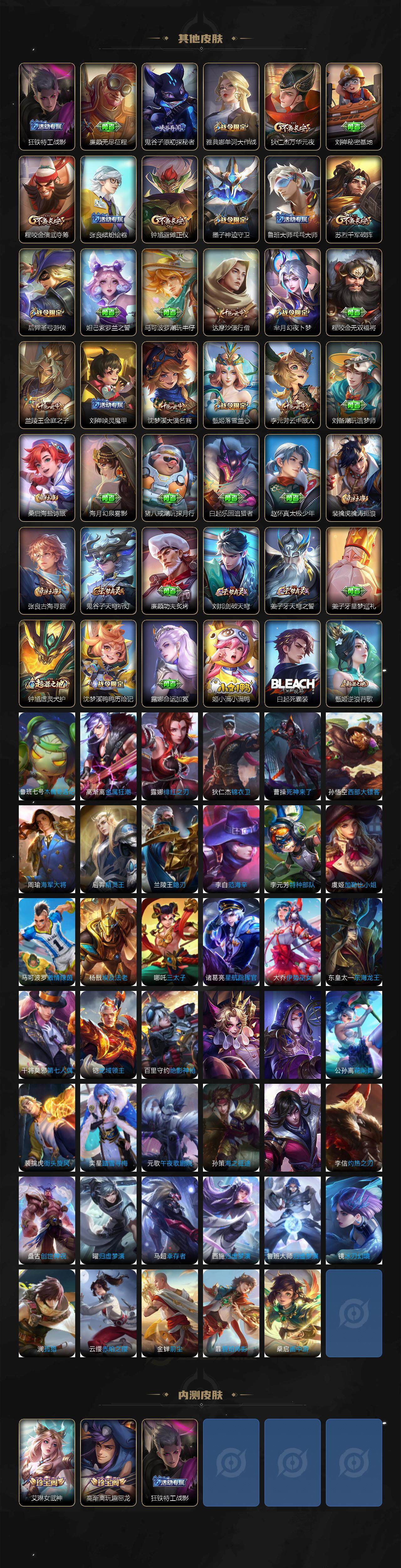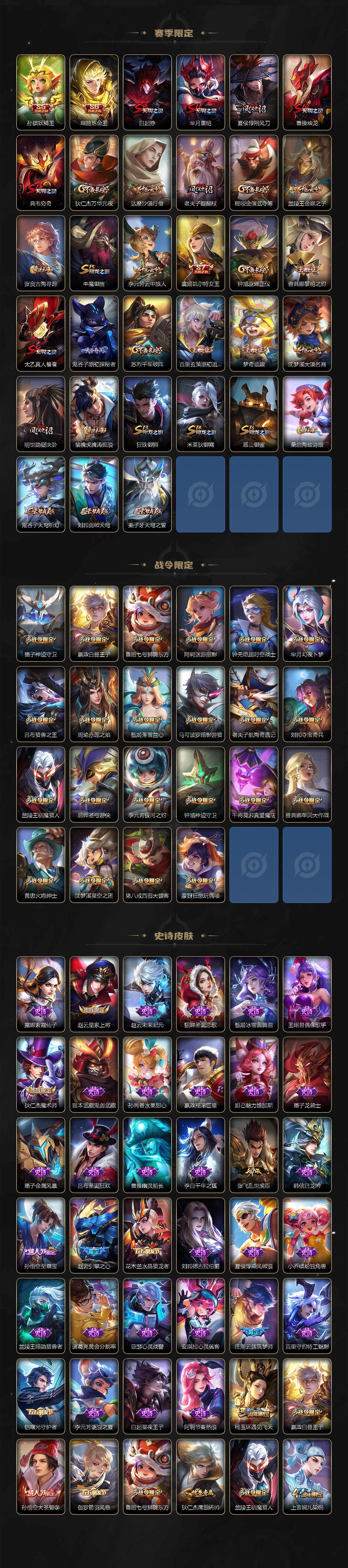 【限定皮肤】:白起狰,姜子牙天穹之誓,狄仁杰阴阳师,虞姬凯尔特女王,赵云皇家上将,赵云引擎之心,墨子神迹守卫,嬴政白昼王子,鲁班七号狮舞东方,庄周云端筑梦师,庄周高山流水,高渐离死亡摇滚,高渐离玩趣恶龙,阿轲迷踪丽影,钟无艳超时空战士,孙膑妖精王,扁鹊炼金王,芈月重明,芈月幻夜卜梦,吕布猎兽之王,周瑜赤莲之焰,元歌无心,夏侯惇朔风刀,甄姬落雪兰心,曹操烛龙,典韦穷奇,马可波罗暗影游猎,狄仁杰魔术师,狄仁杰万华元夜,达摩沙漠行僧,项羽海滩派对,老夫子醍醐杖,老夫子航海奇遇记,程咬金演武夺筹,刘邦夺宝奇兵,兰陵王驯魔猎人,兰陵王金庭之子,孙悟空至尊宝,孙悟空大圣娶亲,牛魔御旌,后羿圣弓游侠,李元芳银河之约,李元芳云中旅人,钟馗神迹守卫,钟馗驱傩正仪,杨玉环遇见飞天,干将莫邪真爱魔法,雅典娜单词大作战,雅典娜黎明之约,太乙真人饕餮,鬼谷子原初探秘者,诸葛亮时雨天司,黄忠火炮绅士,苏烈千军破阵,百里玄策白虎志,百里玄策原初追逐者,弈星混沌棋,梦奇顽趣,沈梦溪星空之诺,沈梦溪大漠名商,明世隐疑决卦,裴擒虎李小龙,裴擒虎擒涛扼浪,狂铁御狮,米莱狄御霄,云中君纤云弄巧,盾山御銮,猪八戒西部大镖客,猪八戒猪悟能,上官婉儿梁祝,嫦娥拒霜思,蒙犽狂想玩偶喵,桑启海盐诗旅,艾琳女武神,张良古海寻踪,鬼谷子天穹祈灯,刘邦剑破天穹