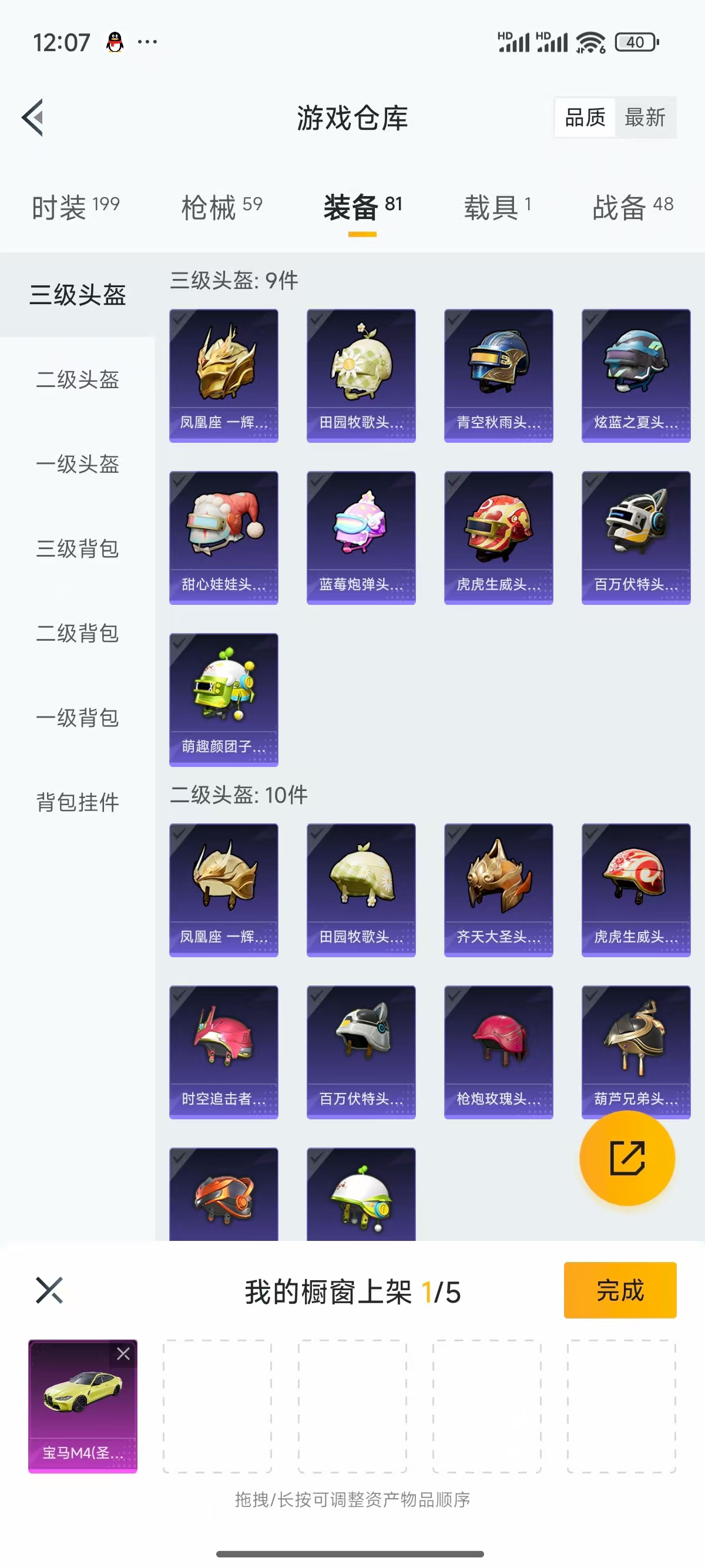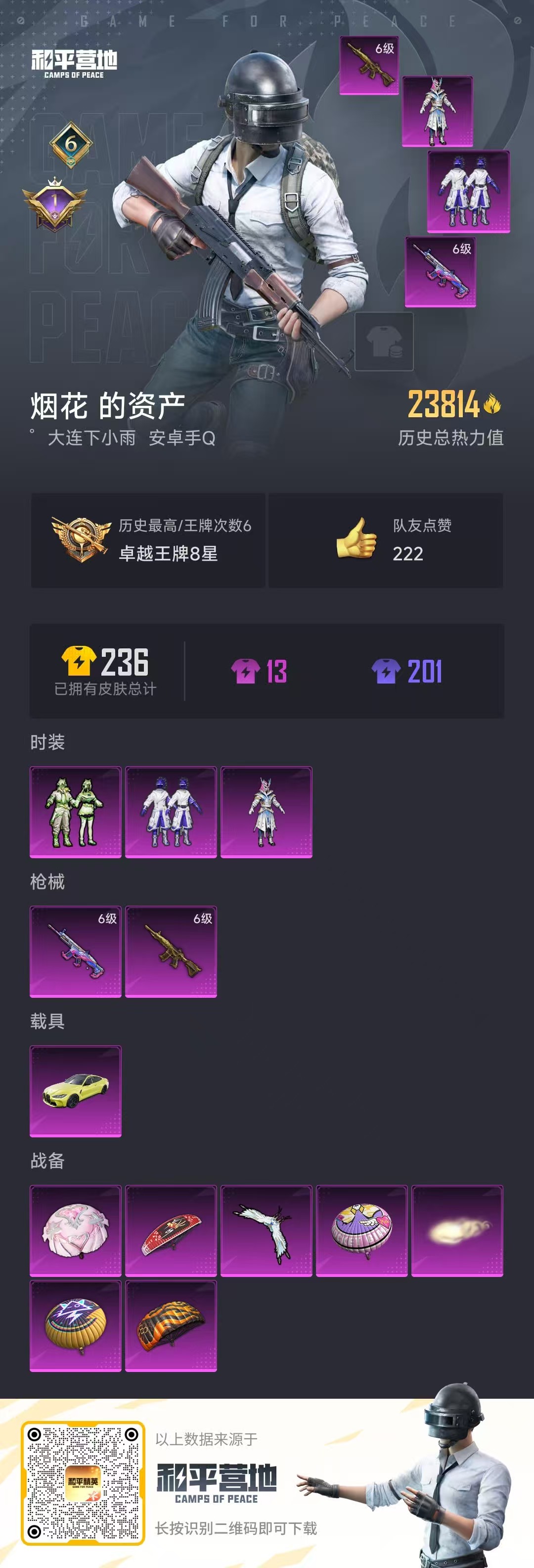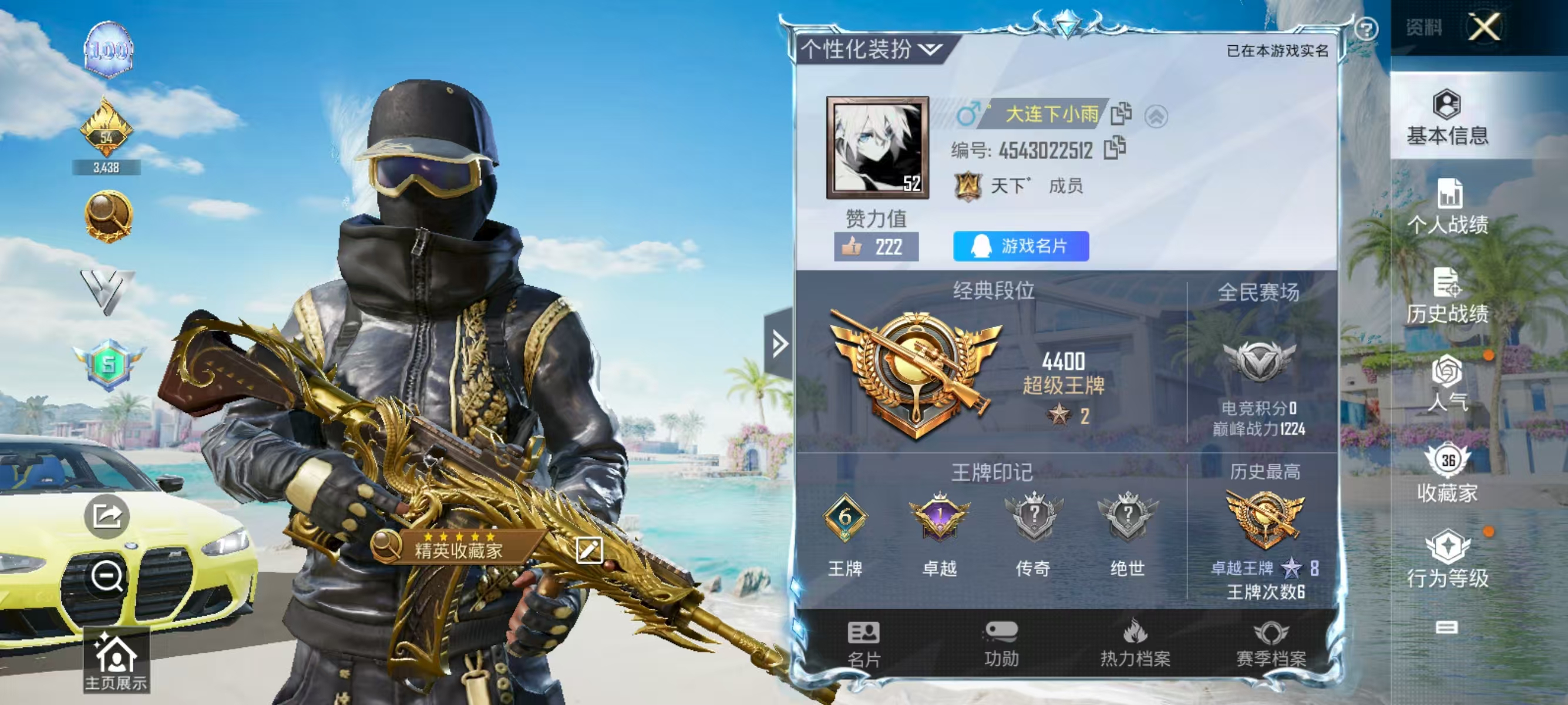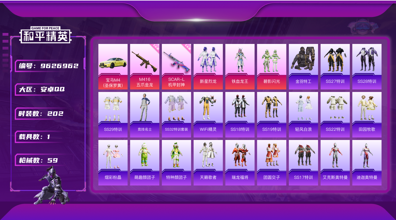 [9626962]实名: 不可修改 时装数: 202 载具数: 1 枪械数: 59 战备数: 48 热门装扮: 新星烈龙,铁血龙王,碧影闪光 载具: 宝马M4(圣保罗黄) 稀有枪皮: M416五爪金龙,SCAR-L机甲封神
