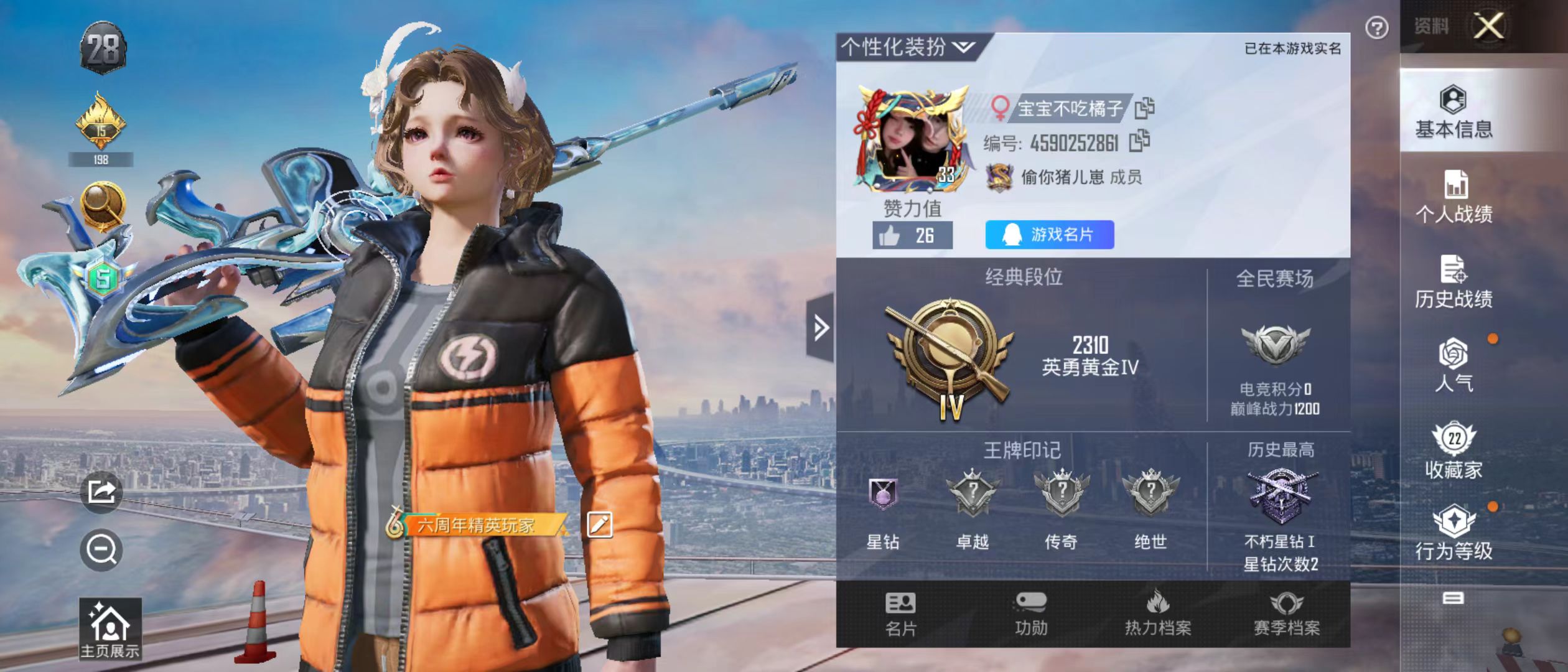 [8562809]实名: 可修改 时装数: 134 枪械数: 45 战备数: 29 热门装扮: 时空协奏·心弦,未来领航者 稀有枪皮: Kar98K-巳巳如意,M200-伏羲圣卦