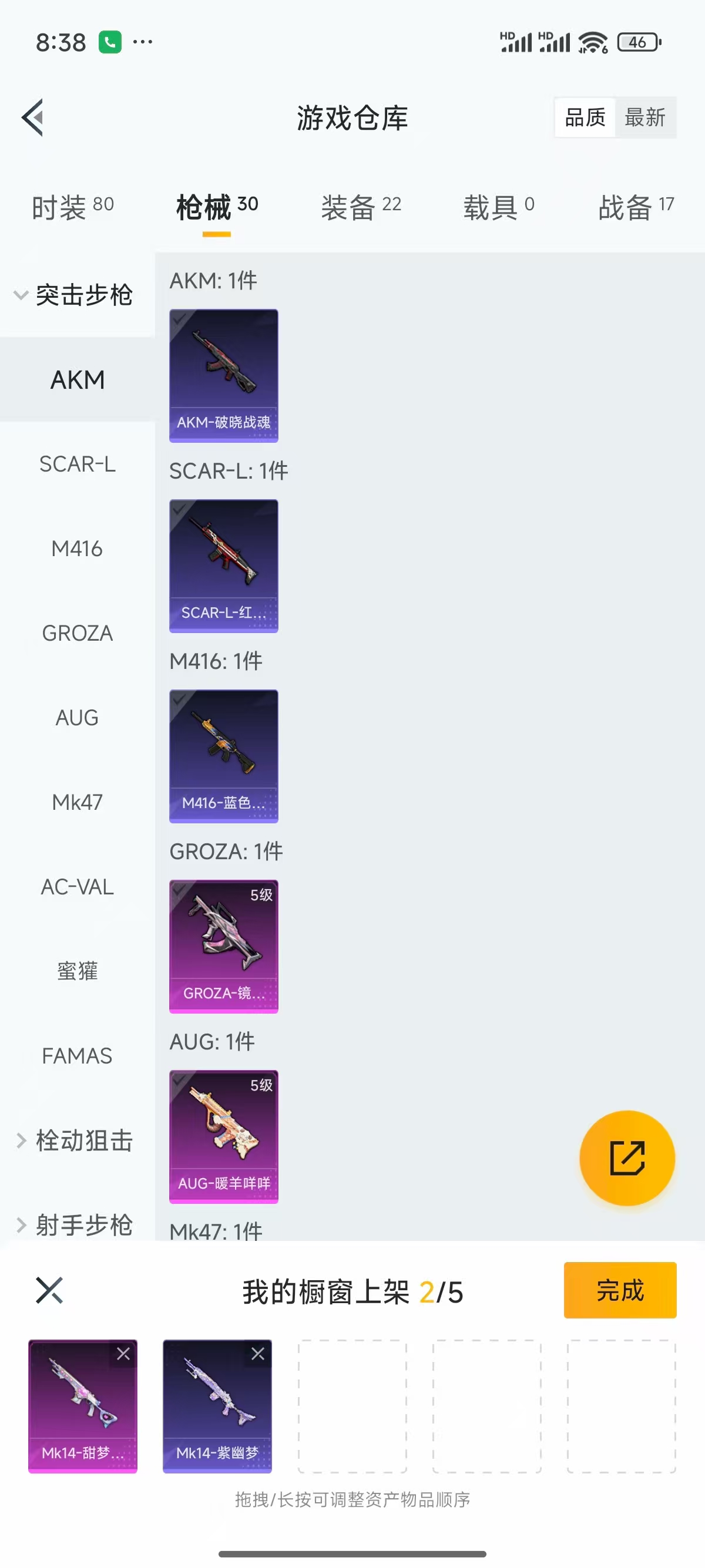 [9909181]实名: 不可修改 时装数: 80 枪械数: 30 战备数: 17 稀有枪皮: GROZA-镜光银凌,Kar98K-巳巳如意,AUG-暖羊咩咩,MK14-甜梦熊击